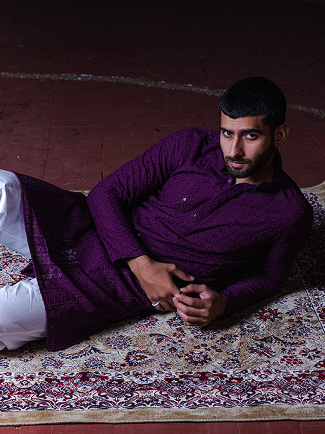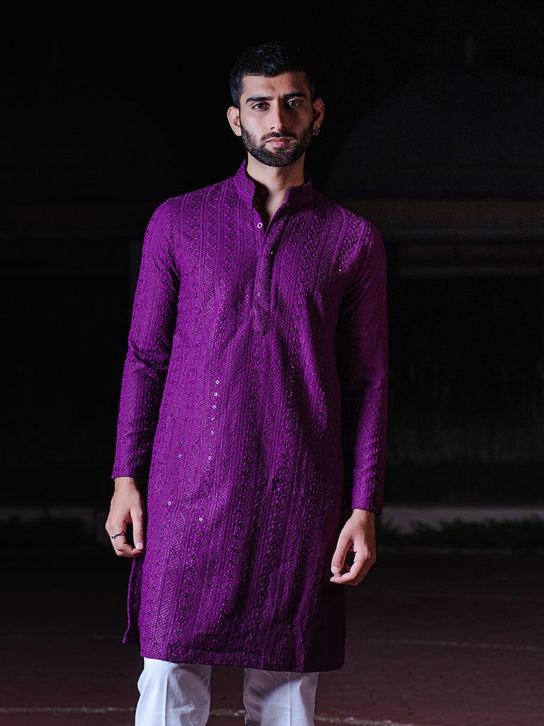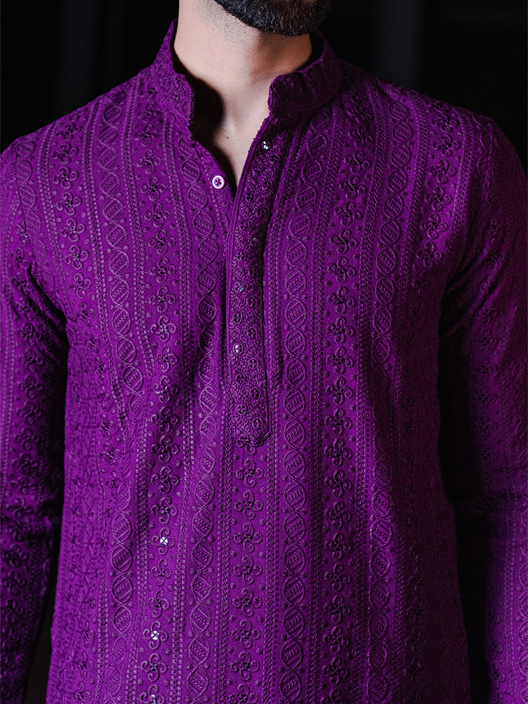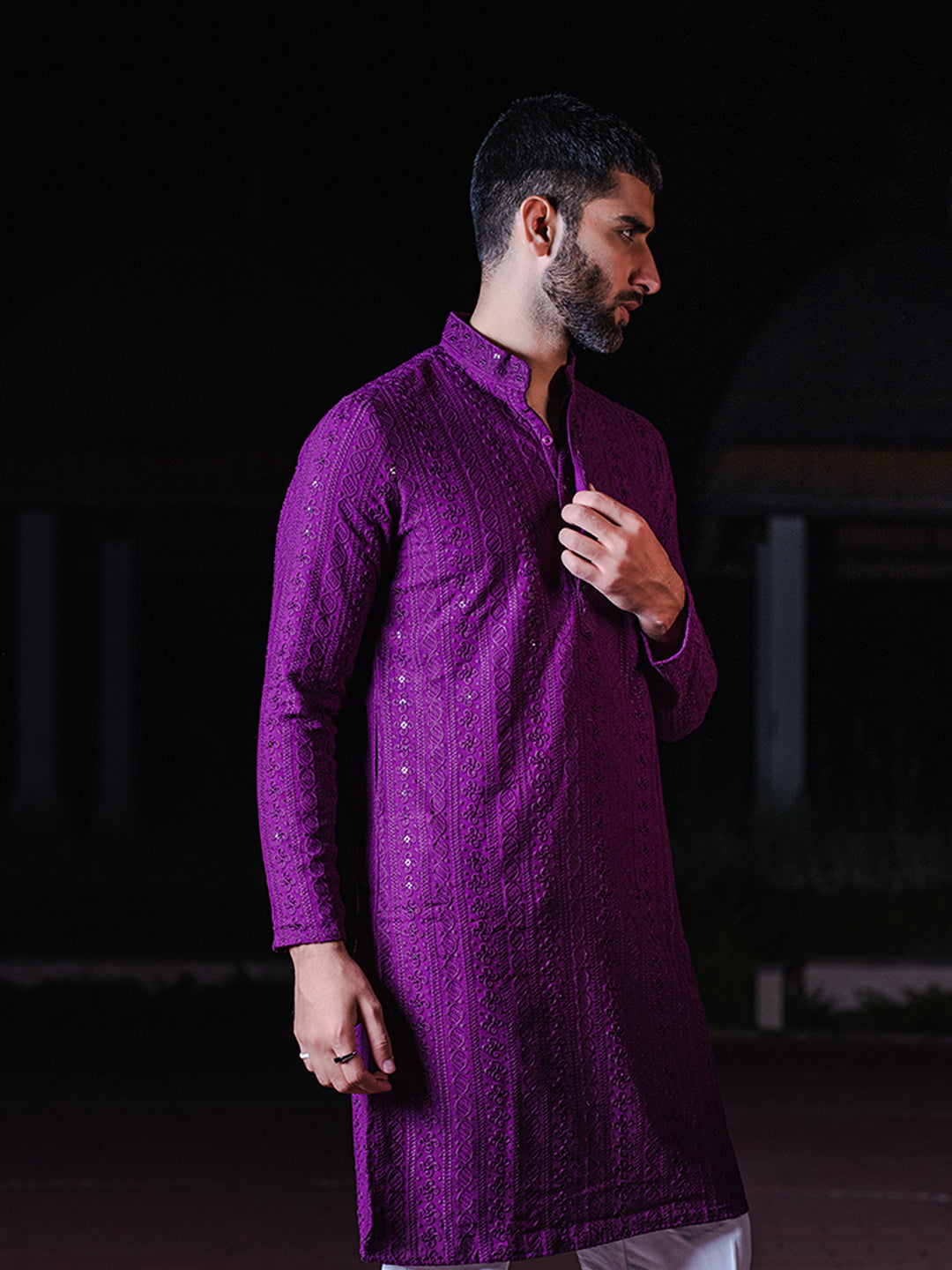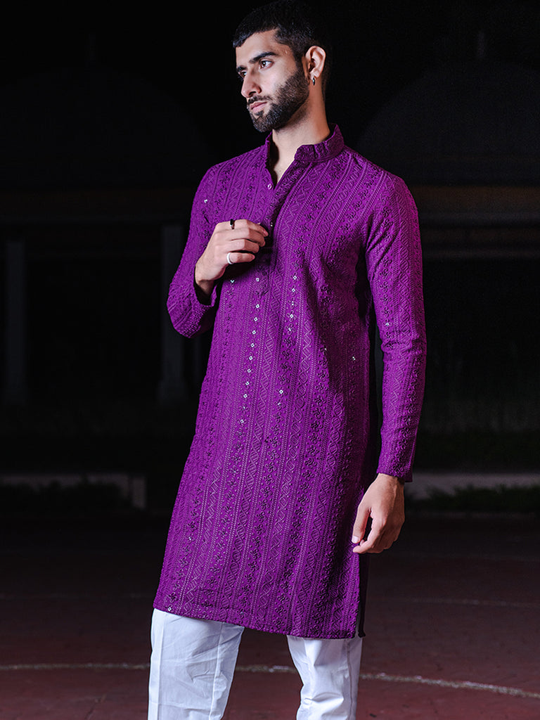 About the product- If you are a fan of bold colour, Dark Purple Chikankari Embroidered Cotton Men's Kurta is finally here to complete your traditional wardrobe! Made of cotton fabric, this kurta will make you look classy and festive ready!