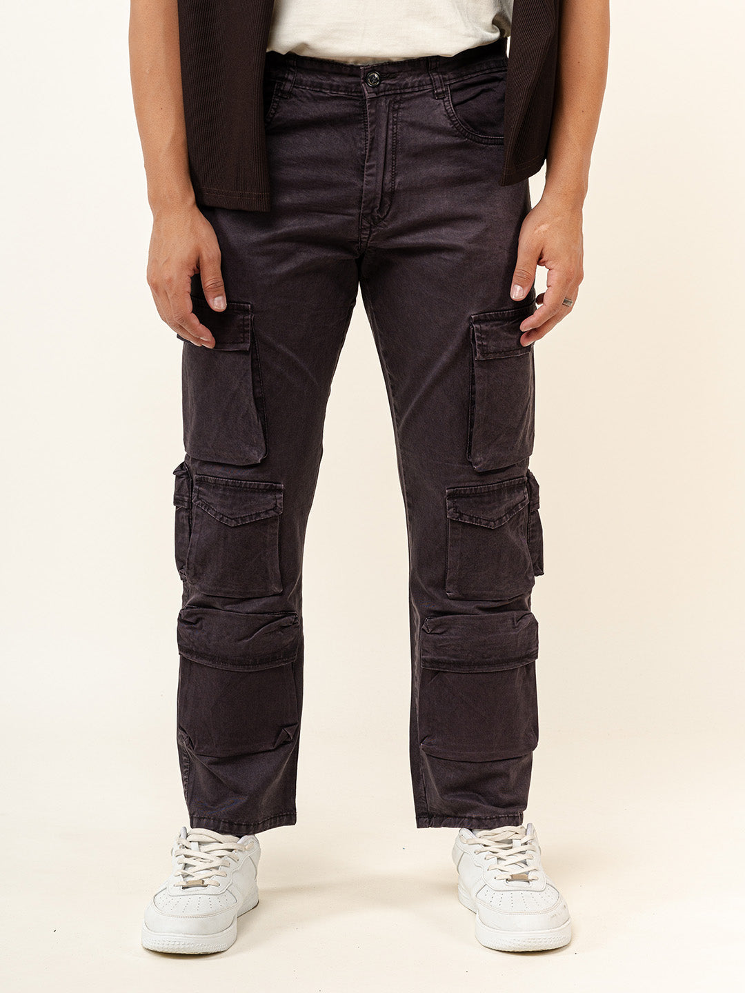 About the product: Dark Purple Flared Straight Fit Cargo Pants for Men, Made with Cotton.