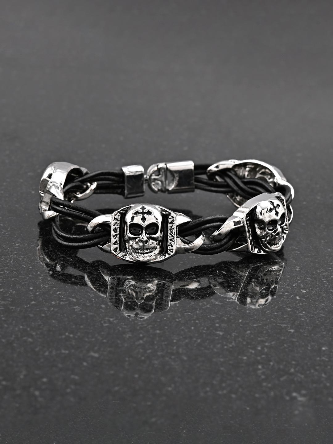 About the Product: Embrace a bold and edgy aesthetic with the 4 Skull Style with Round Back Icon Links Men's Bracelet. This striking piece features four intricately detailed skull links, each with a rounded back for a comfortable fit. The bracelet is connected by durable black cords, adding to its rugged appeal. The central rectangular piece showcases fine craftsmanship, making this bracelet a unique and standout accessory.