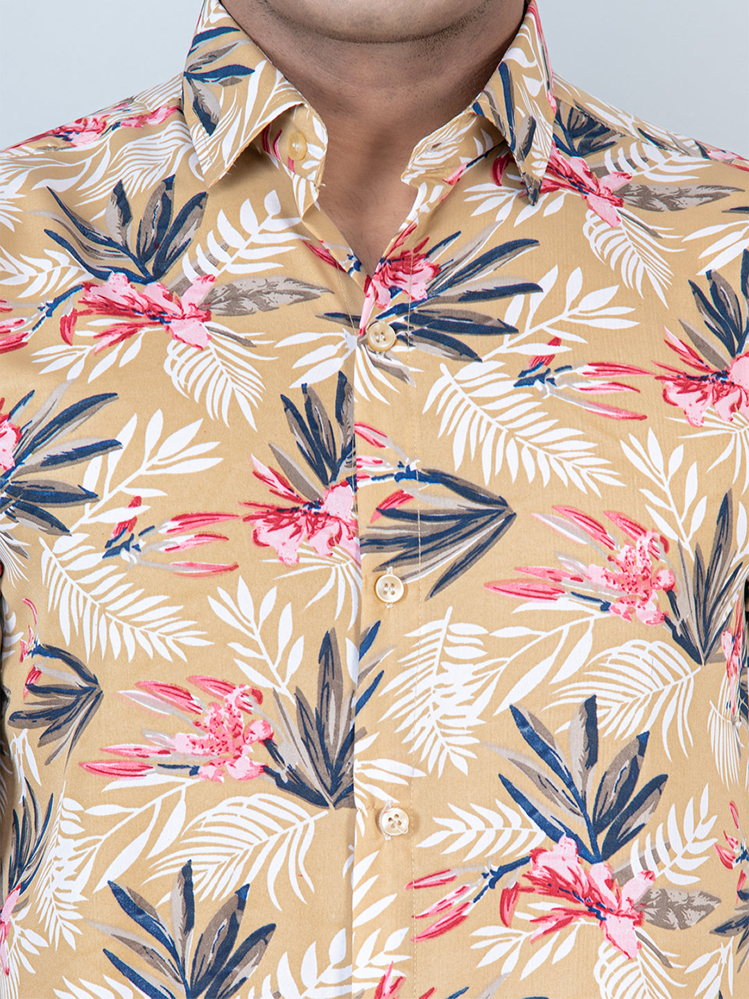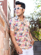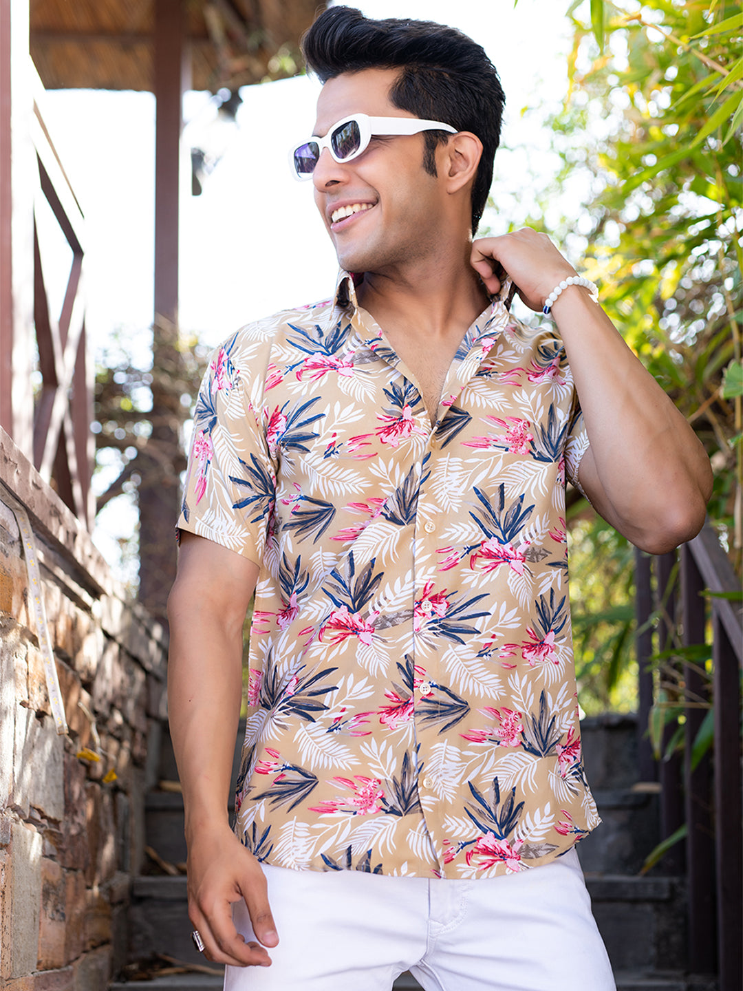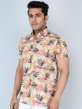 About the product- This Beige Tropical Printed Half Sleeves Crepe Shirt is made to make you look smart, this comfortable shirt is your wardrobe essential which gives a stunning look while wearing.