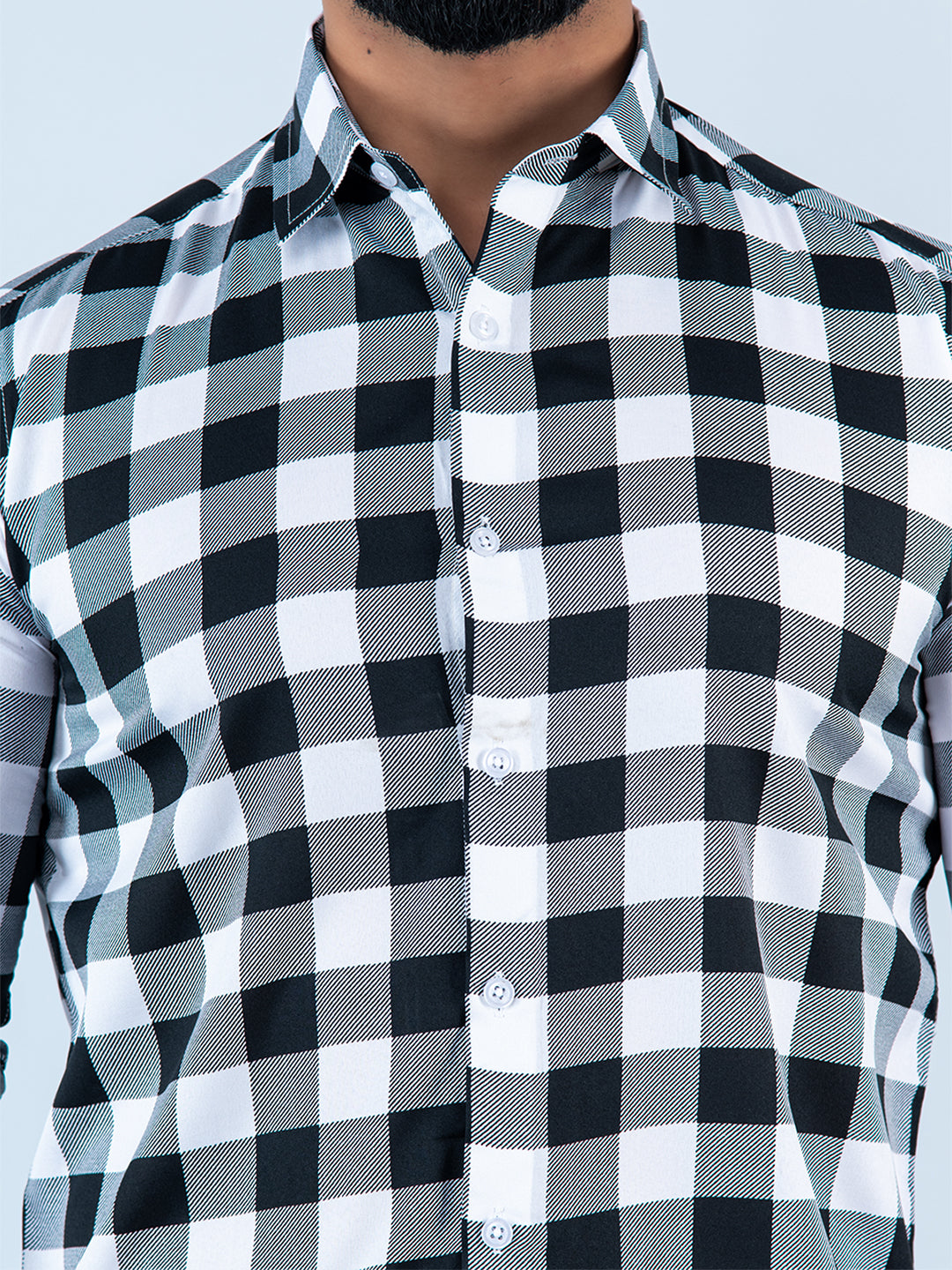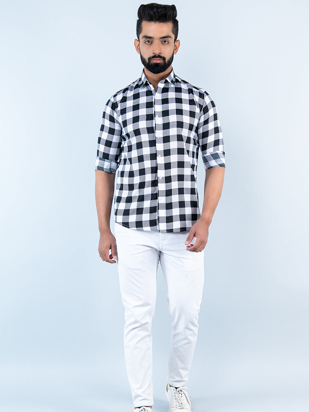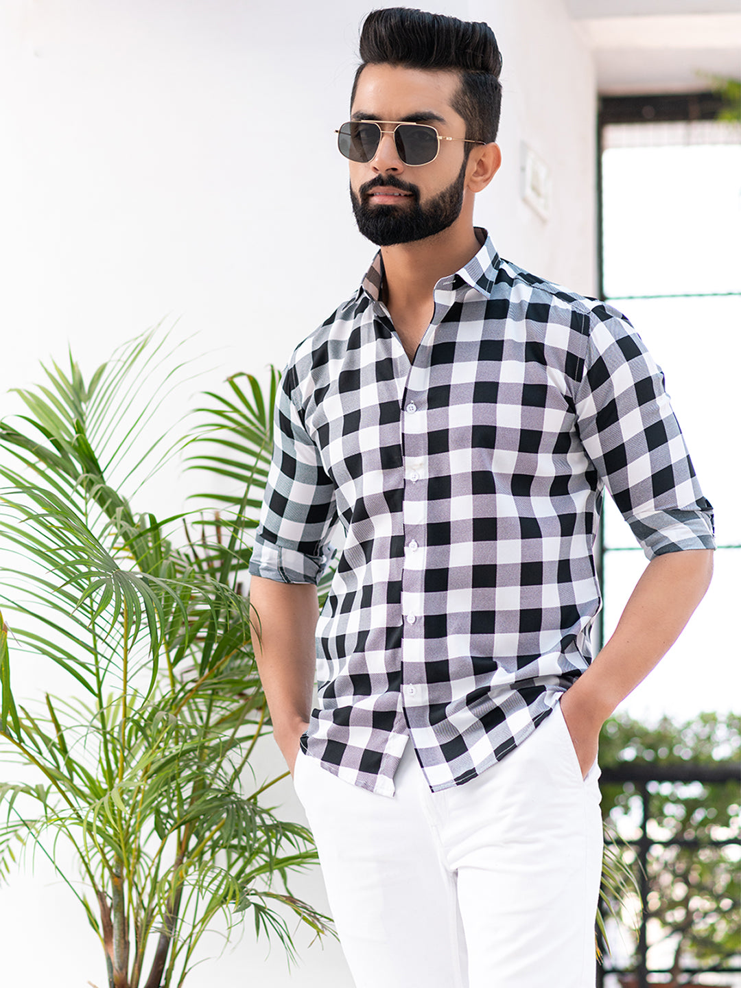About The Product- Wear this Black and White Crepe Full Sleeve Check Shirt for men to get a minimal or wholly formal look. This comfortable shirt is suitable for every wardrobe