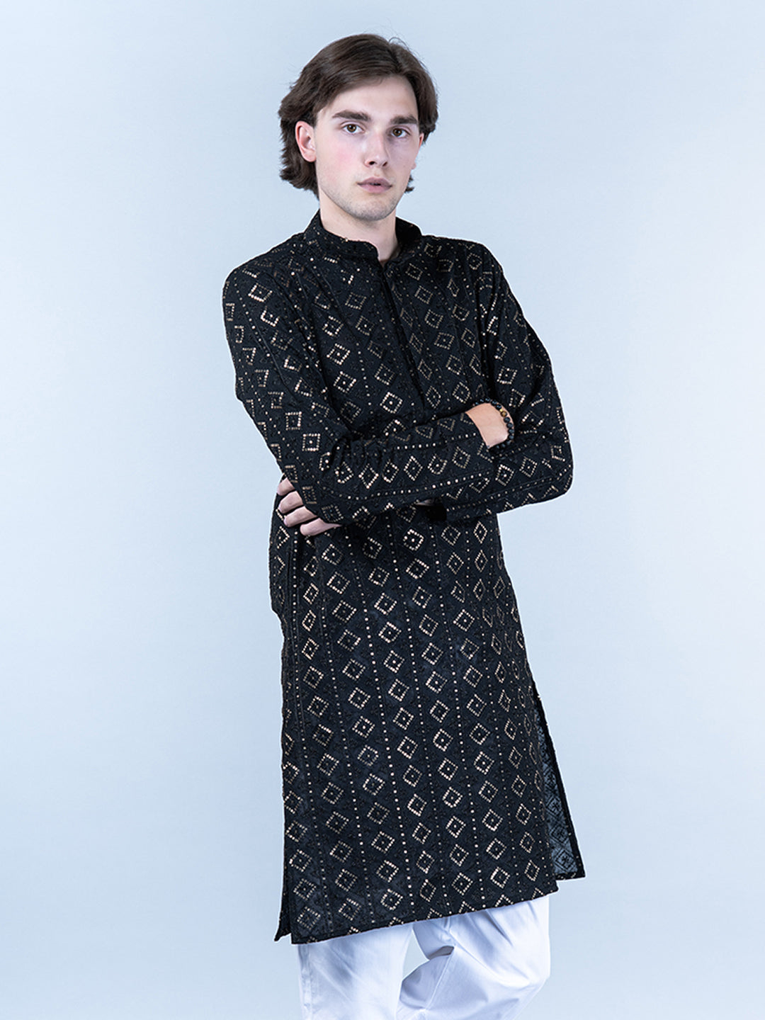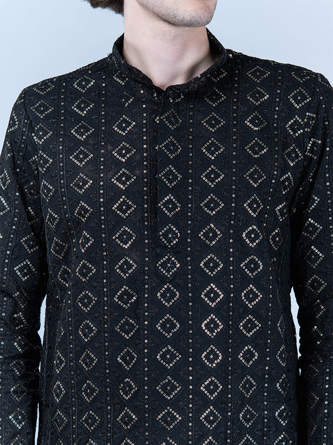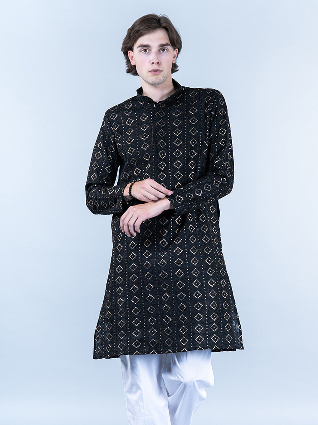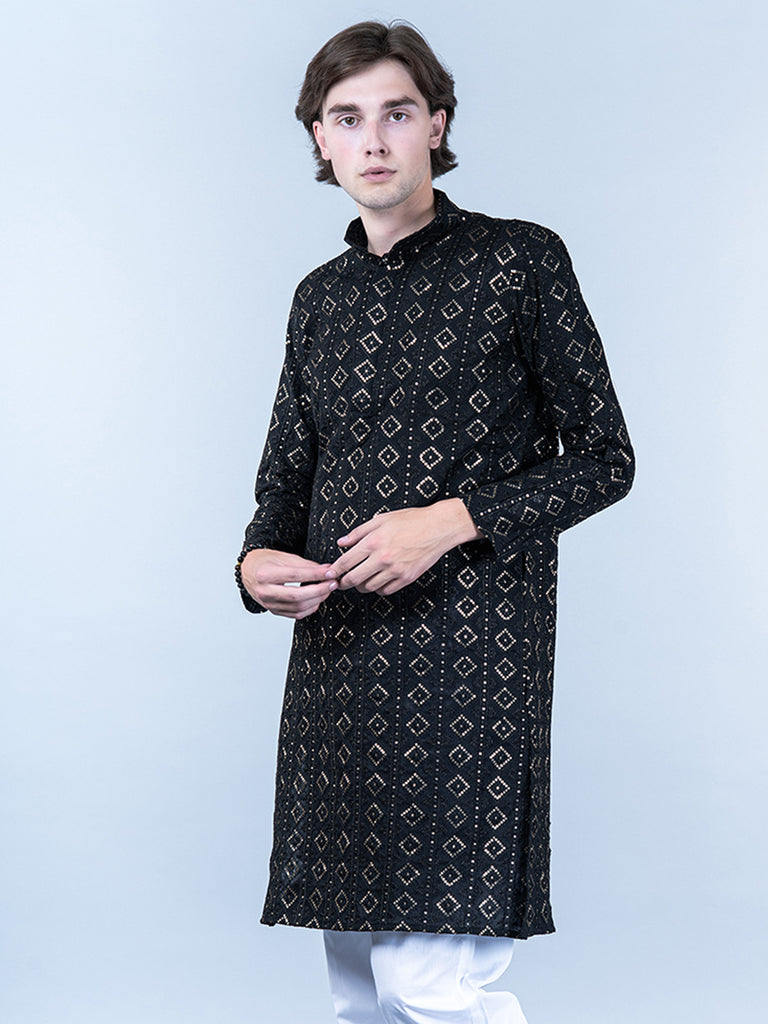 About the product- This Black Diamond Embroidered Cotton Mens Kurta is lightweight and comfortable. This full-sleeve kurta is all set to take your style to the next level.