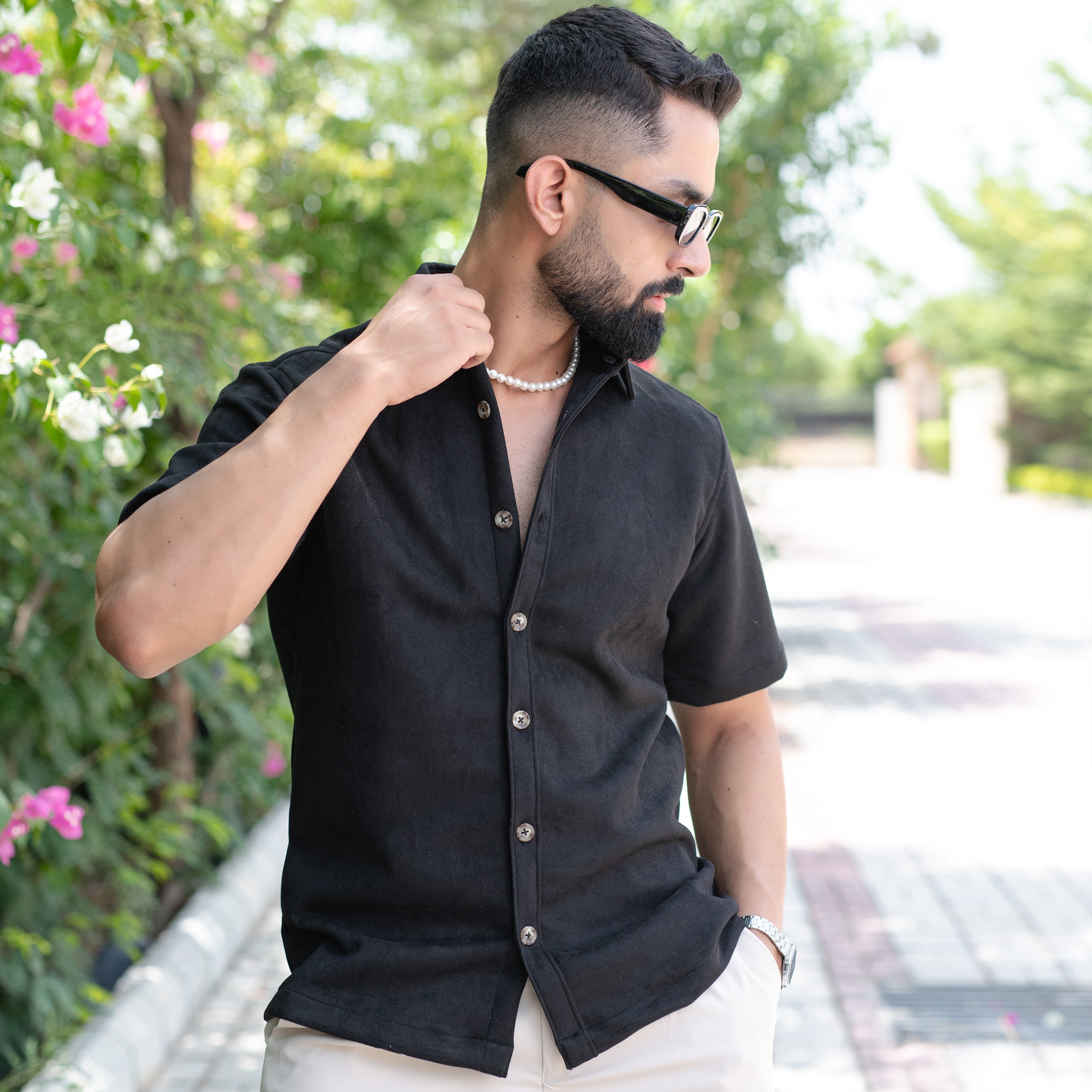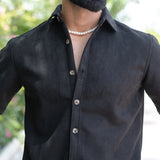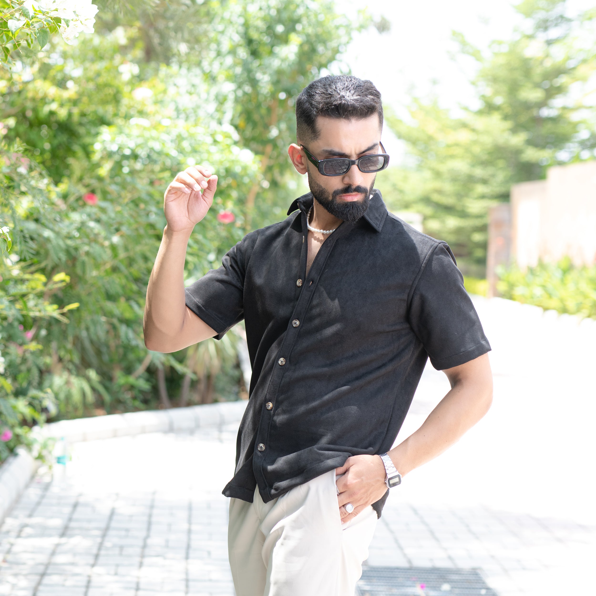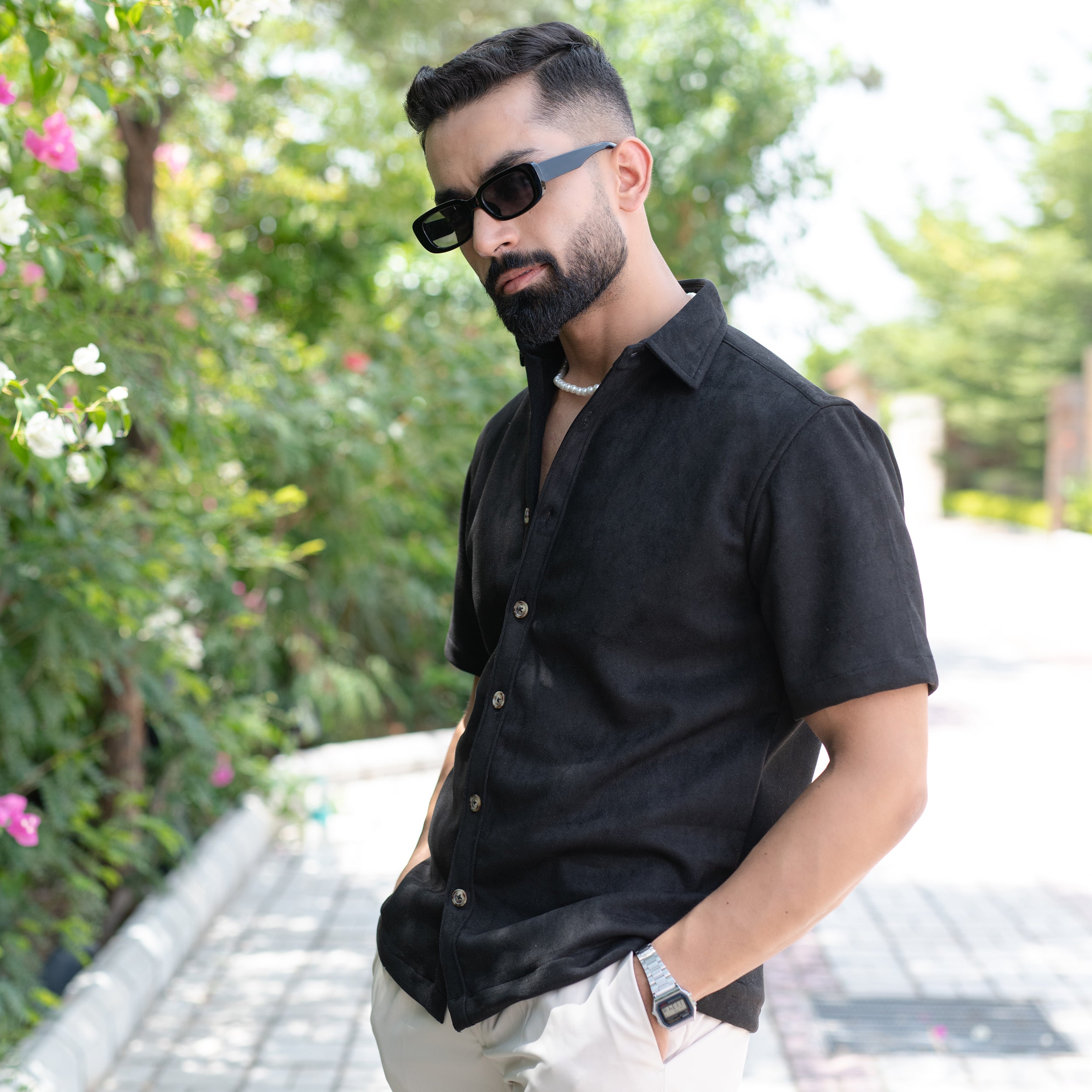 About Product- : Exemplify urban chic in this black suede oversized shirt, a versatile staple for any fashion-forward wardrobe.