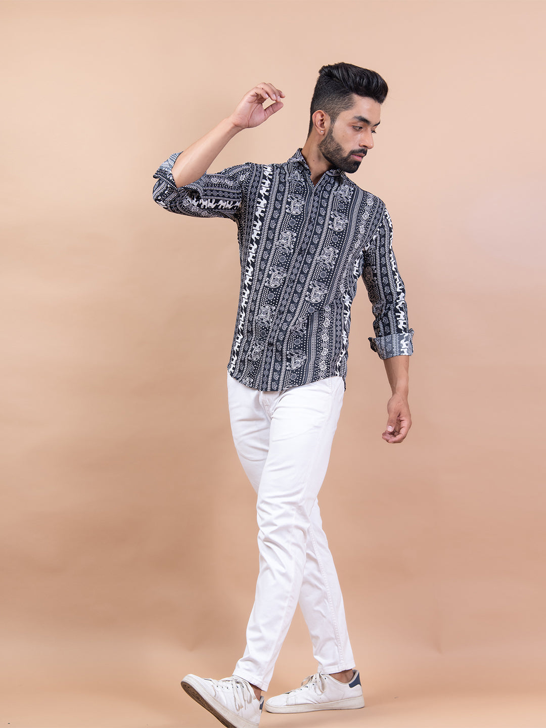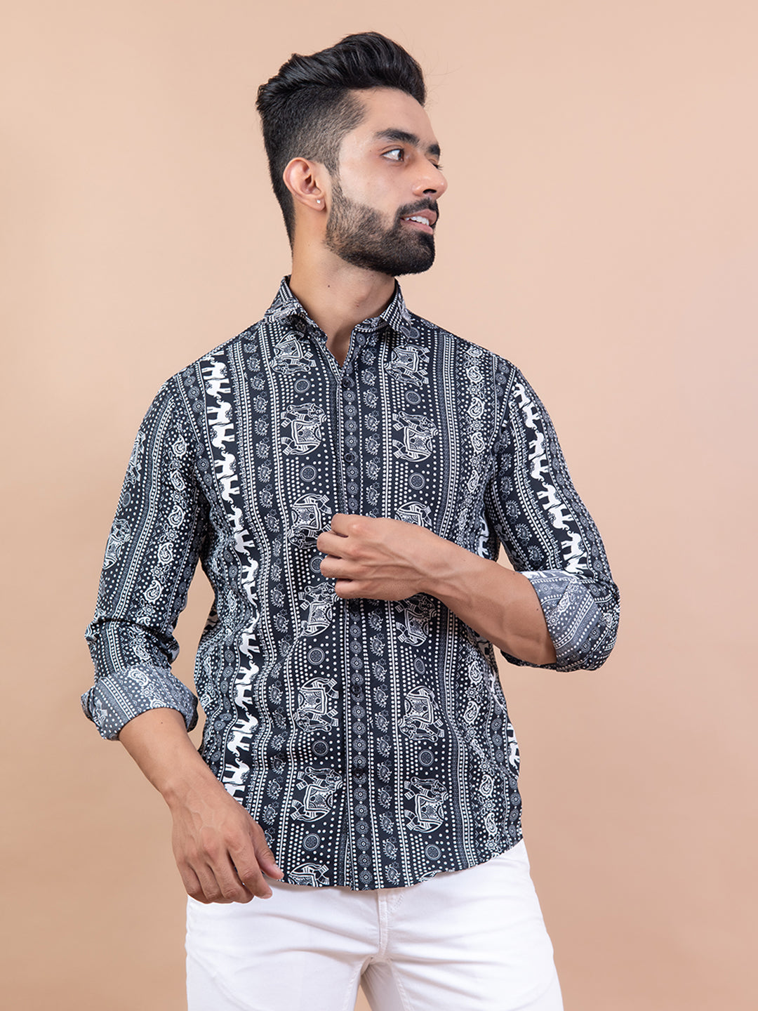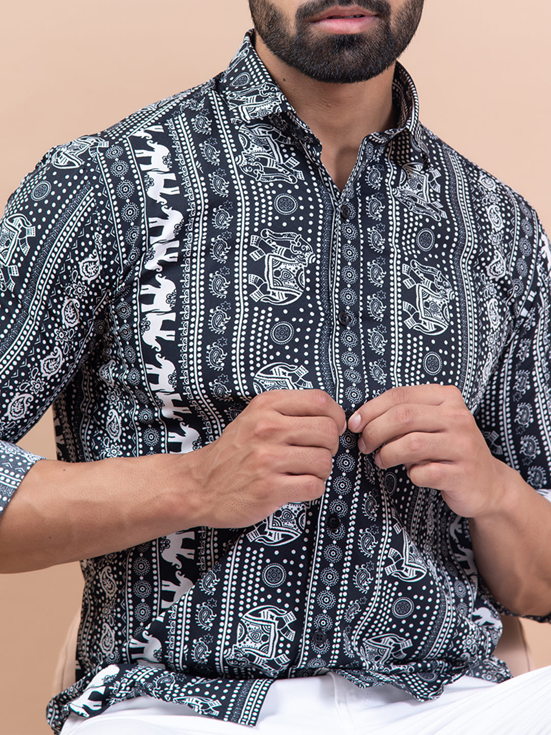 About the product- This Black & White Ethnic Elephant Printed Full Sleeve Shirt is made to make you look stunning, offering a range of lifestyle essentials that help you look good every day.