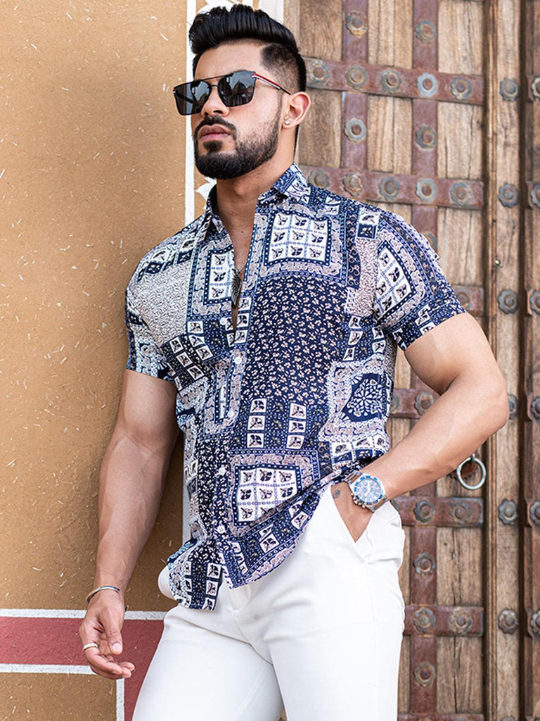 About the product: This Blue Bandana Floral Printed Half Sleeves Crepe Shirt is made to make you look smart. This comfortable shirt is definitely a must in your wardrobe.