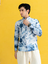 About the product- This stylish shirt for men enhances your look while wearing, enjoy the casual smart look by wearing a Blue tie and dye Chinese collar shirt made to refresh your wardrobe.
