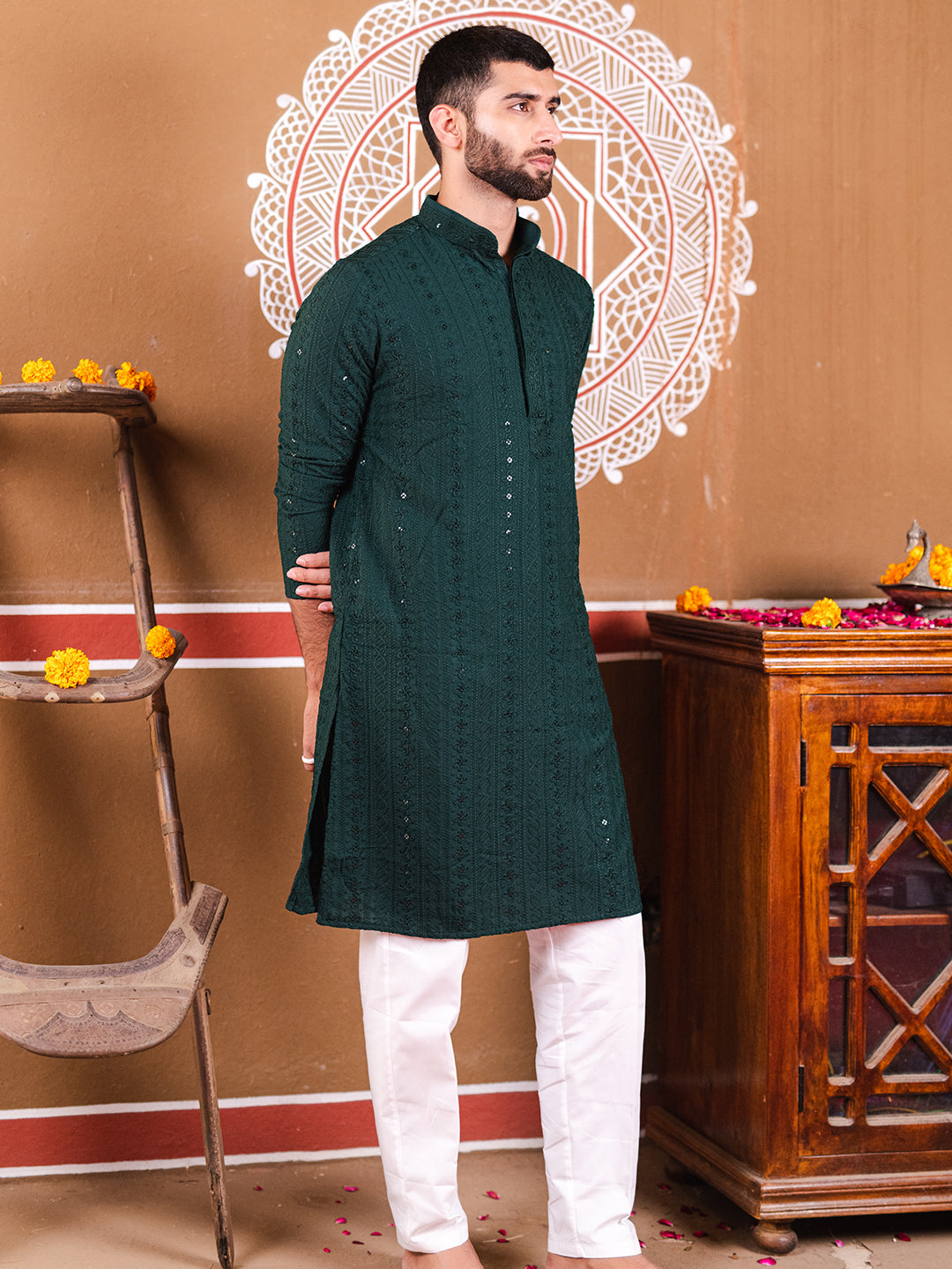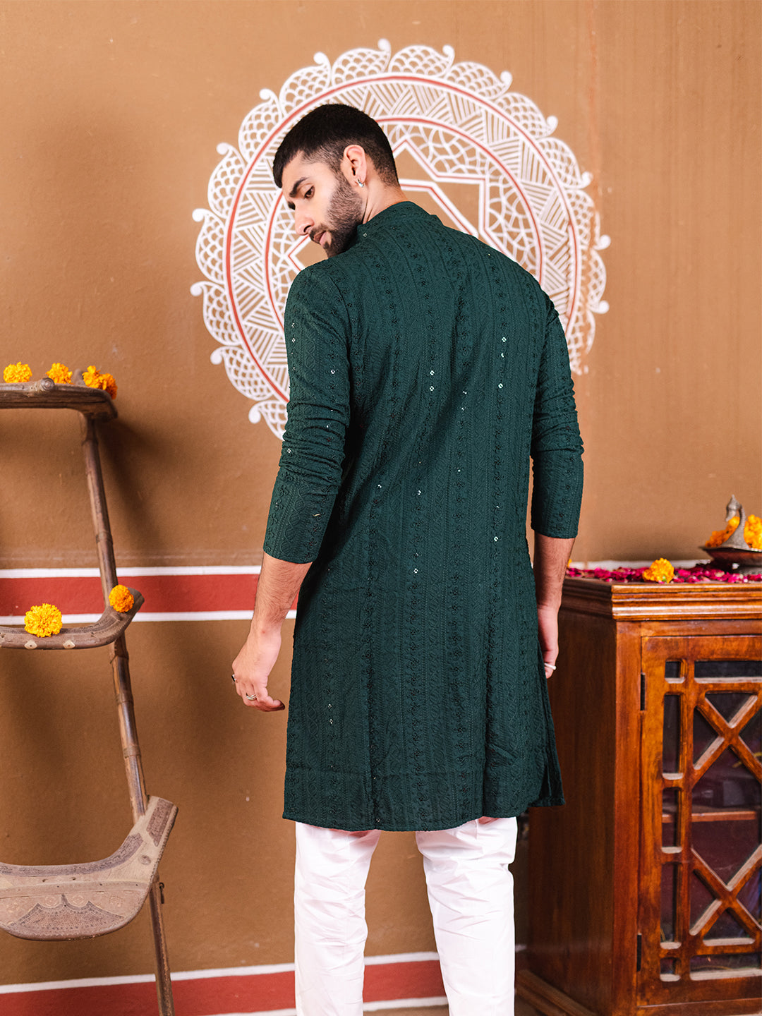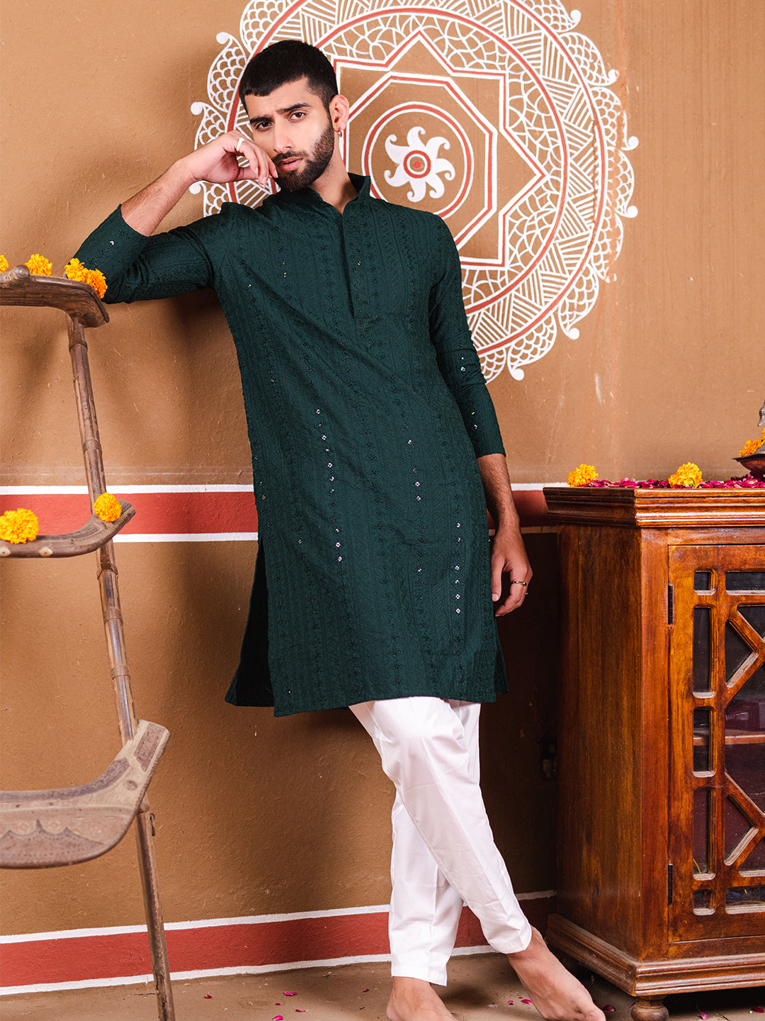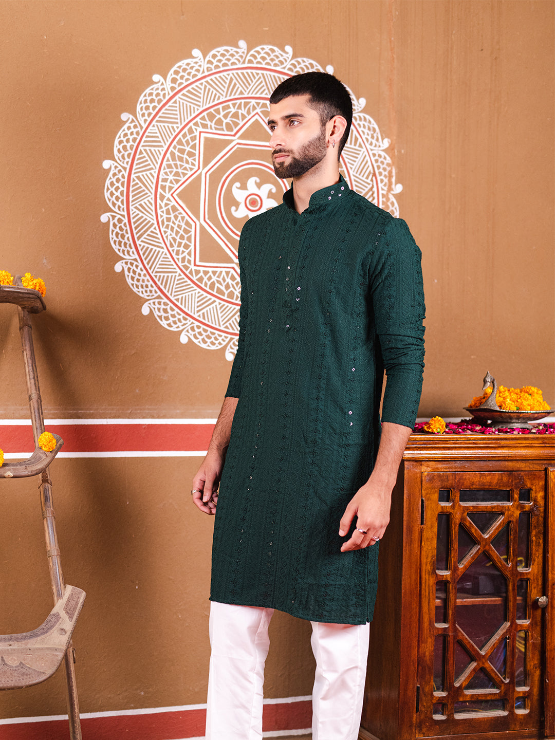 About the product- This Bottle Green Chikankari Embroidered Cotton Men's Kurta is one of the best colours of our exclusive collection! The comfotable fabric providesshear comfort and its unique colour and design makes you stand out of the crowd!