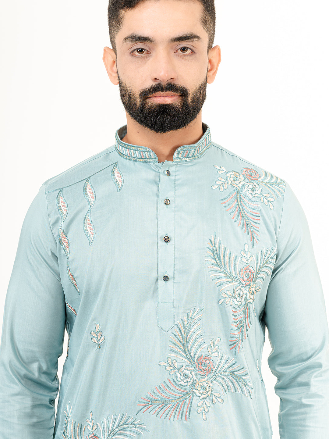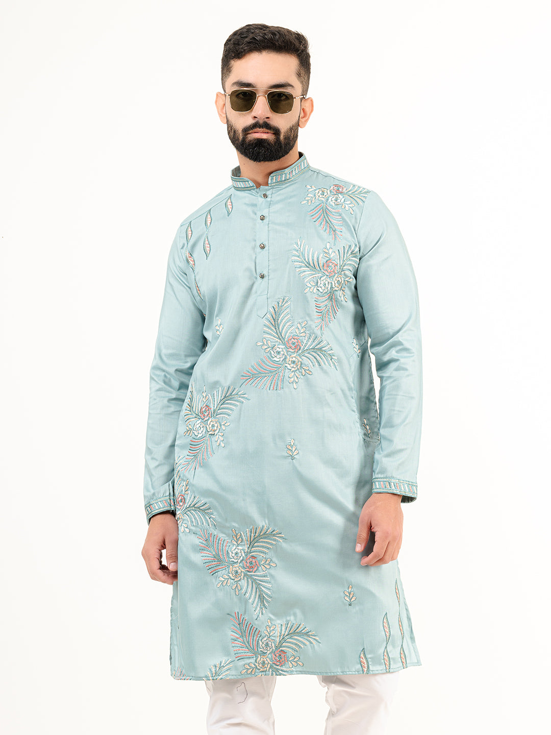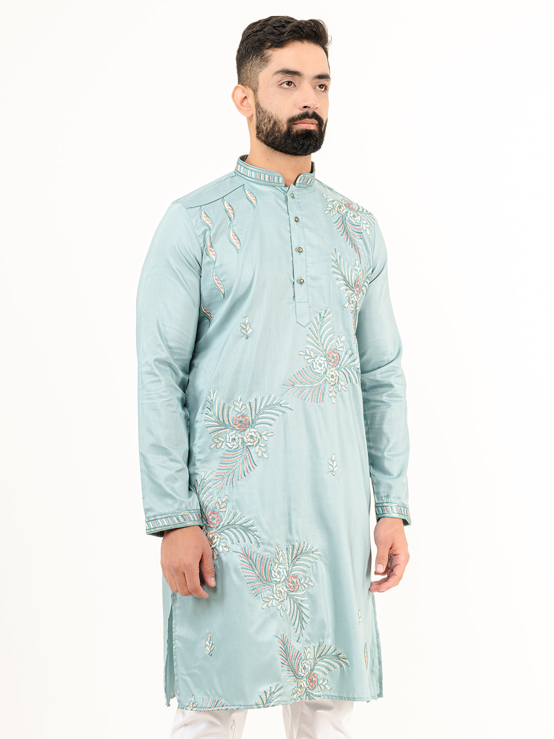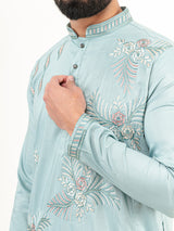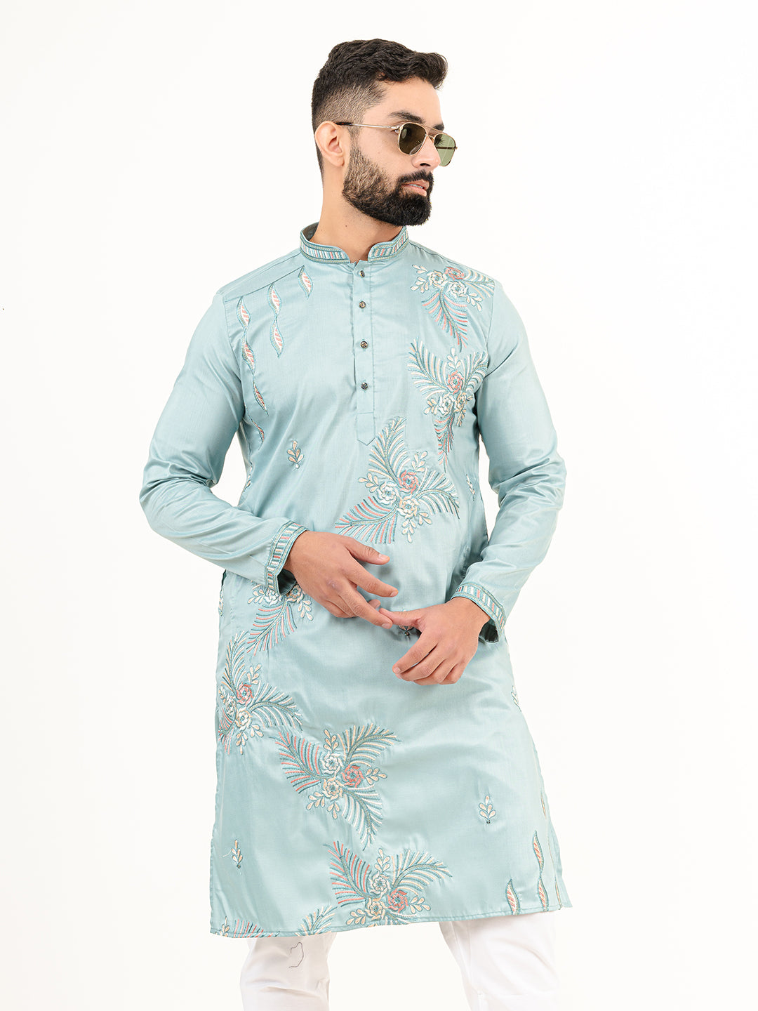 Step into elegance with this Cadet Blue Floral Silk Embroidered Kurta for Men. The vibrant Cadet Blue hue combined with intricate floral embroidery adds a touch of sophistication and class to your ethnic wardrobe. Crafted from luxurious silk fabric, this kurta is perfect for showcasing timeless style and comfort.