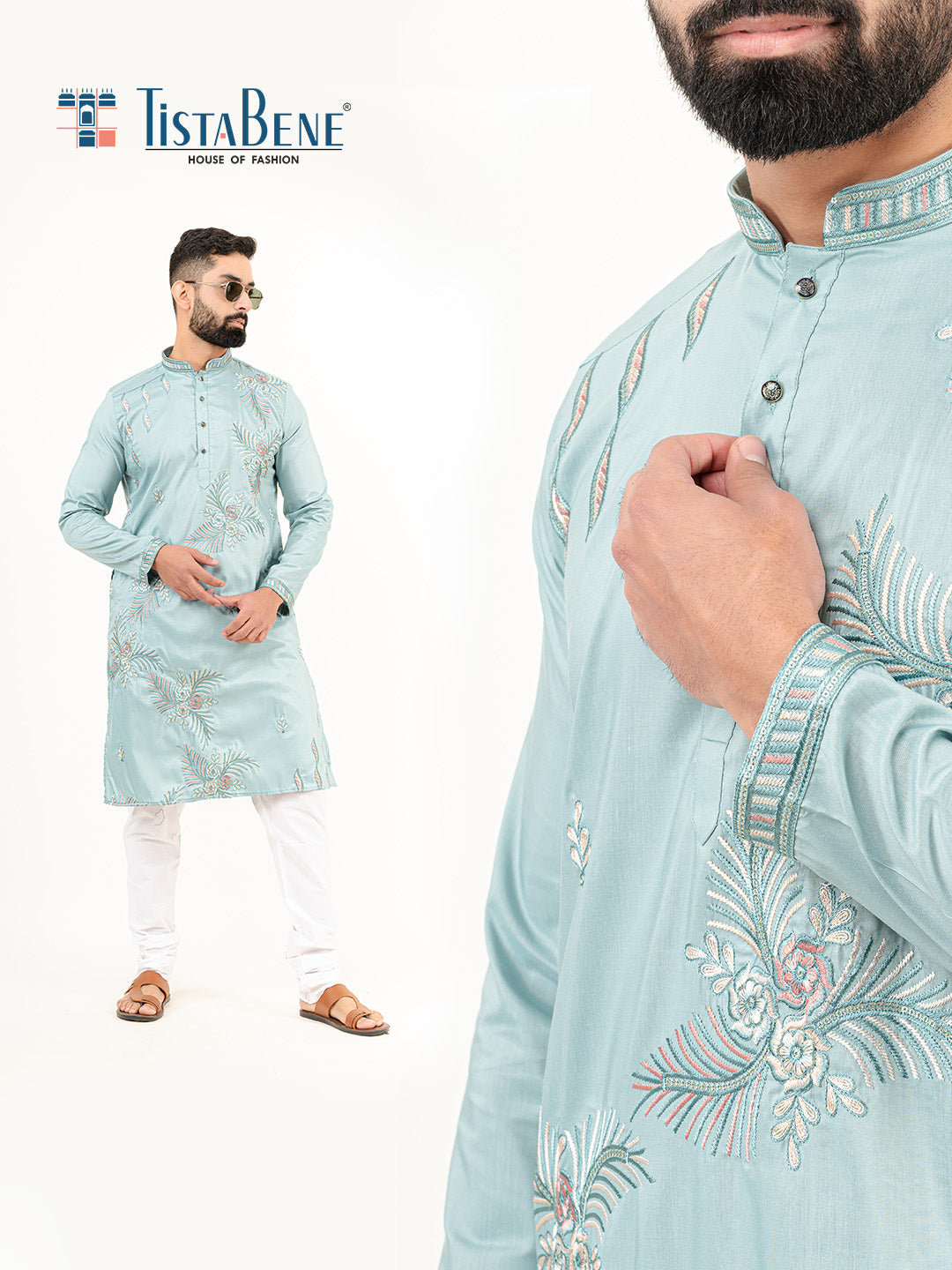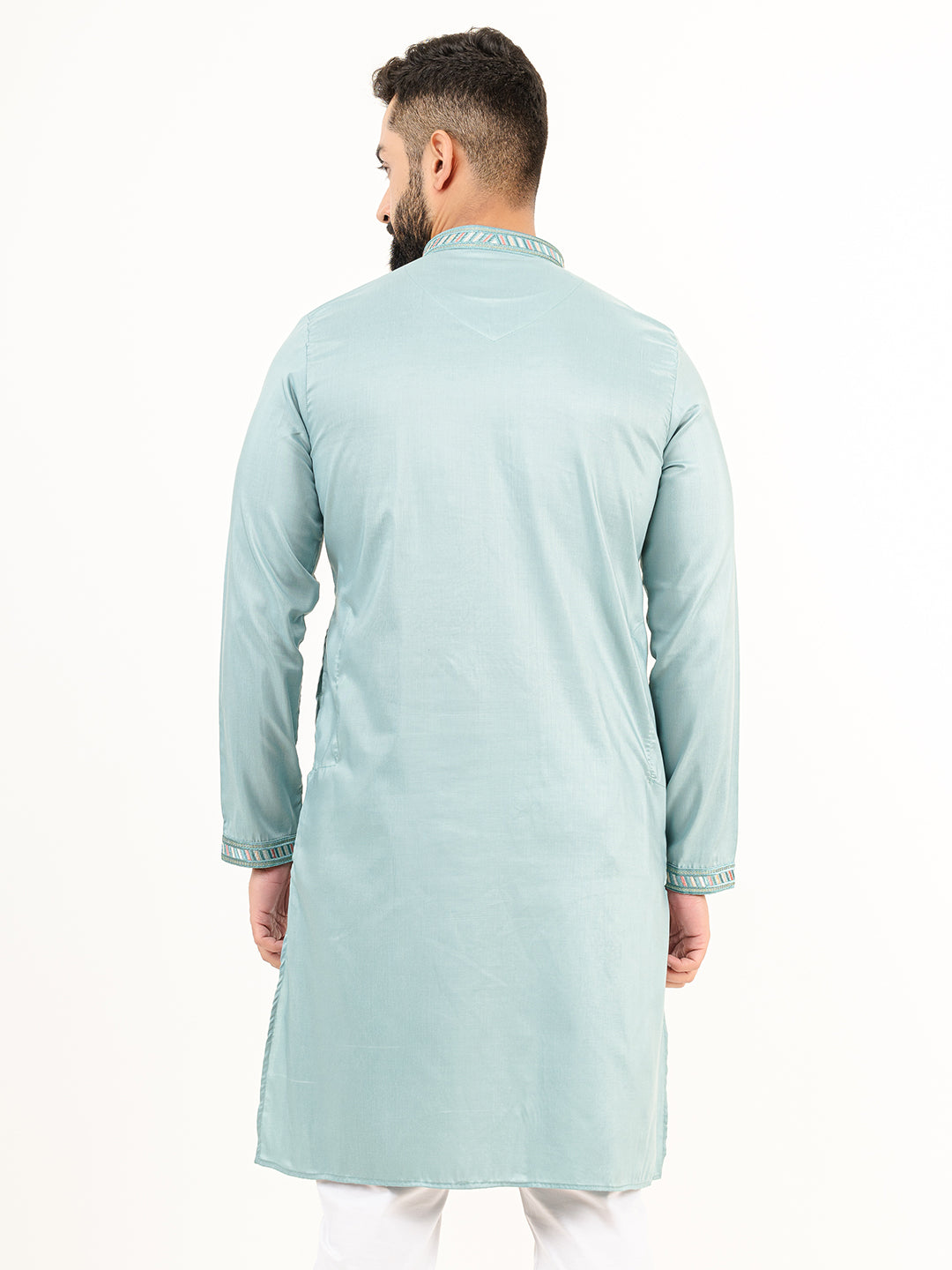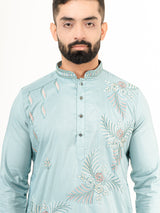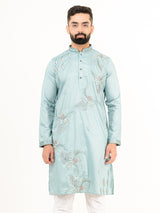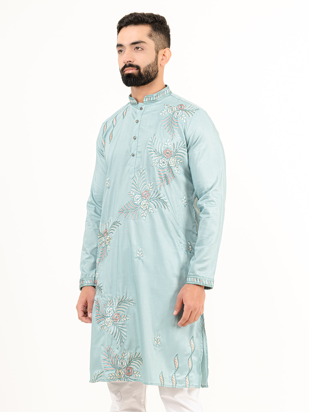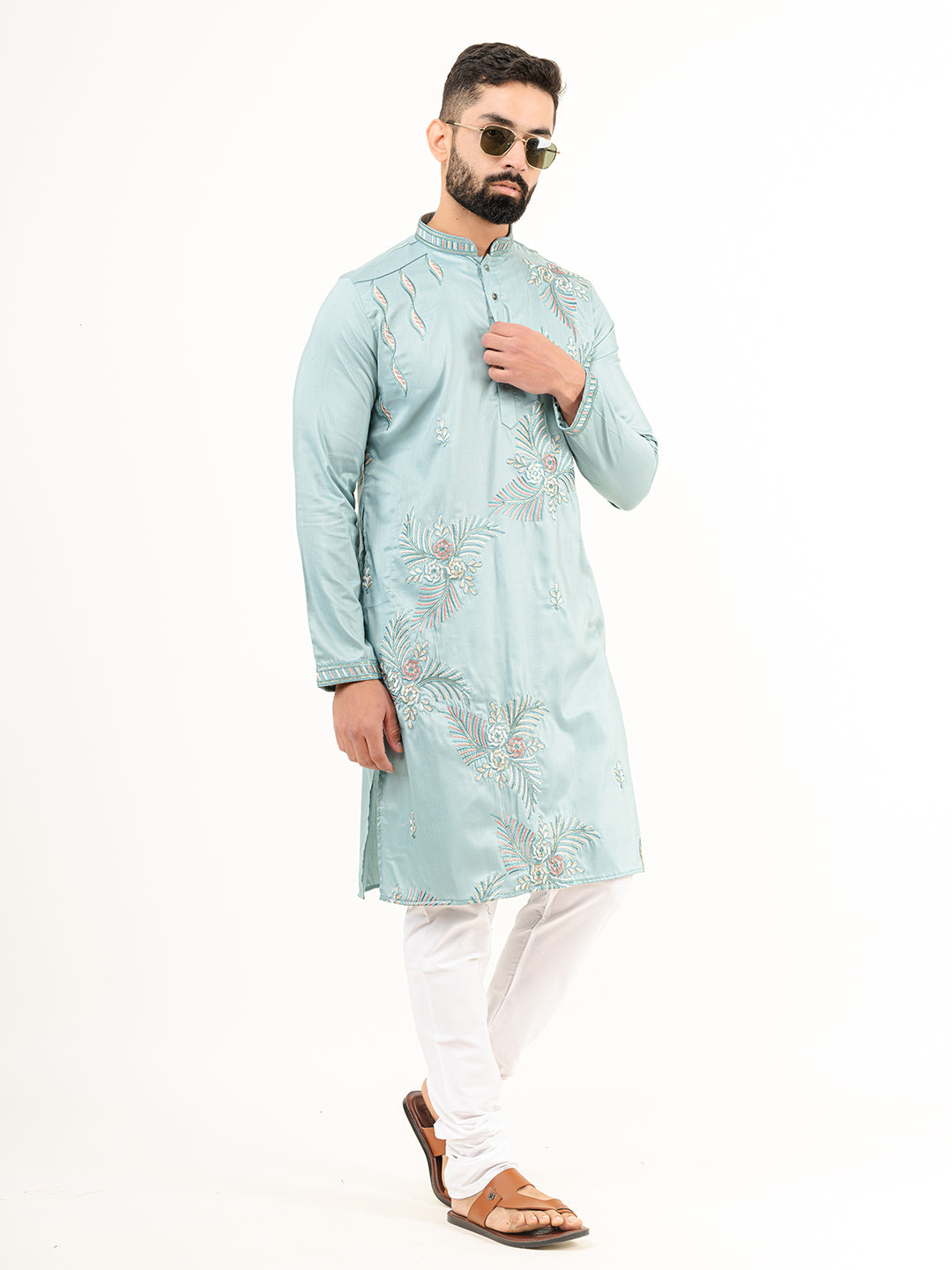 Step into elegance with this Cadet Blue Floral Silk Embroidered Kurta for Men. The vibrant Cadet Blue hue combined with intricate floral embroidery adds a touch of sophistication and class to your ethnic wardrobe. Crafted from luxurious silk fabric, this kurta is perfect for showcasing timeless style and comfort.