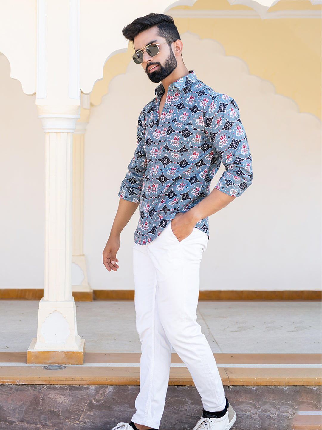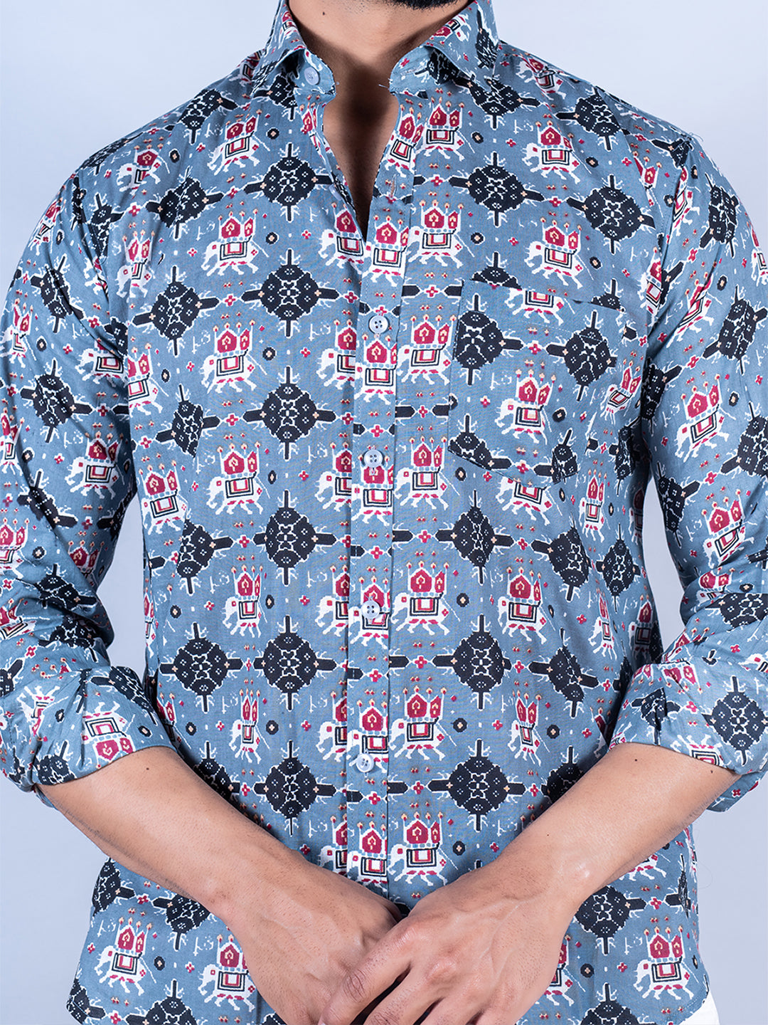 About the product: This grey elephant ikat printed full sleeves cotton shirt is made to make you look smart. This comfortable shirt is a must inside your wardrobe.