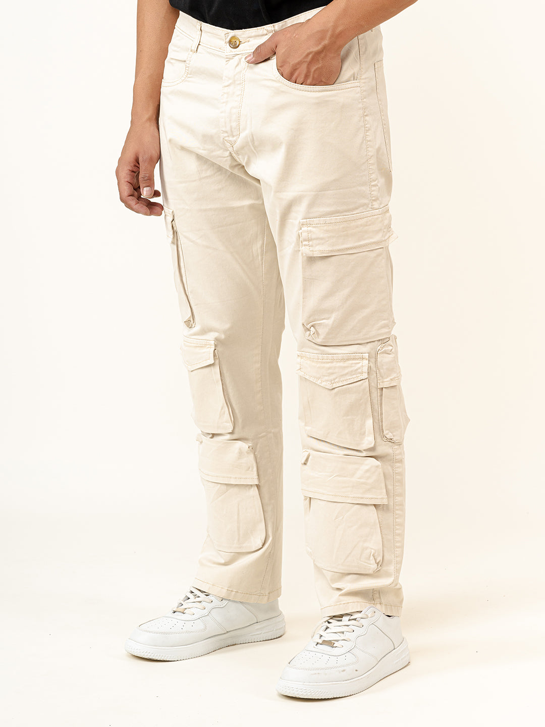 About the product : Elevate your style with our Cream Flared Straight Fit Cargo Pants for Men in comfortable, breathable cotton for a trendy, urban look.