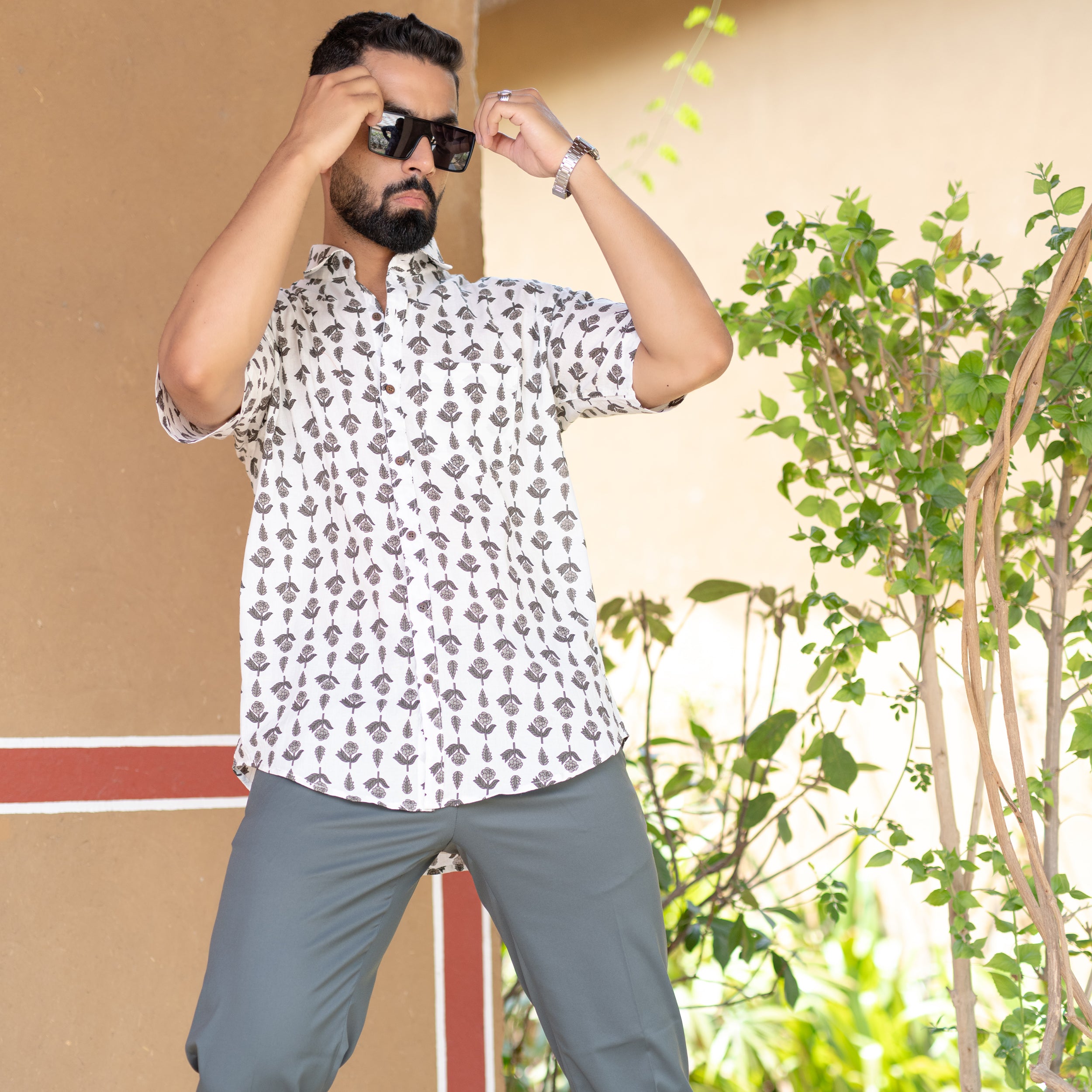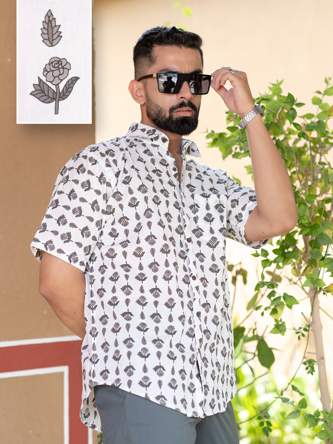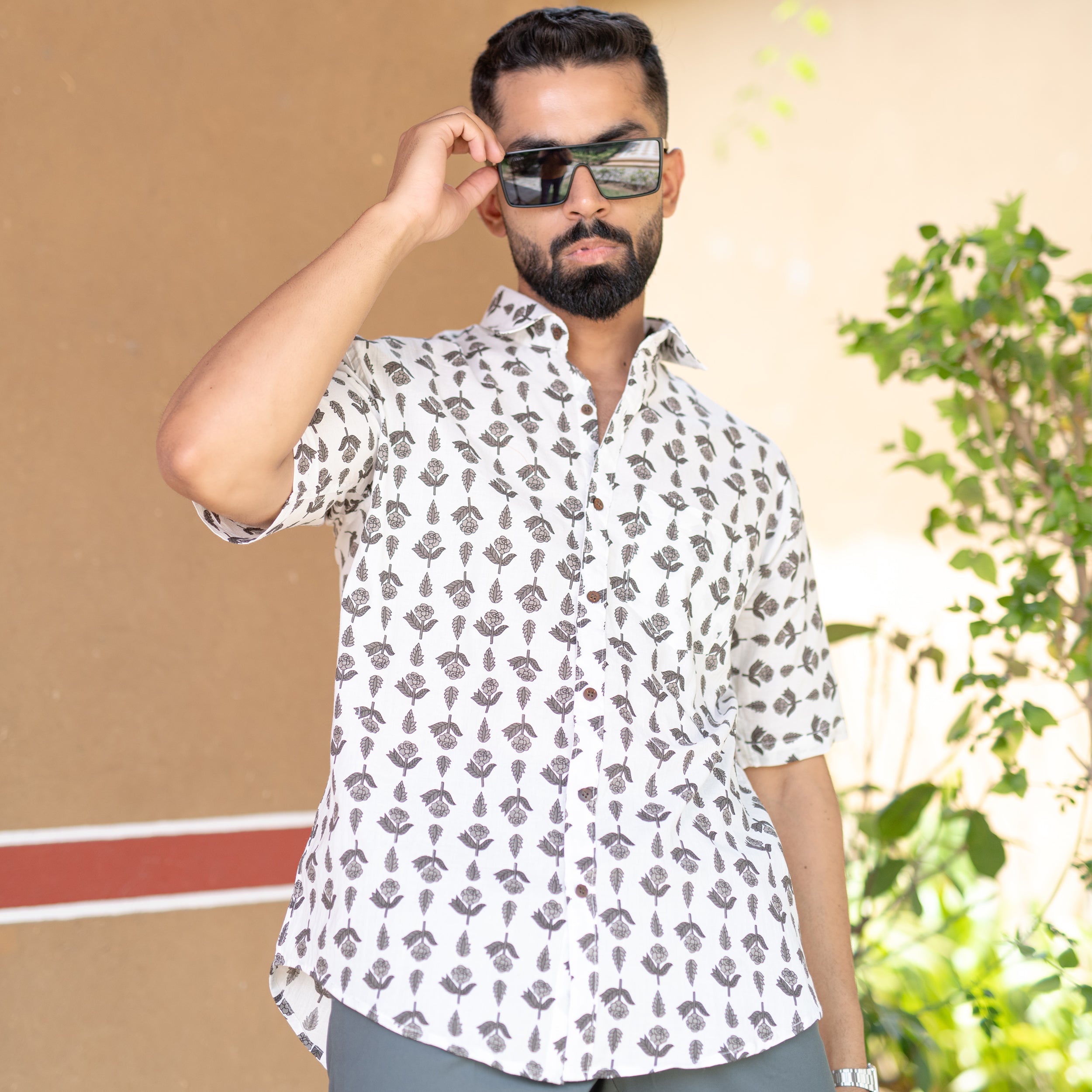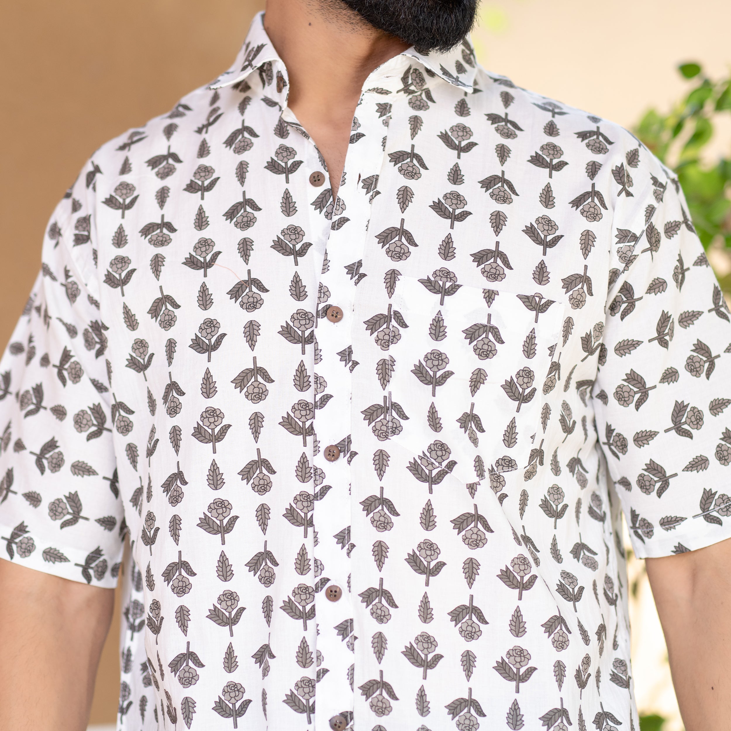 About Product- : Subtly sophisticated, this cream floral half-sleeve shirt is a timeless piece for any occasion.