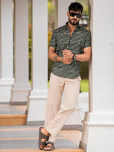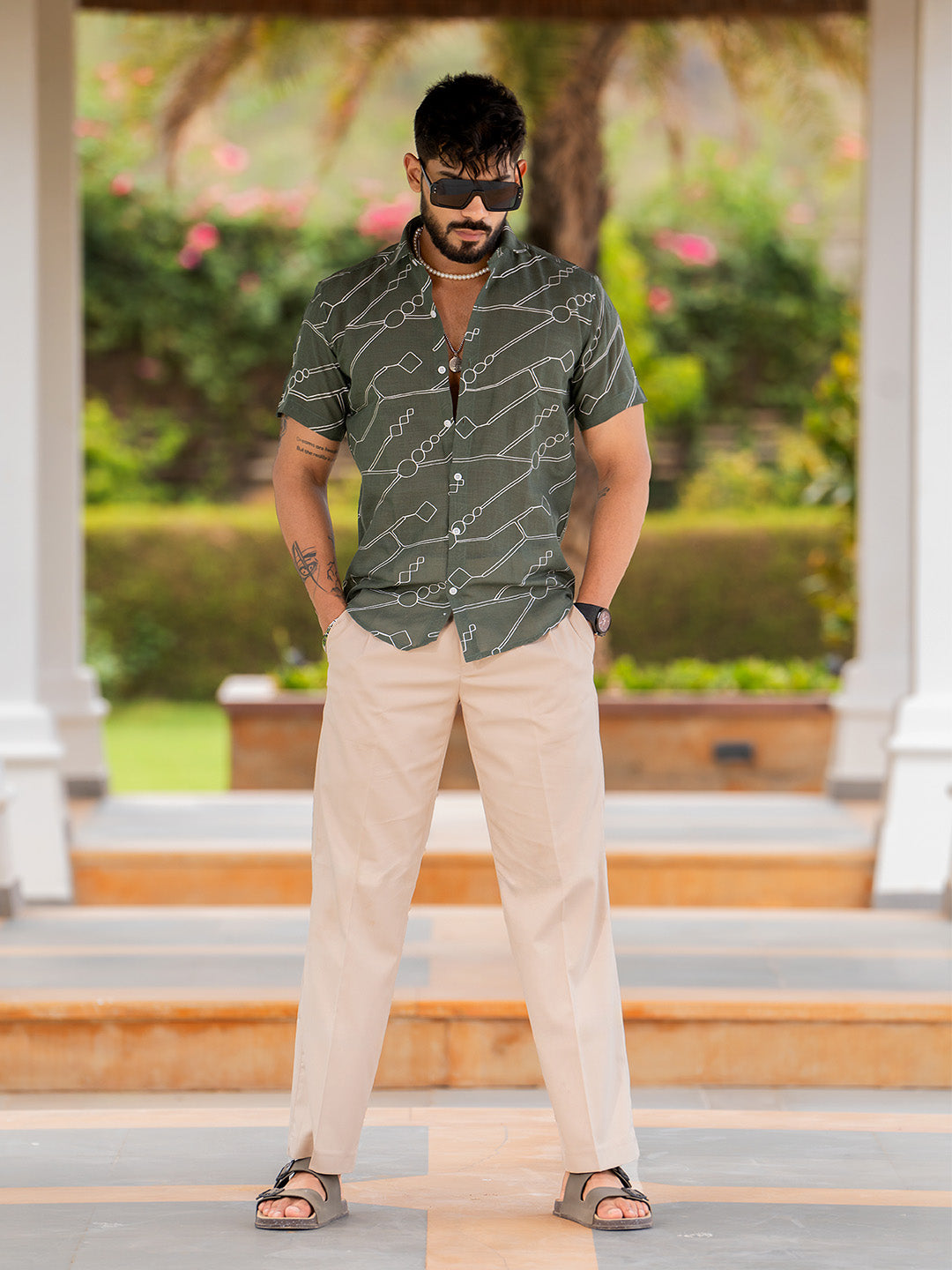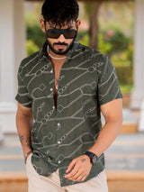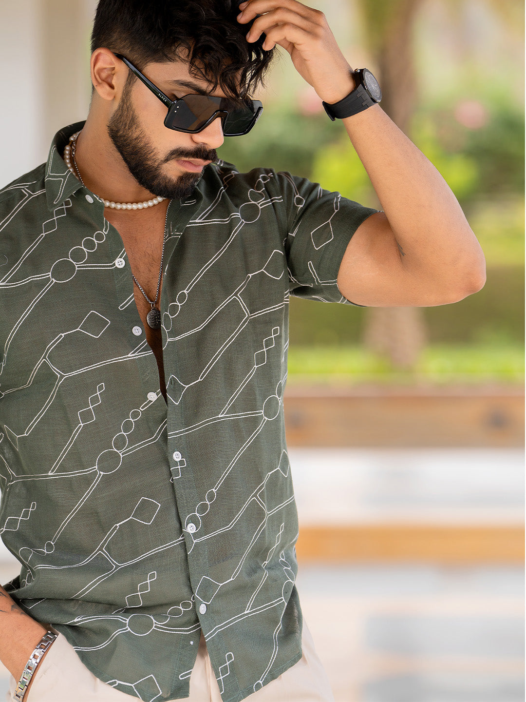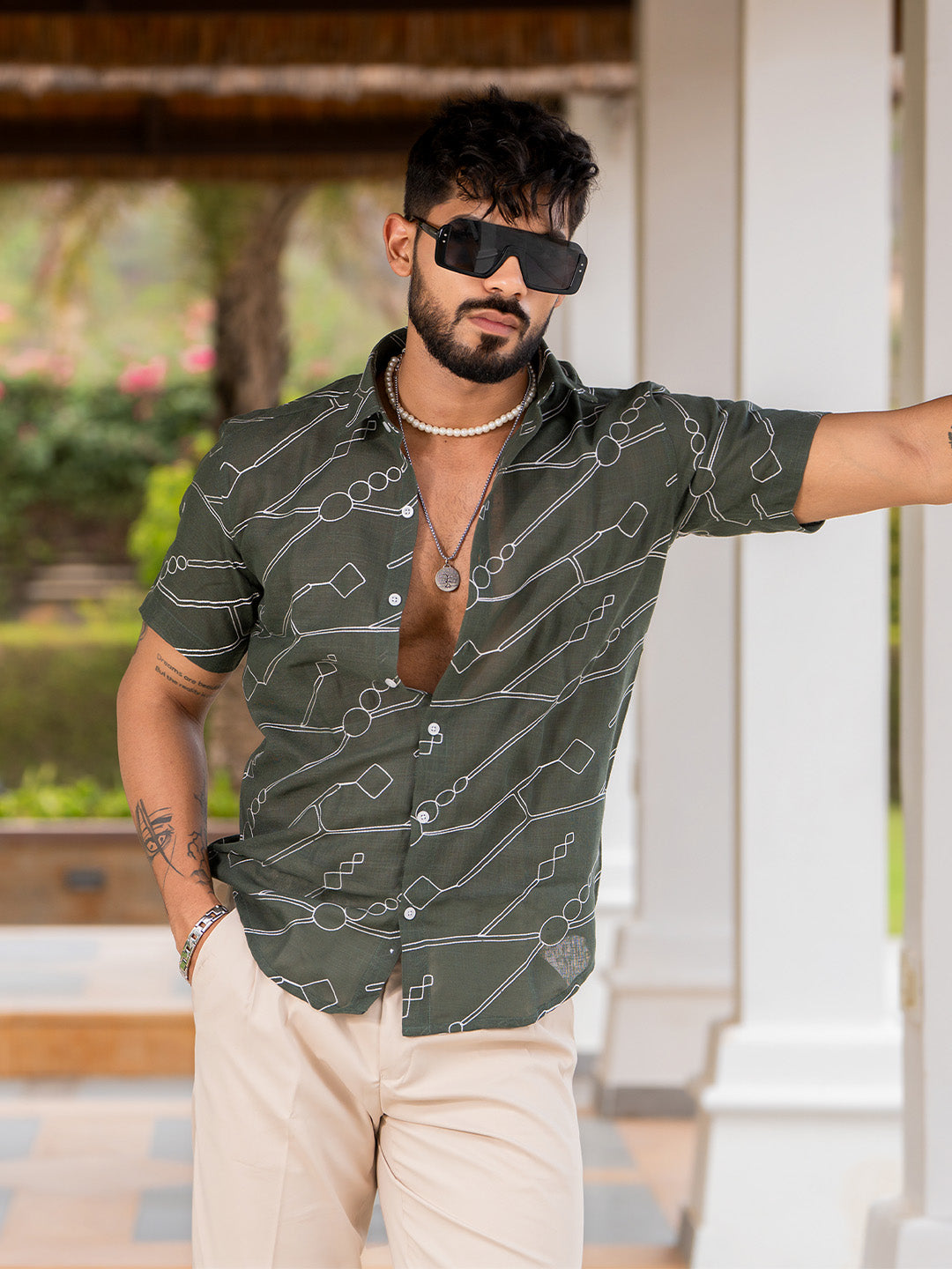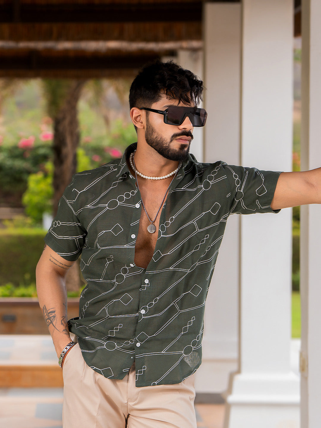 Discover the perfect blend of comfort and style with Dark Green Abstract Embroidered Half Sleeve Linen Shirt for men. This shirt features intricate embroidery, offering a unique touch to your wardrobe.