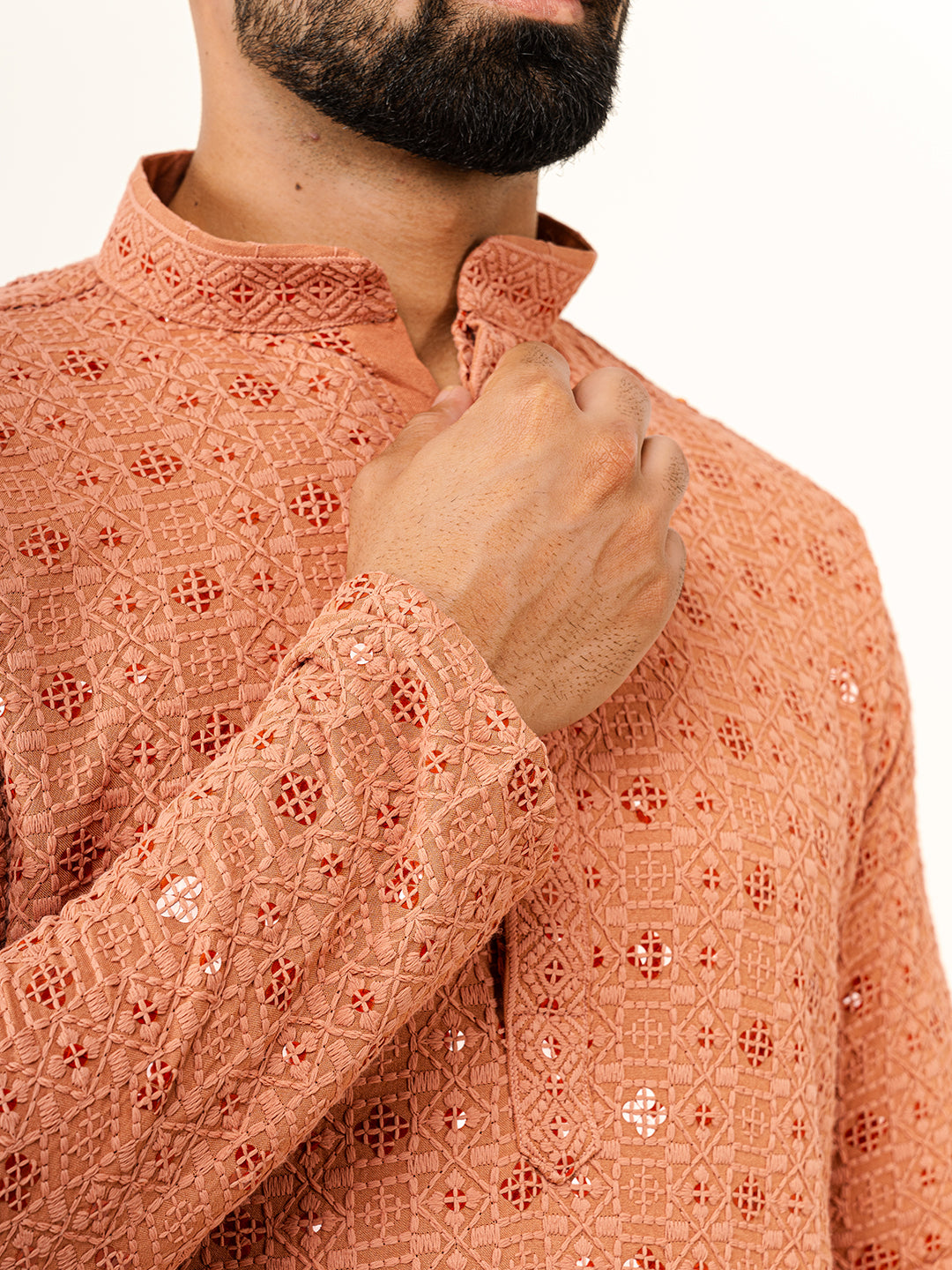 About the Product: The Dark Peach Designer Cotton Embroidered Kurta for Men is a perfect blend of style and comfort. Featuring exquisite embroidery, this kurta stands out for any special occasion.