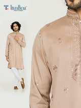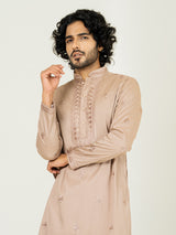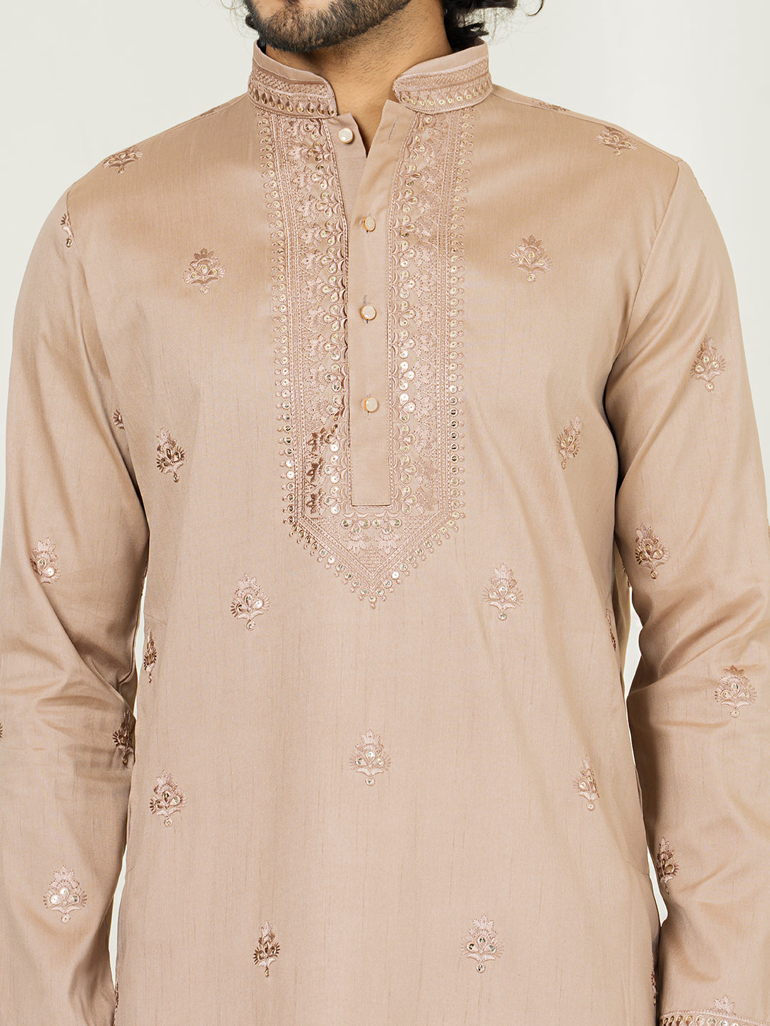 This dark pink kurta is beautifully designed with heavy embroidery, offering a luxurious and traditional look. Made from Afgani silk, it provides a soft, elegant feel, perfect for special occasions.