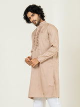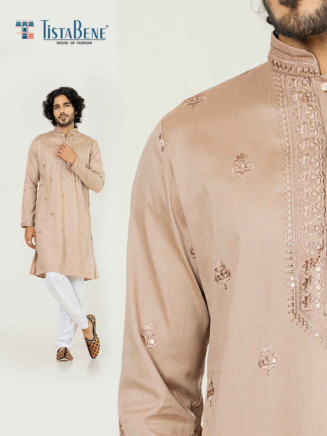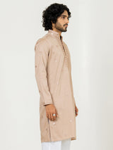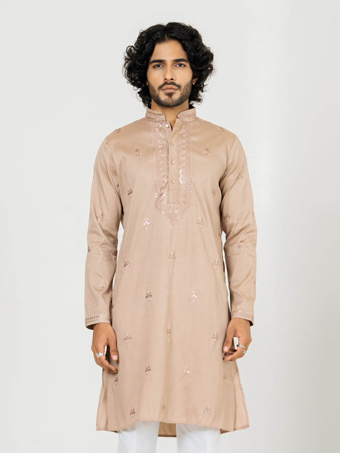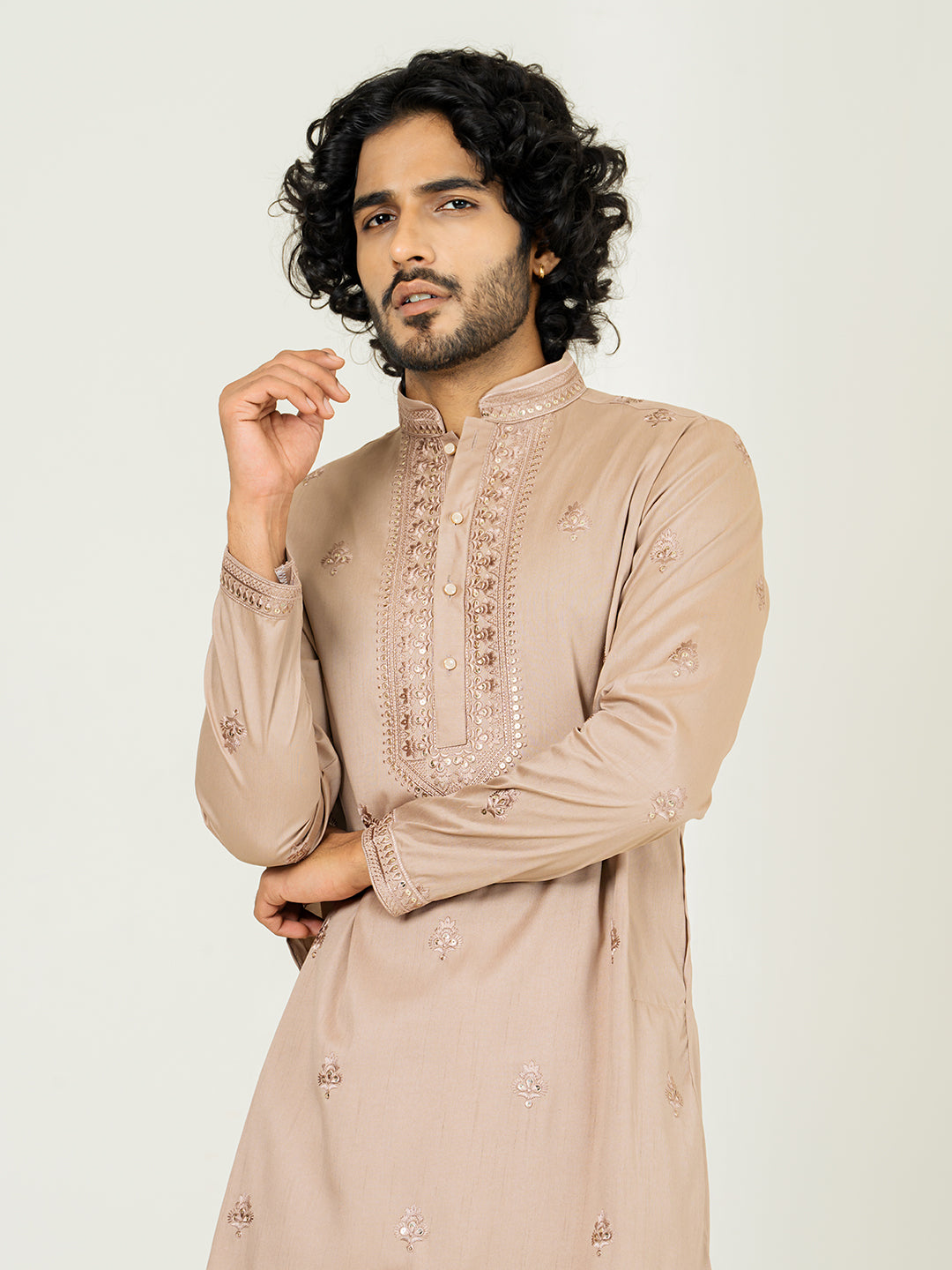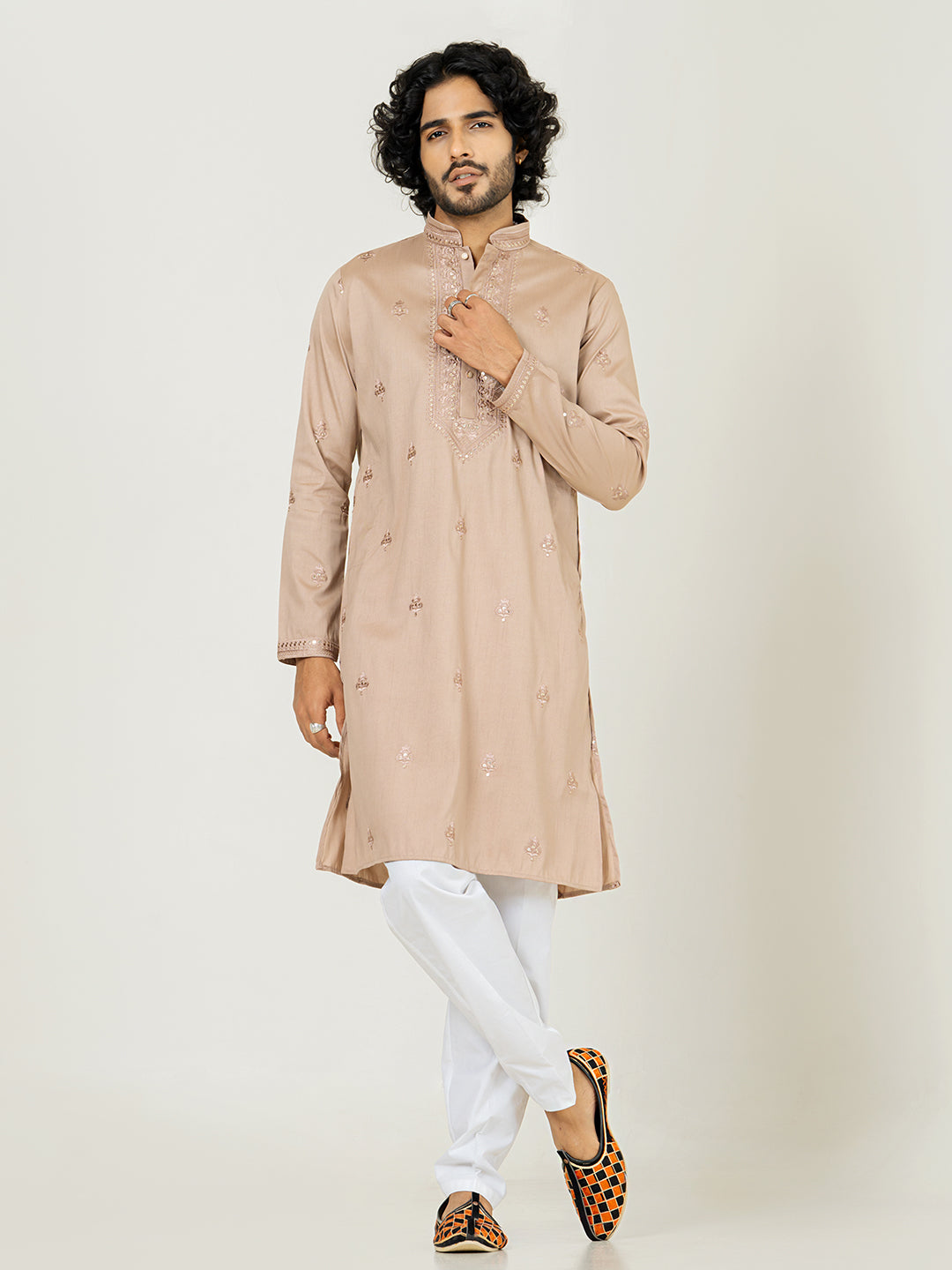 Pair this kurta with cream or gold churidar or trousers for a regal, cohesive look. Complete the outfit with traditional mojaris and add a simple watch for a refined touch. Keep accessories minimal.