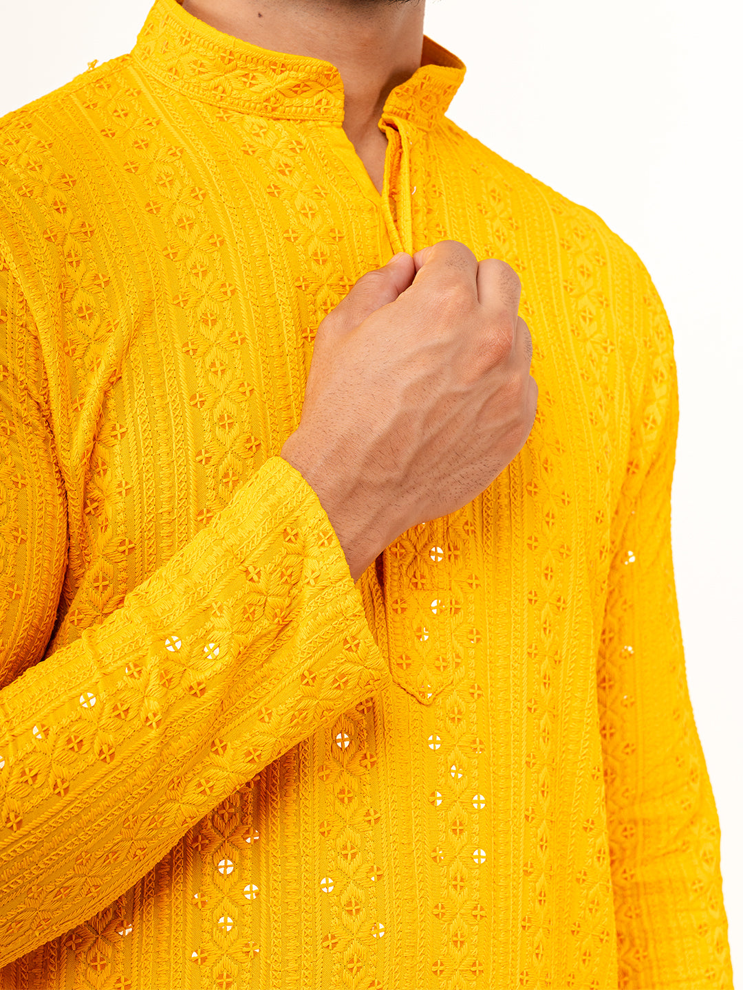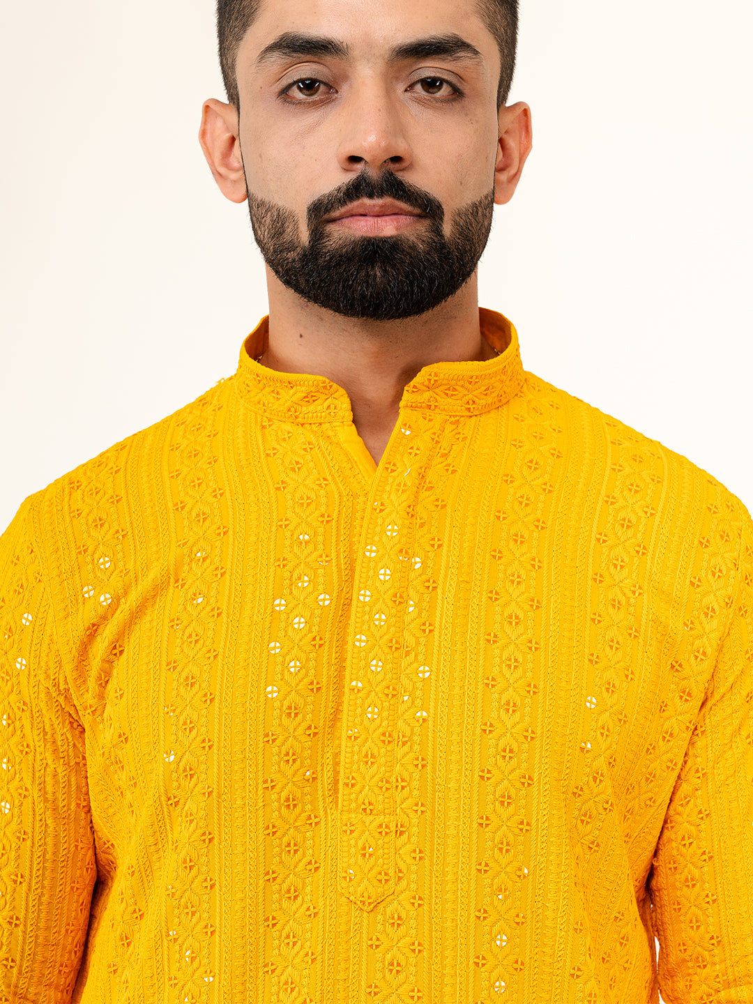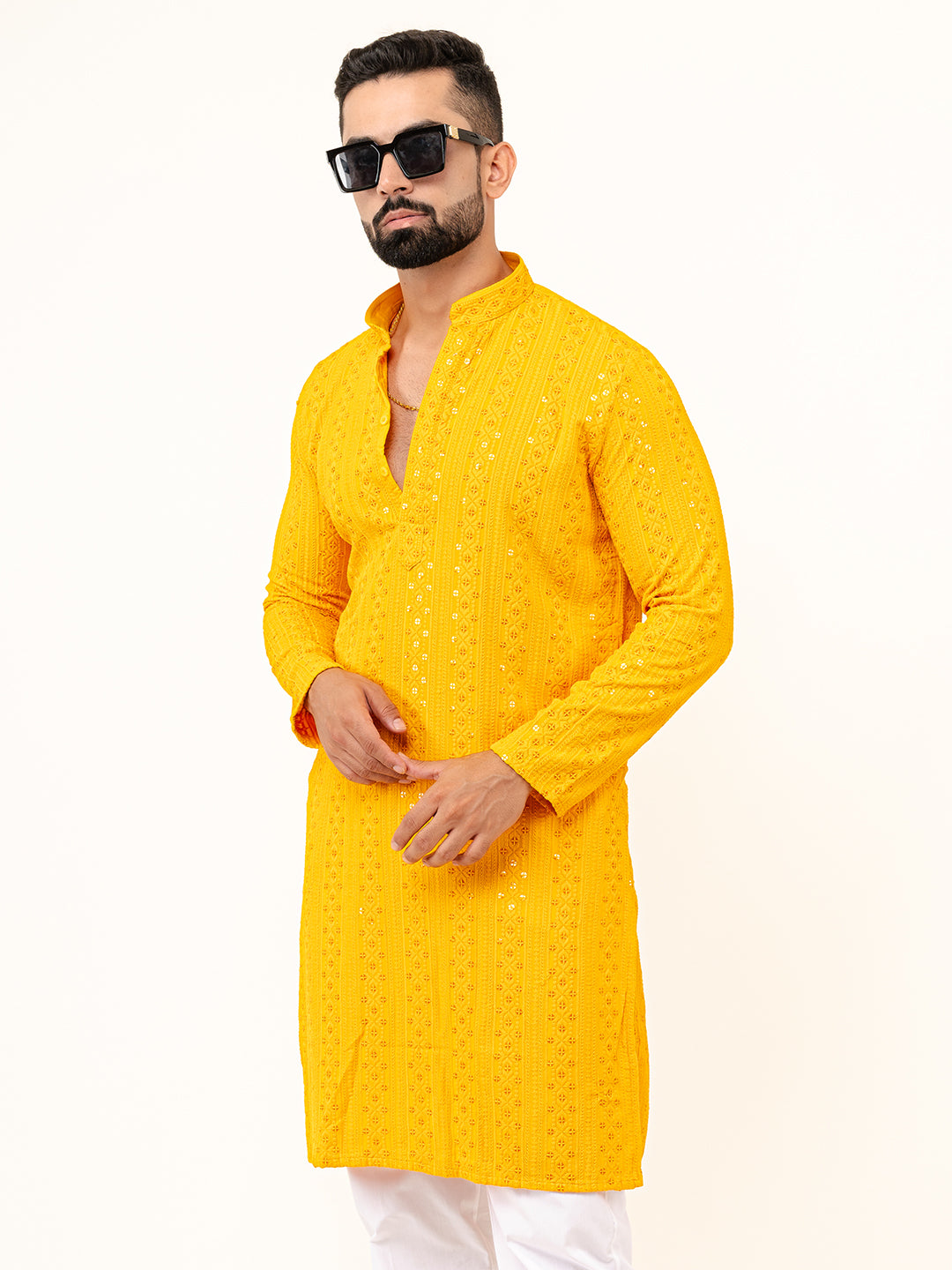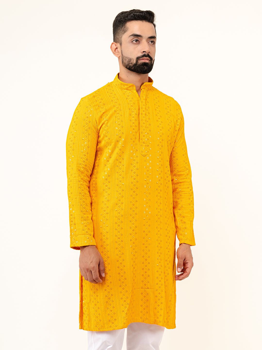 About The Product- The Dark Yellow Sequin Designer Cotton Embroidered Kurta for Men combines elegance and sparkle. Featuring sequin details and intricate embroidery, this kurta is perfect for special occasions.