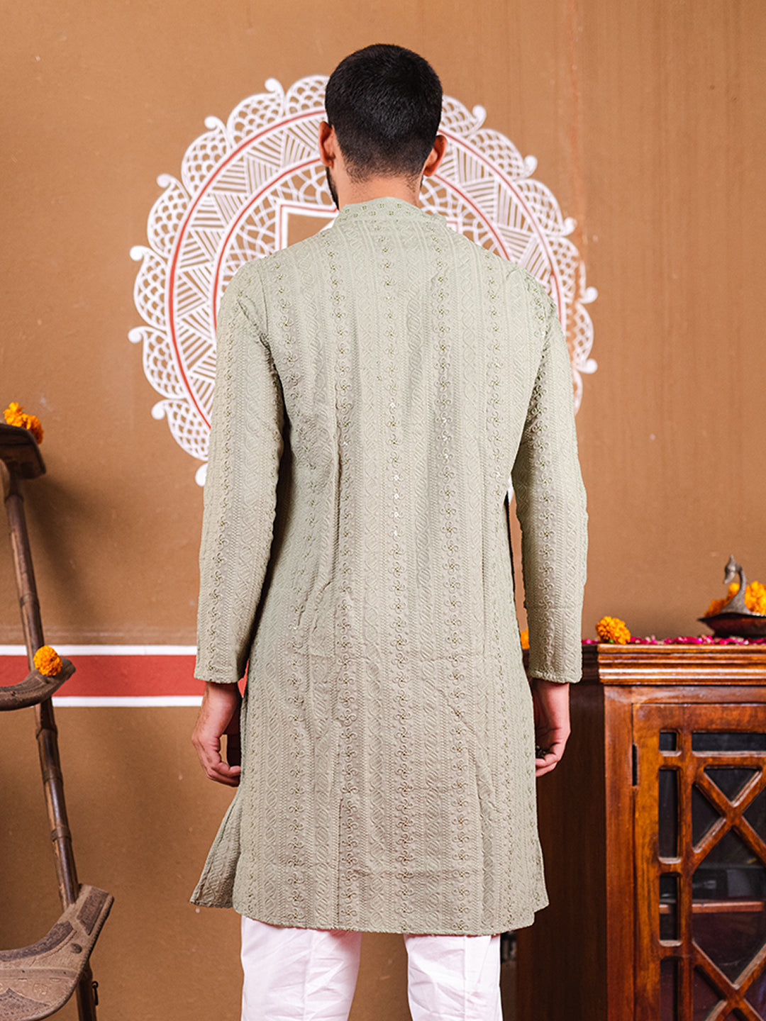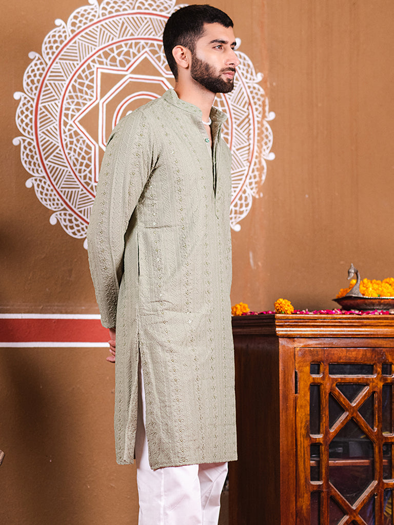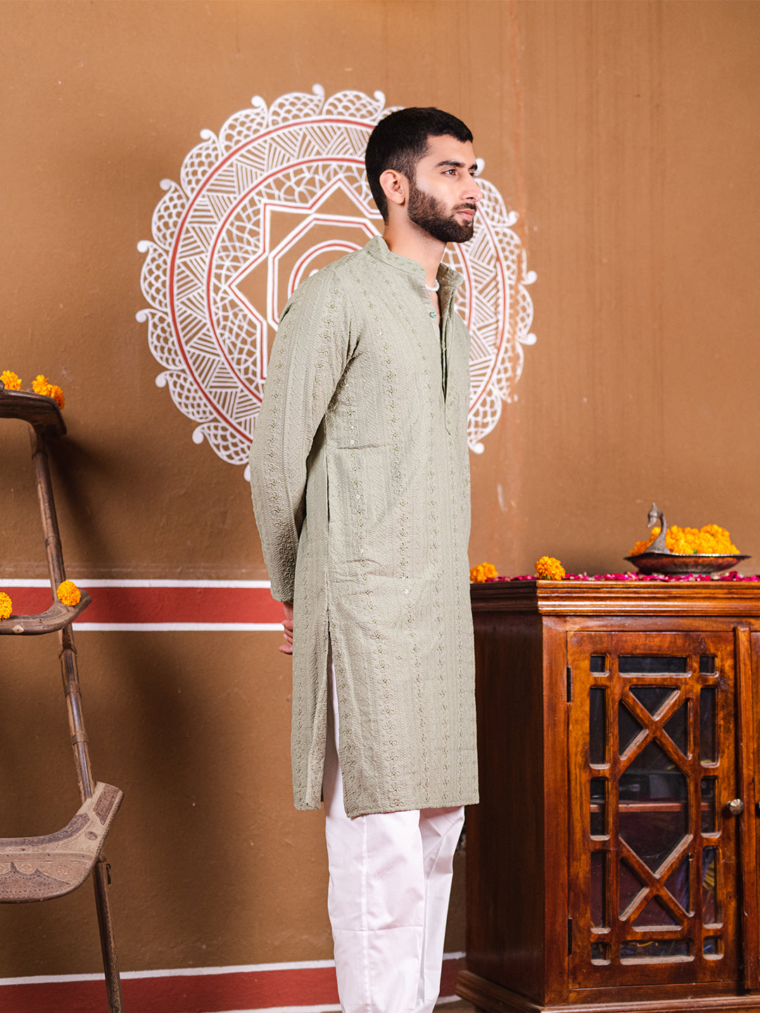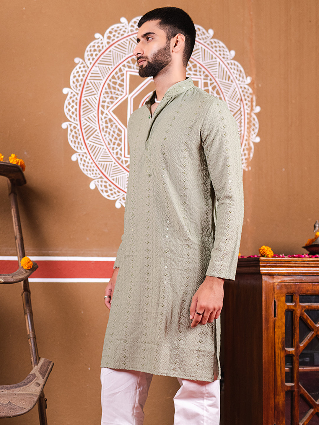 About the product- For a subtle look, you can go for this Elm Green Chikankari Embroidered Kurta that is highly comfortable and allows easy movement!