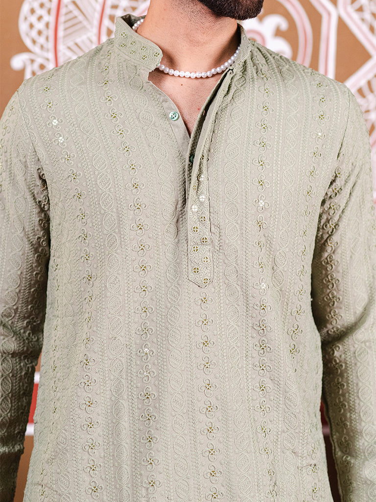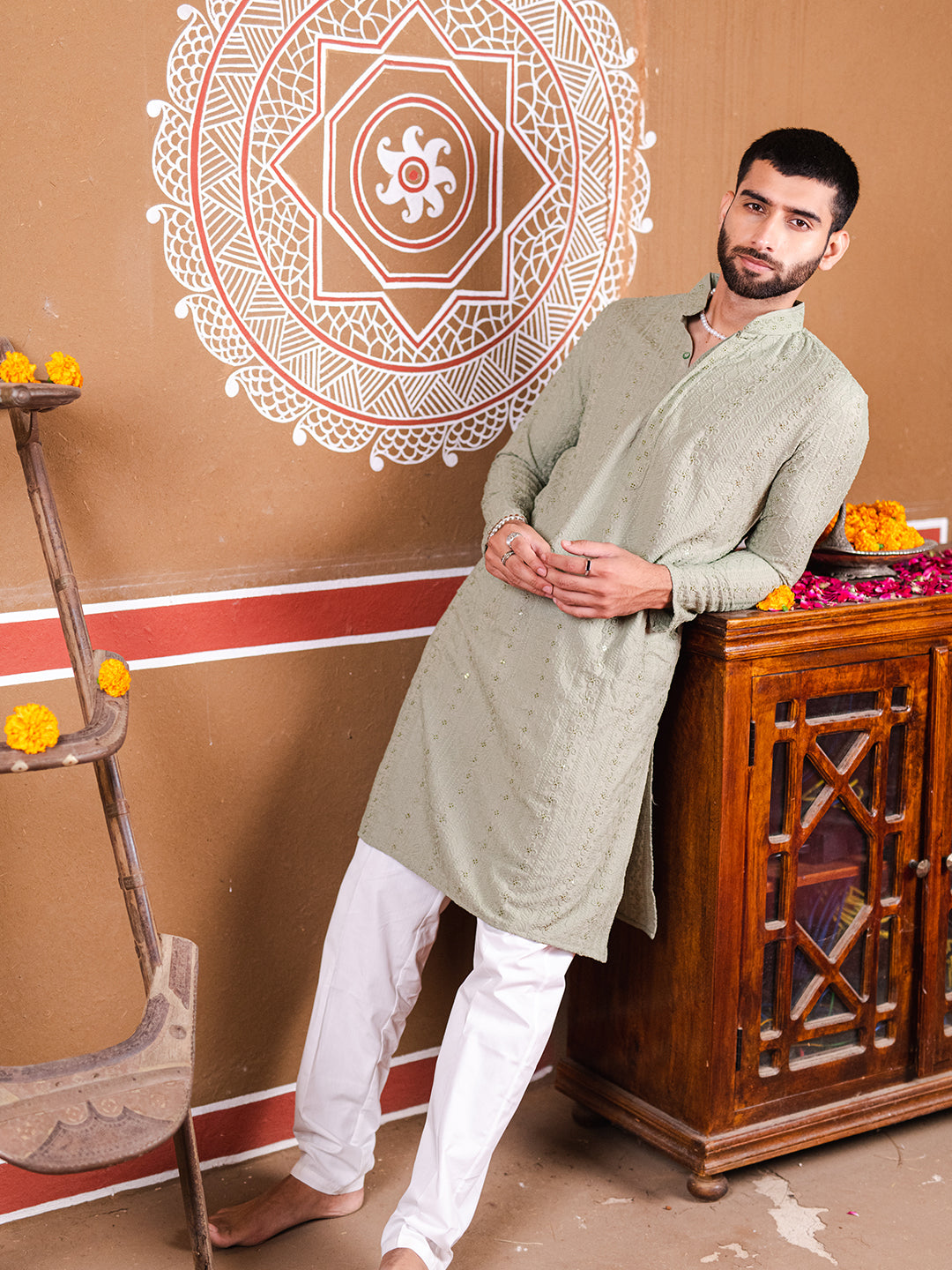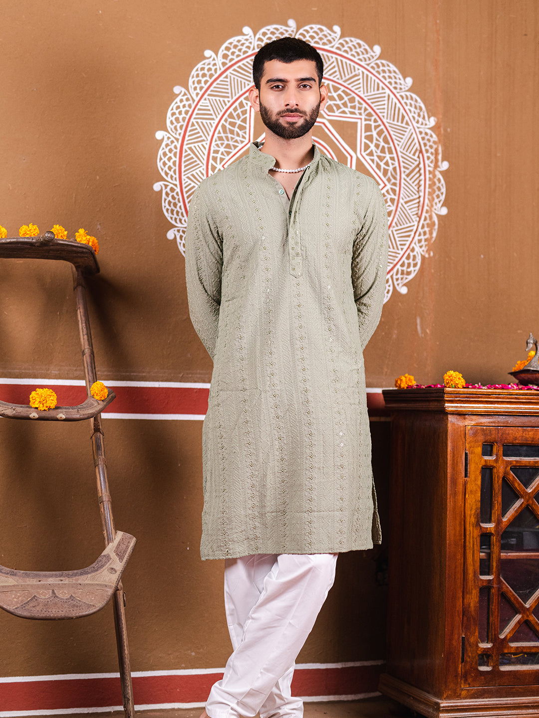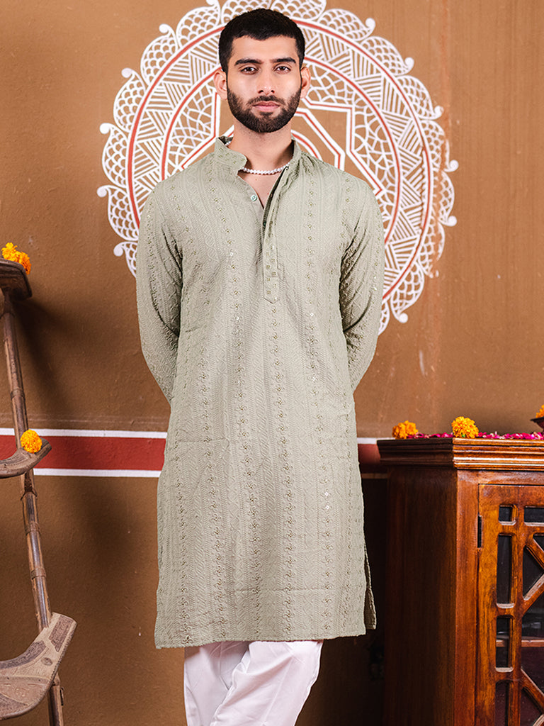 About the product- For a subtle look, you can go for this Elm Green Chikankari Embroidered Kurta that is highly comfortable and allows easy movement!