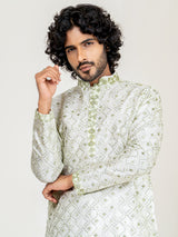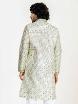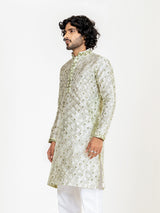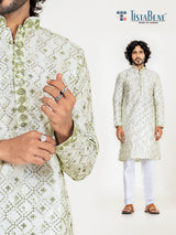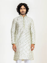 This elegant green kurta, crafted from silk-shaded fabric, features intricate embroidery that adds a rich, traditional touch. It combines luxurious comfort with a timeless design for special occasions.