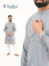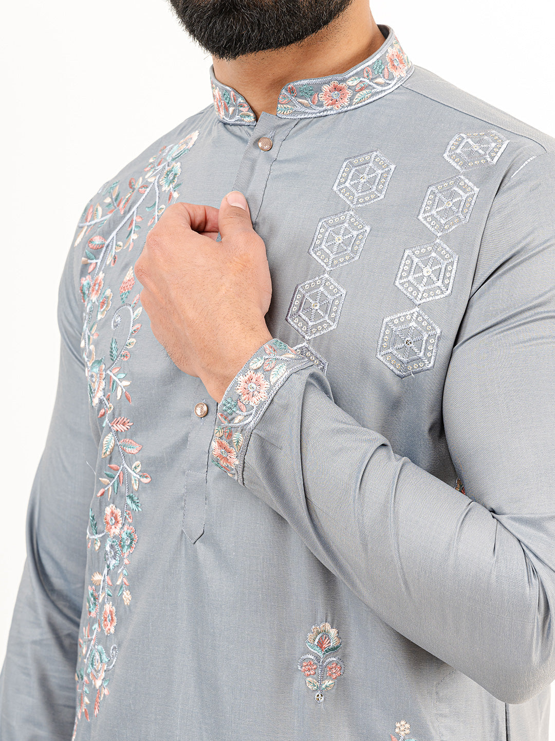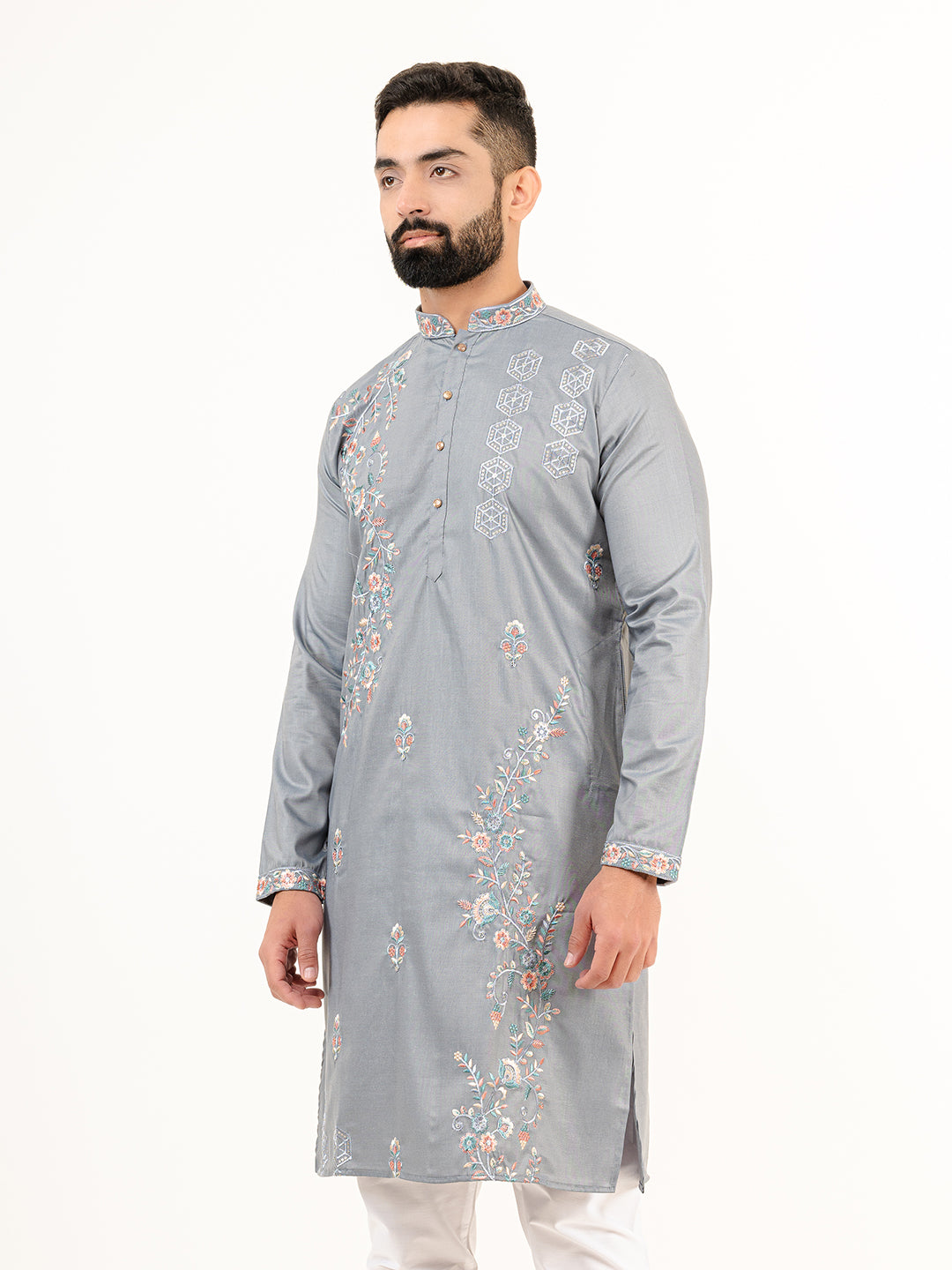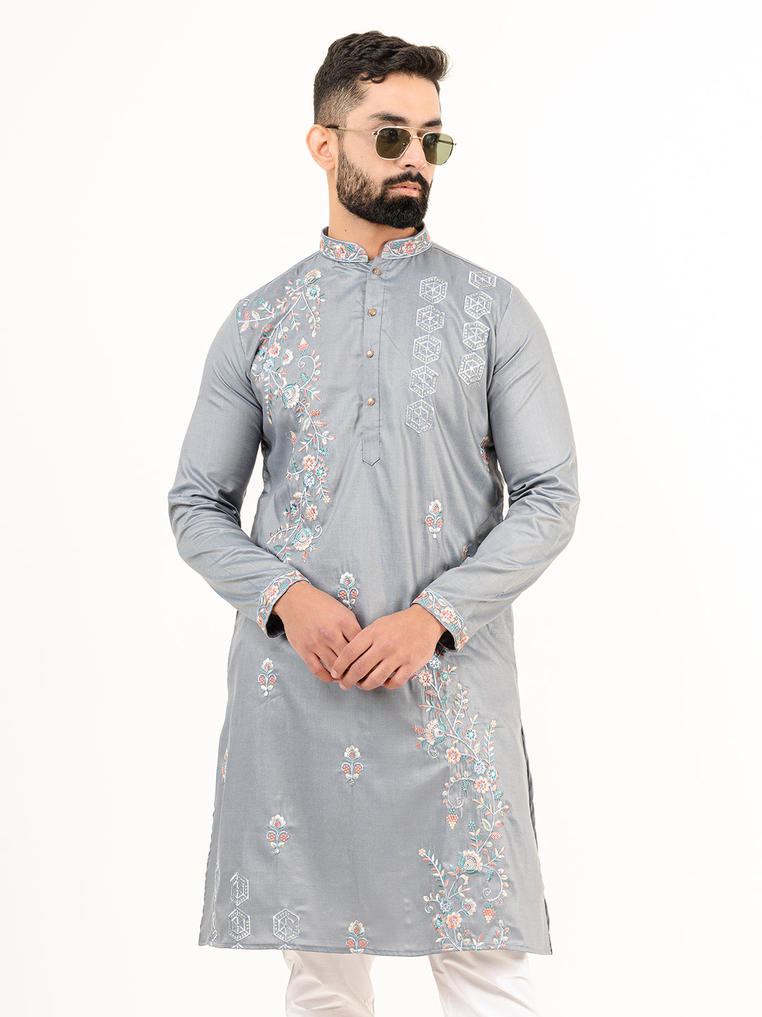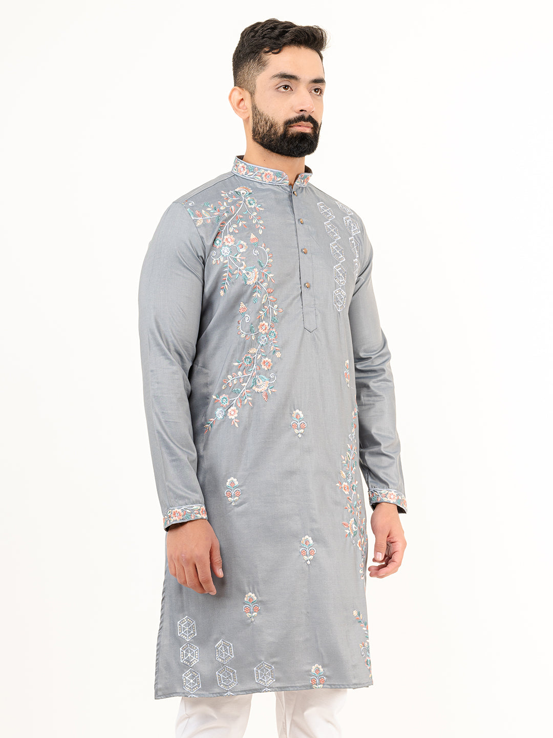 Step into elegance with thisGrey Wild Floral Silk Embroidered Kurta for Men. The vibrantGrey hue combined with intricate floral embroidery adds a touch of sophistication and class to your ethnic wardrobe. Crafted from luxurious silk fabric, this kurta is perfect for showcasing timeless style and comfort.