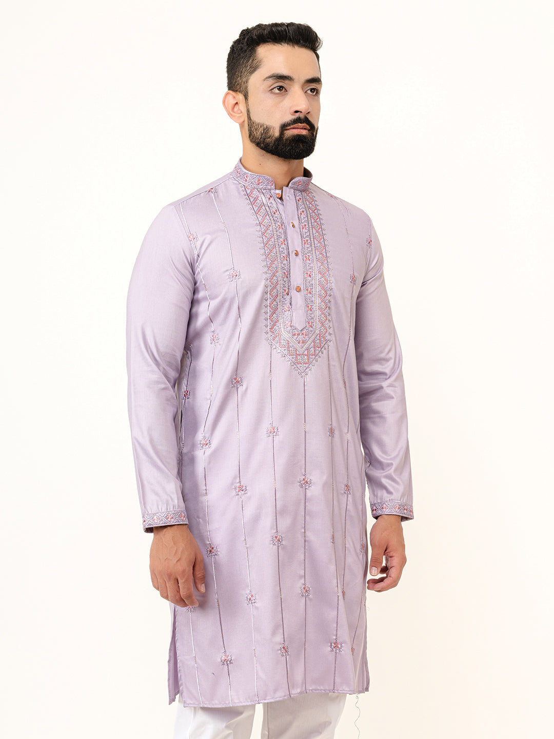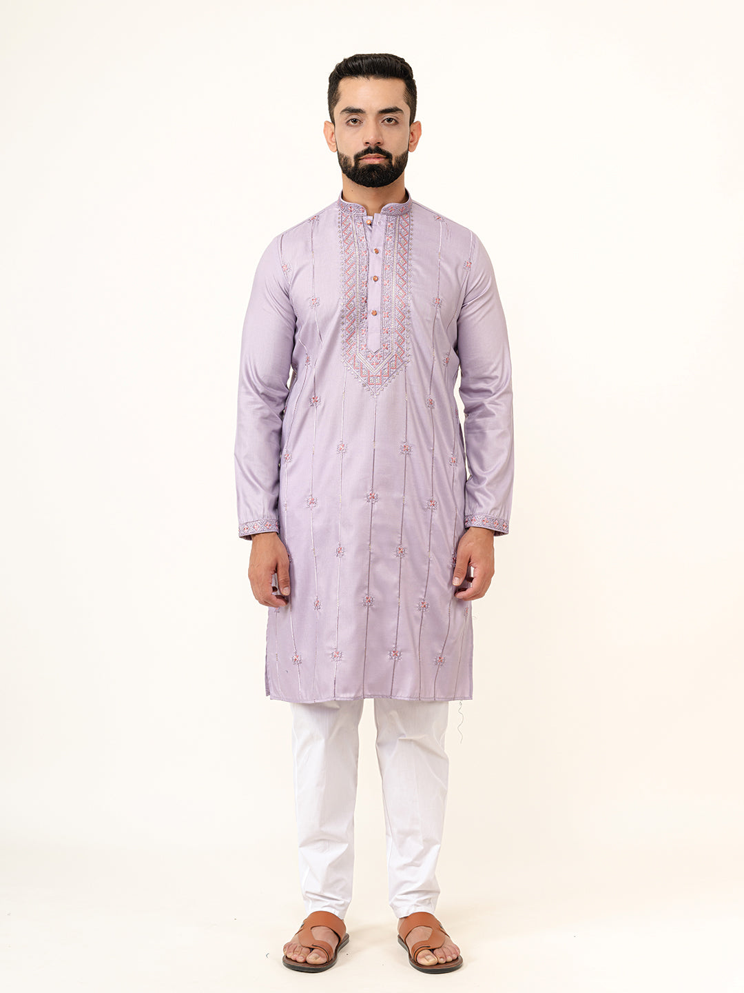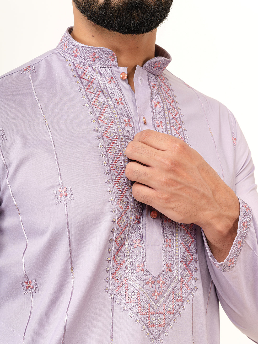Add a touch of royalty to your wardrobe with this Lavender Ethnic Straight Kurta. Made from premium silk, it features intricate embroidery on the yoke and cuffs, elevating your traditional style. Perfect for festive gatherings and special occasions, it promises both comfort and elegance.