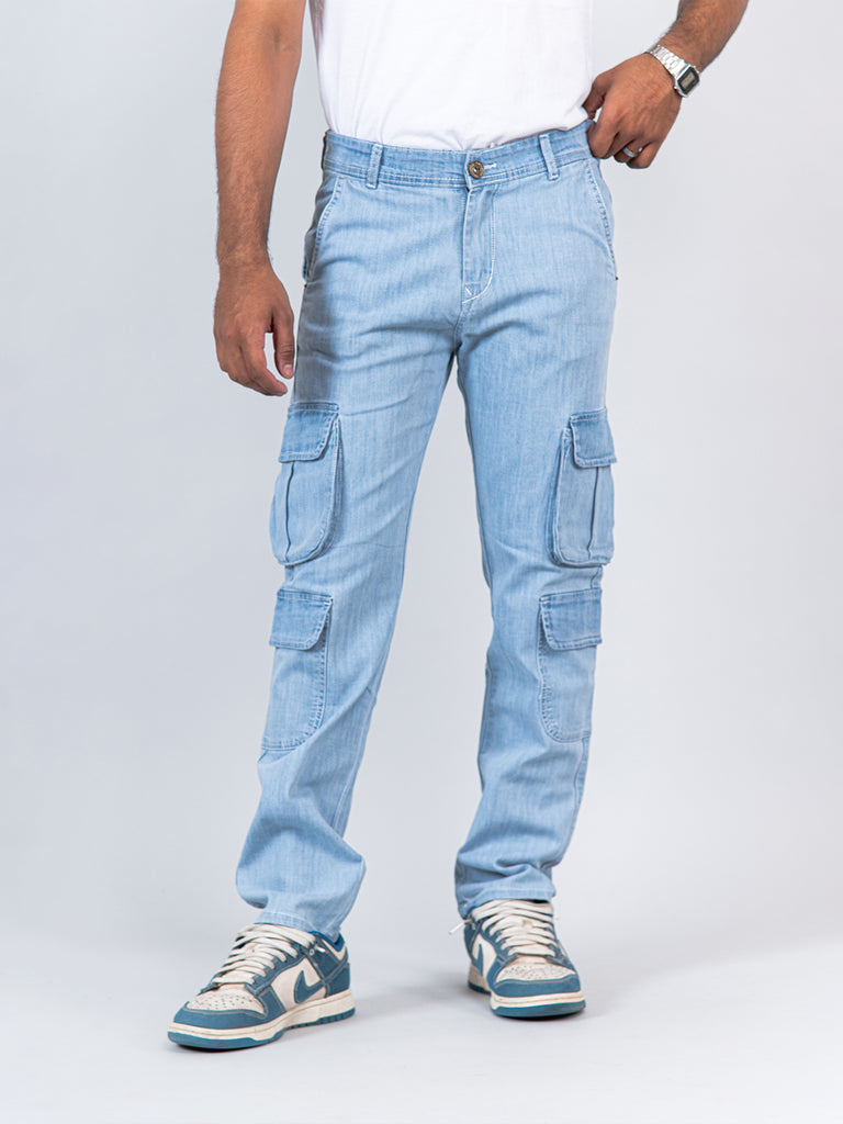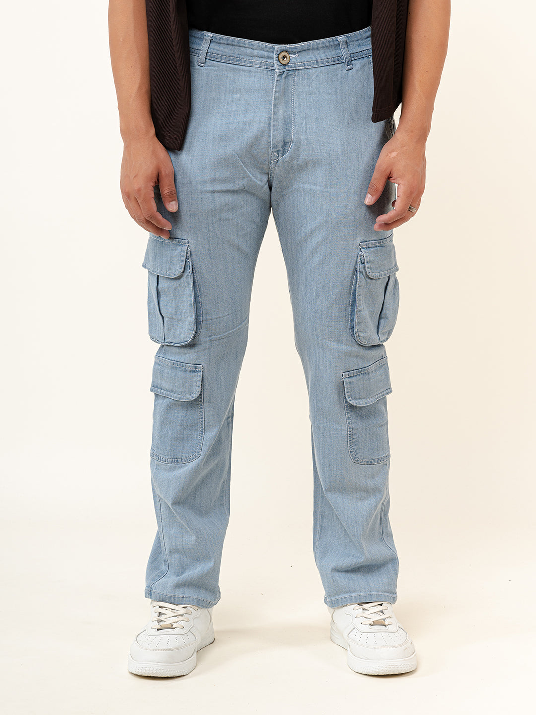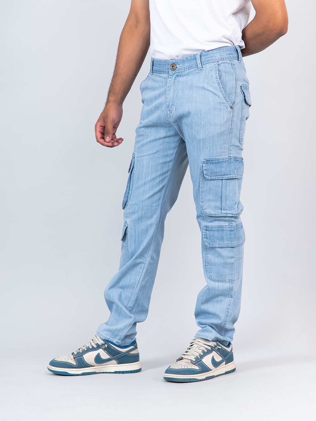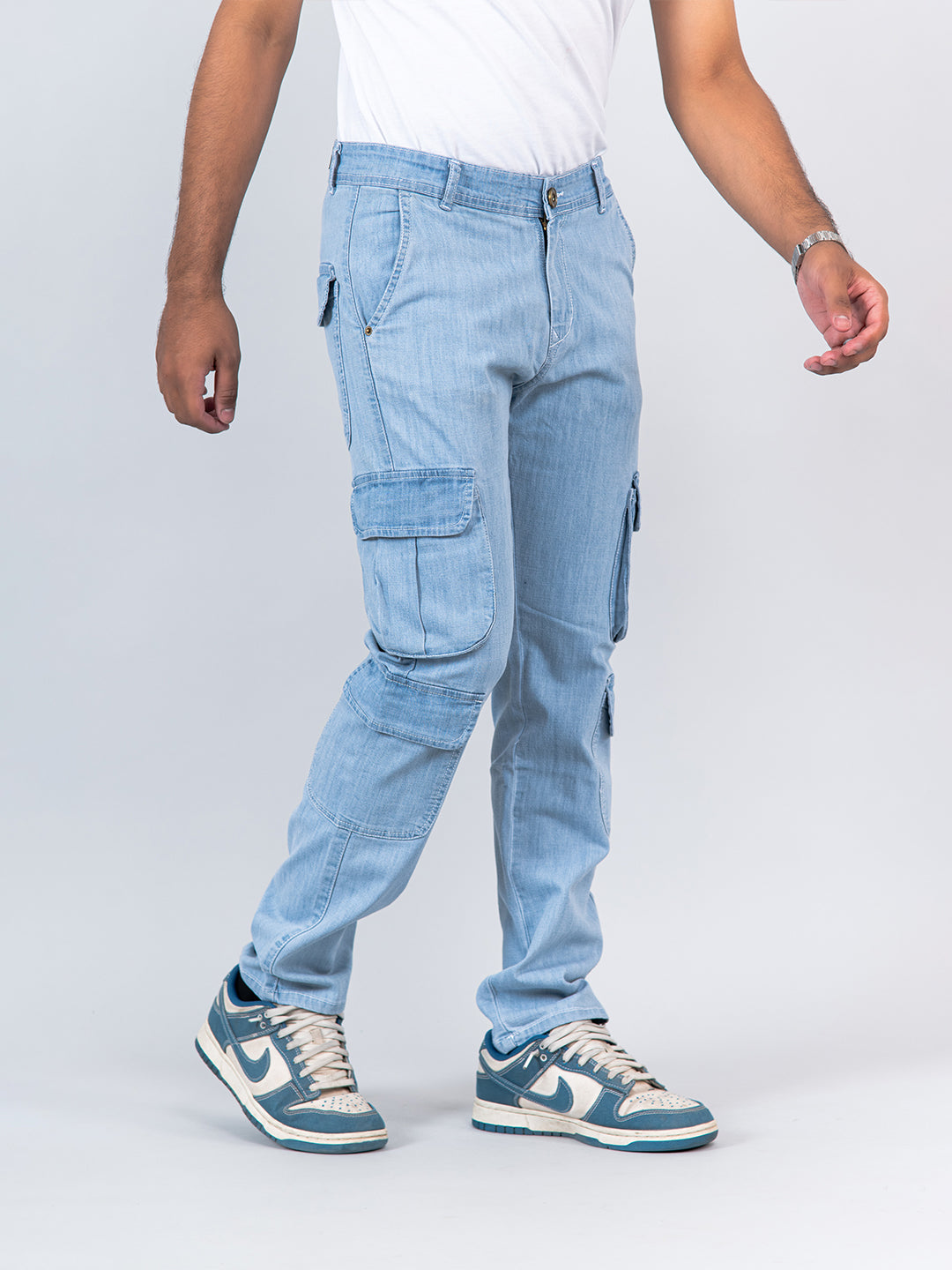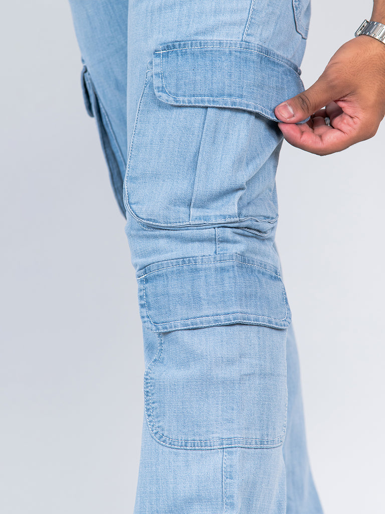 Occasion- Light Blue Cargo Denim Jeans Ideal for day-to-day wear or weekend outings. These cargo denim jeans seamlessly combine comfort and style, ensuring you stand out in various relaxed occasions.