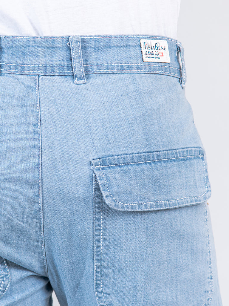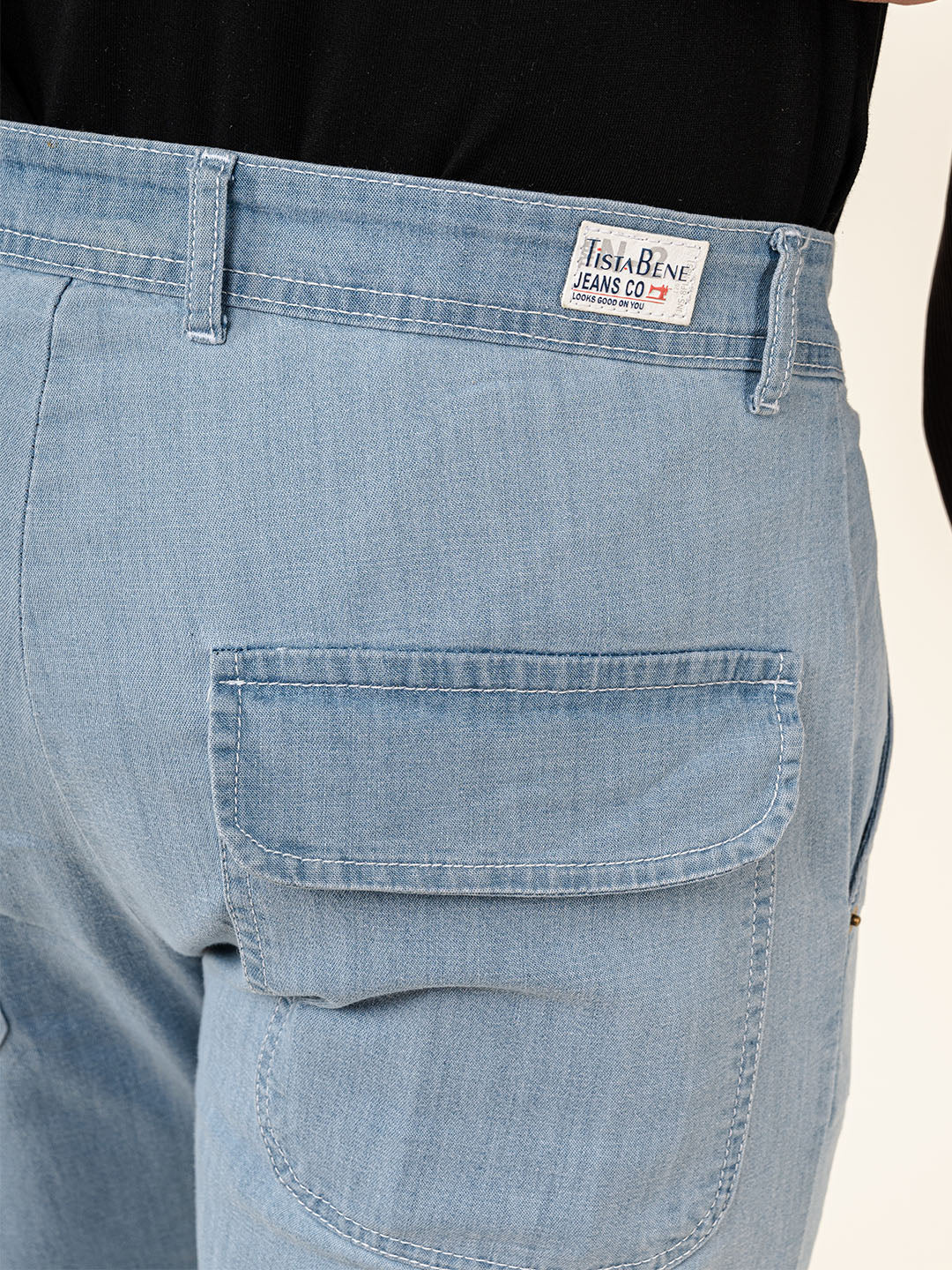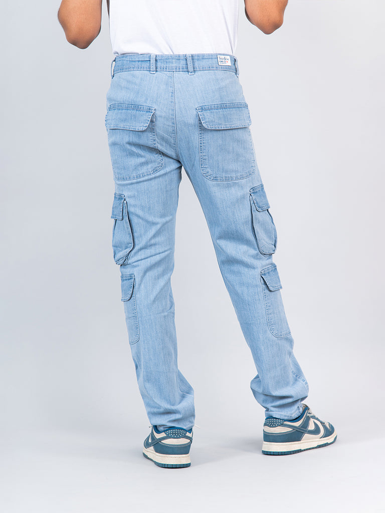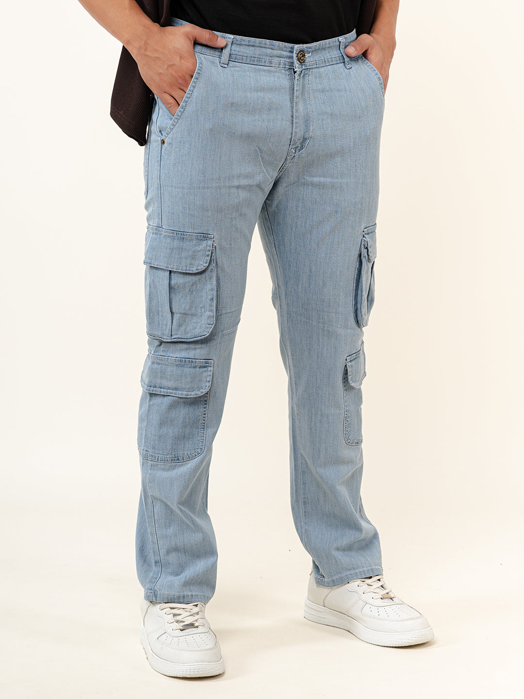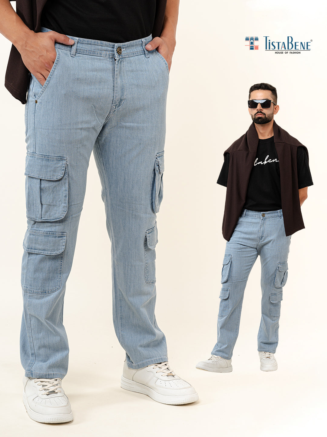 Occasion- Light Blue Cargo Denim Jeans Ideal for day-to-day wear or weekend outings. These cargo denim jeans seamlessly combine comfort and style, ensuring you stand out in various relaxed occasions.