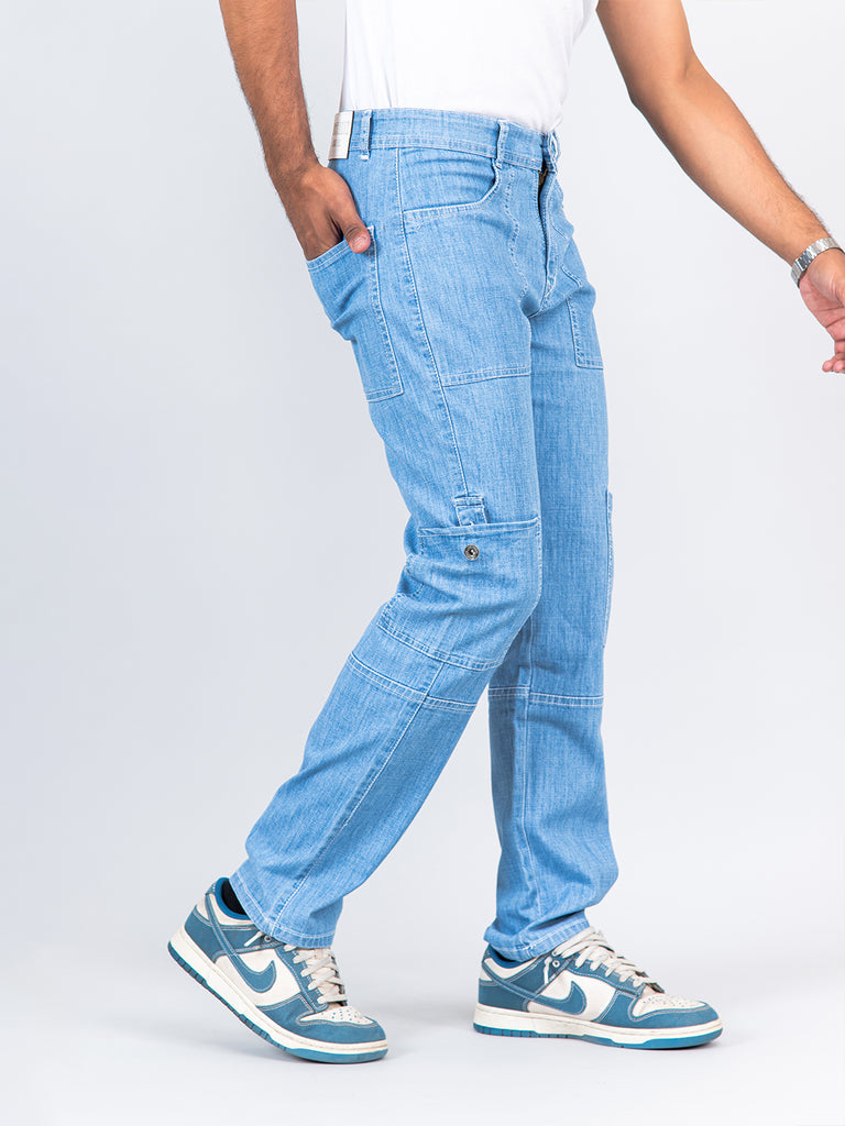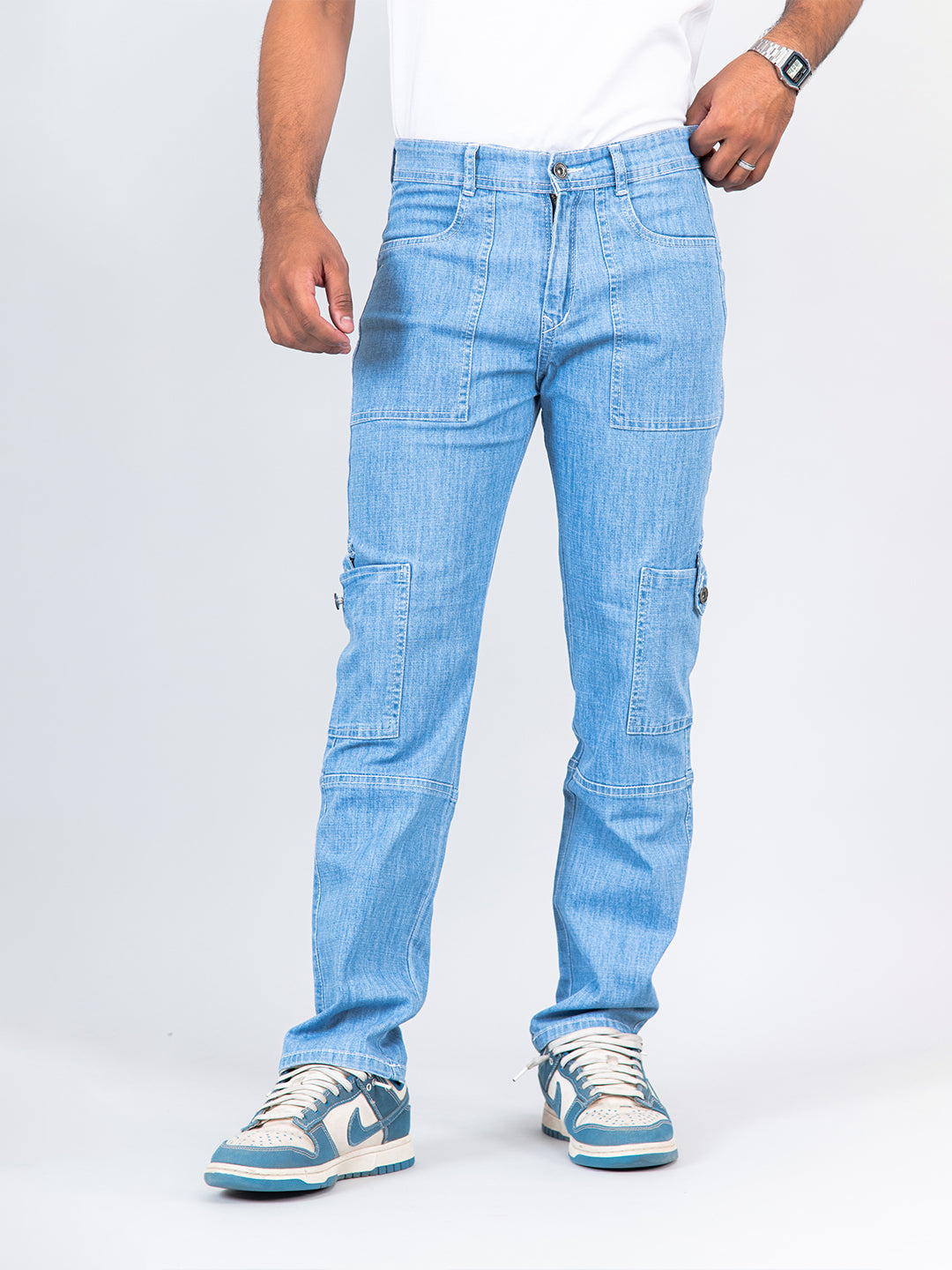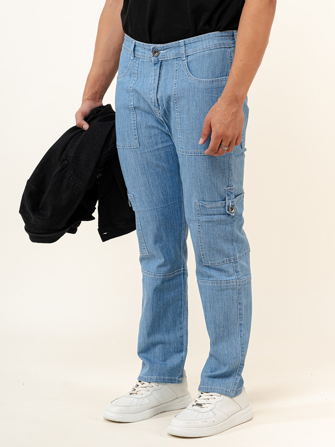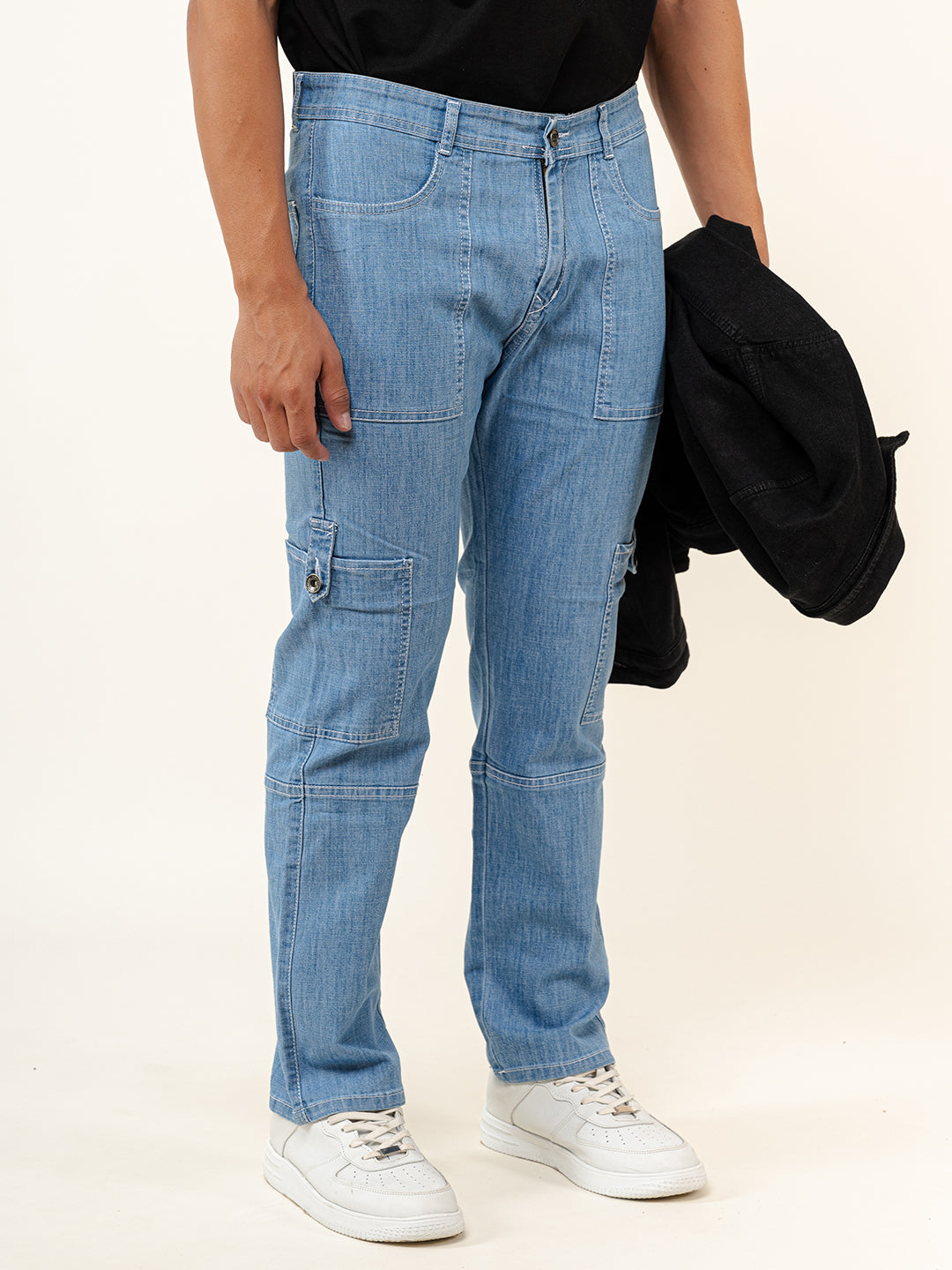 Experience relaxed style with our Light Blue Comfort-Fit Cargo Denim Jeans. Crafted for comfort, these jeans feature cargo pockets for a casual and laid-back look.