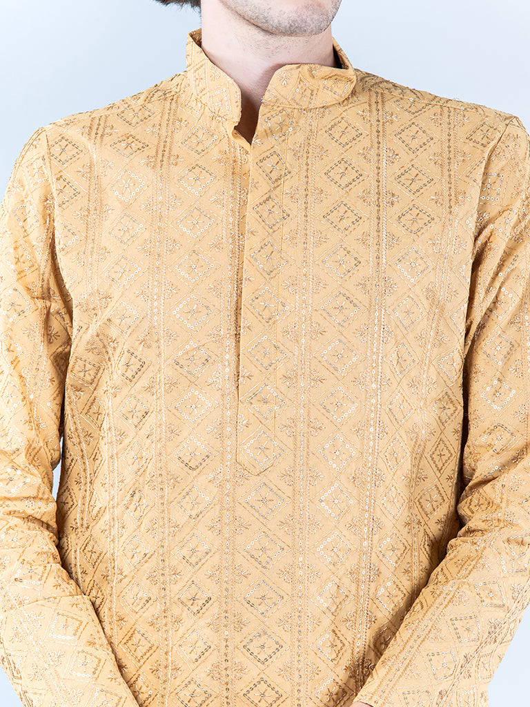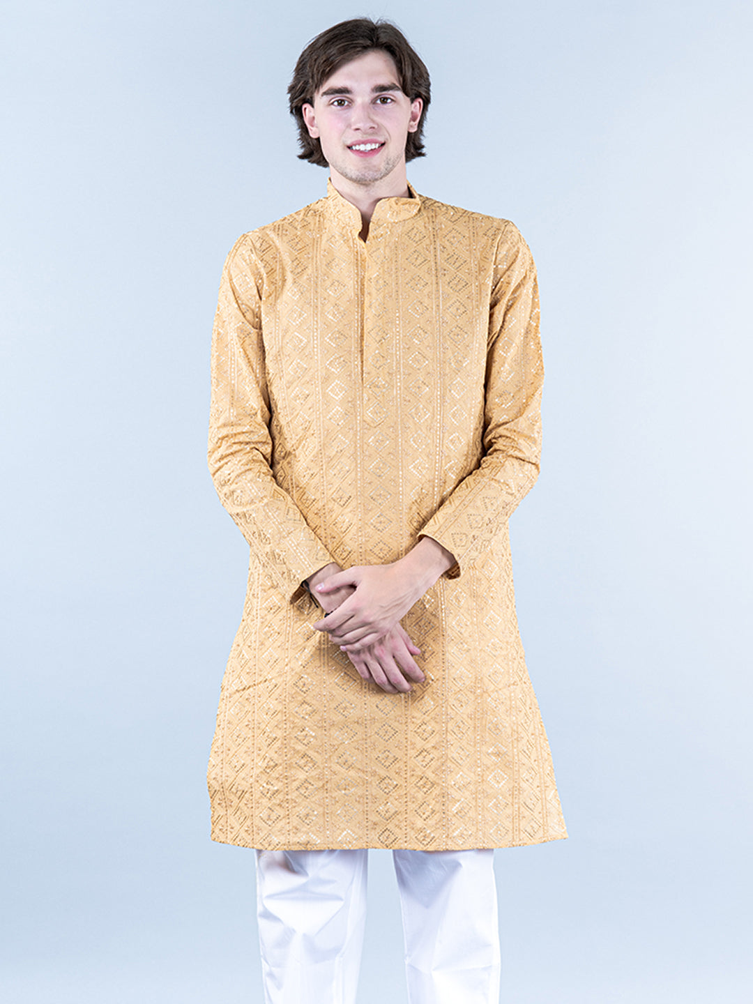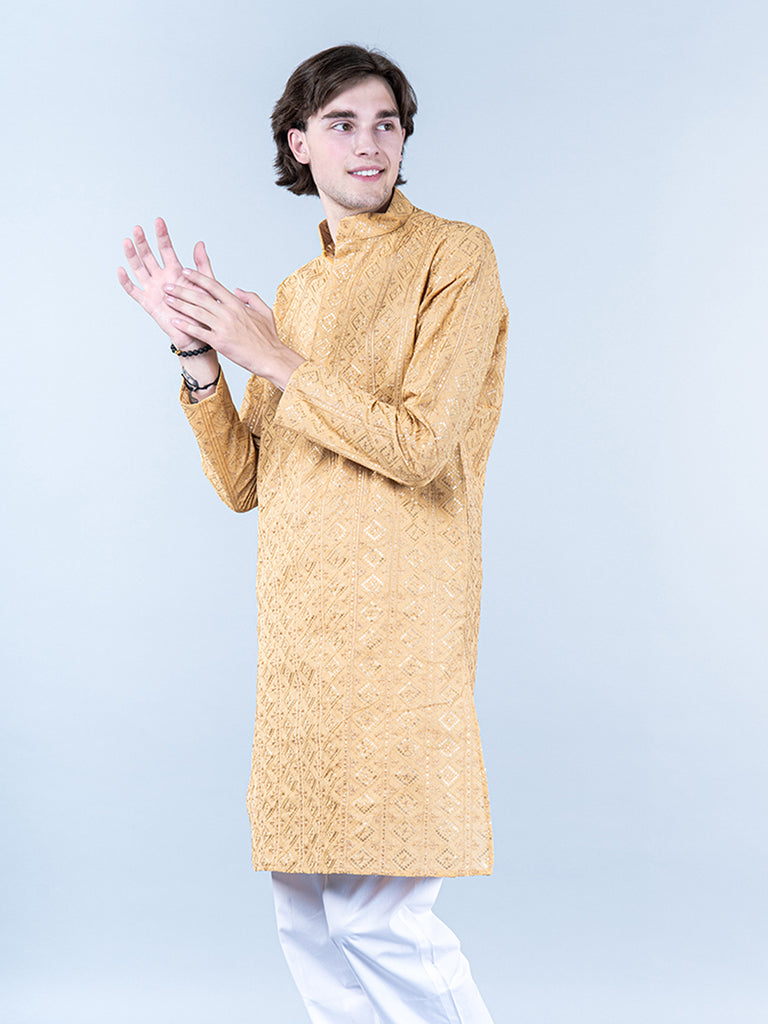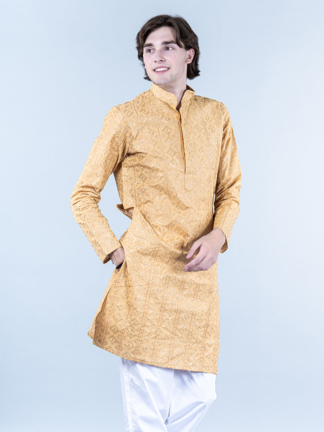 About the product- This Cream Diamond Embroidered Cotton Mens Kurta is lightweight and comfortable. This full-sleeve kurta is all set to take your style to the next level.