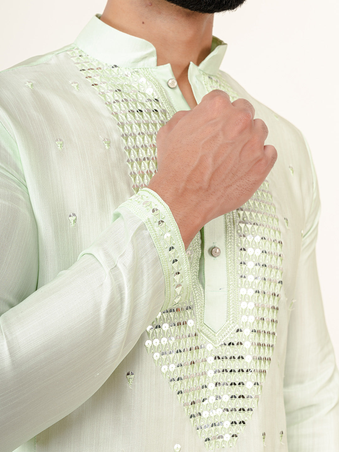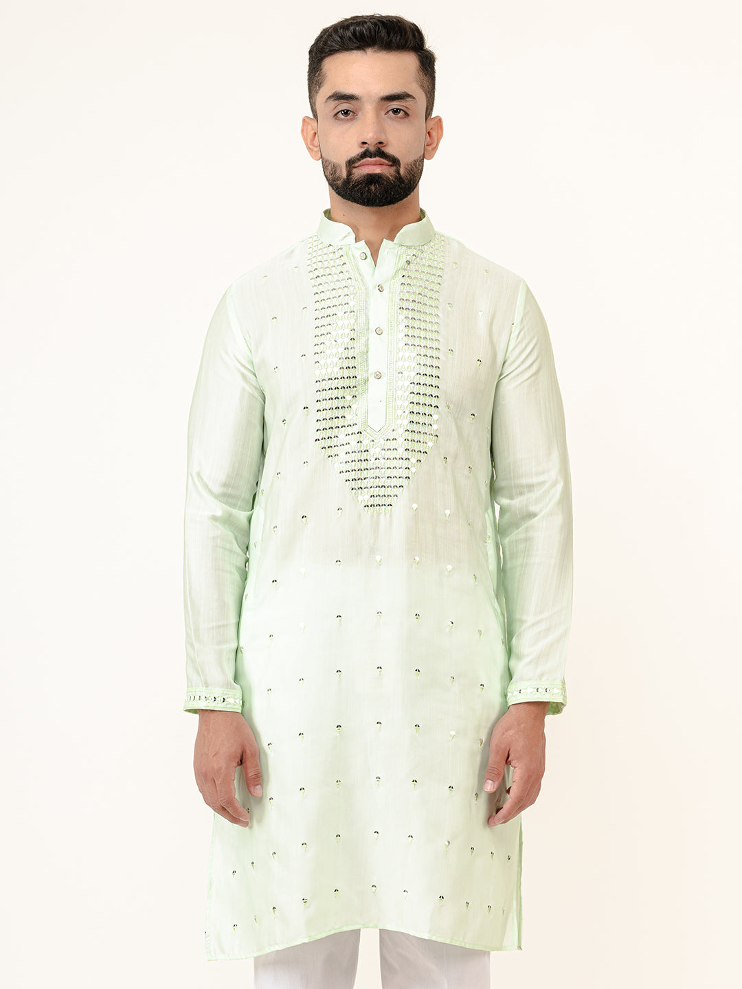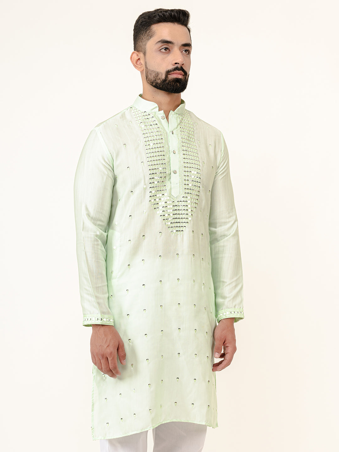 Exude elegance with this mint green sequence-embroidered men's kurta. Featuring intricate detailing on soft, premium fabric, it offers a sophisticated look for festive and formal occasions.