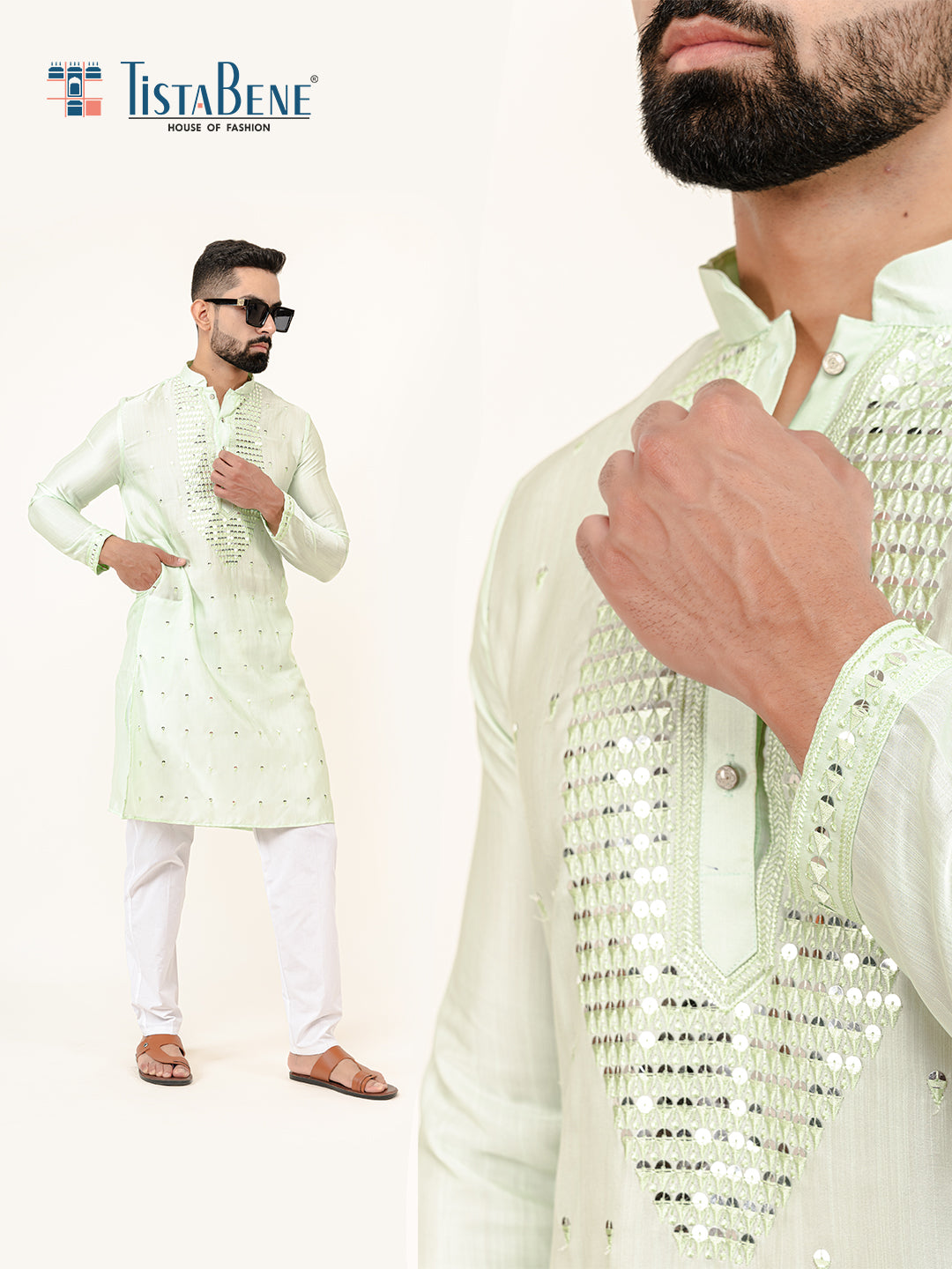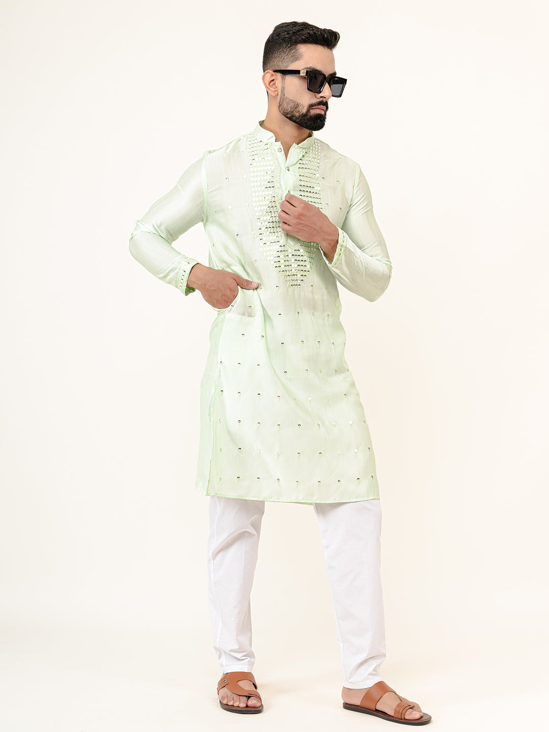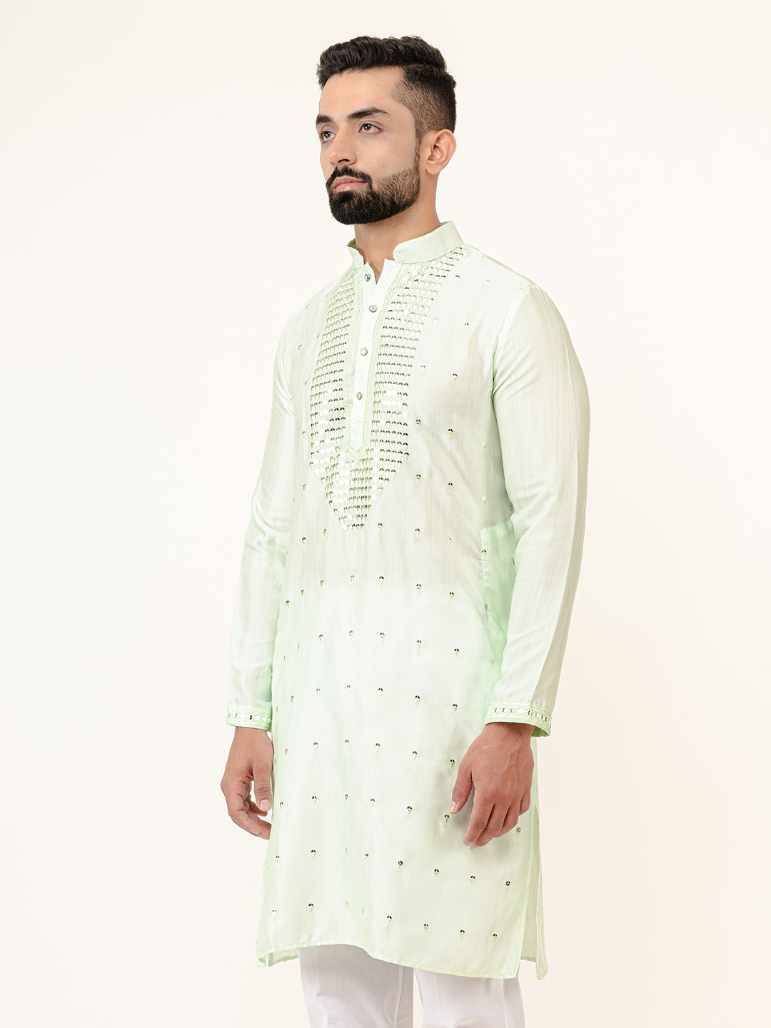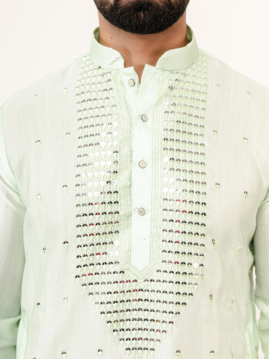 Exude elegance with this mint green sequence-embroidered men's kurta. Featuring intricate detailing on soft, premium fabric, it offers a sophisticated look for festive and formal occasions.