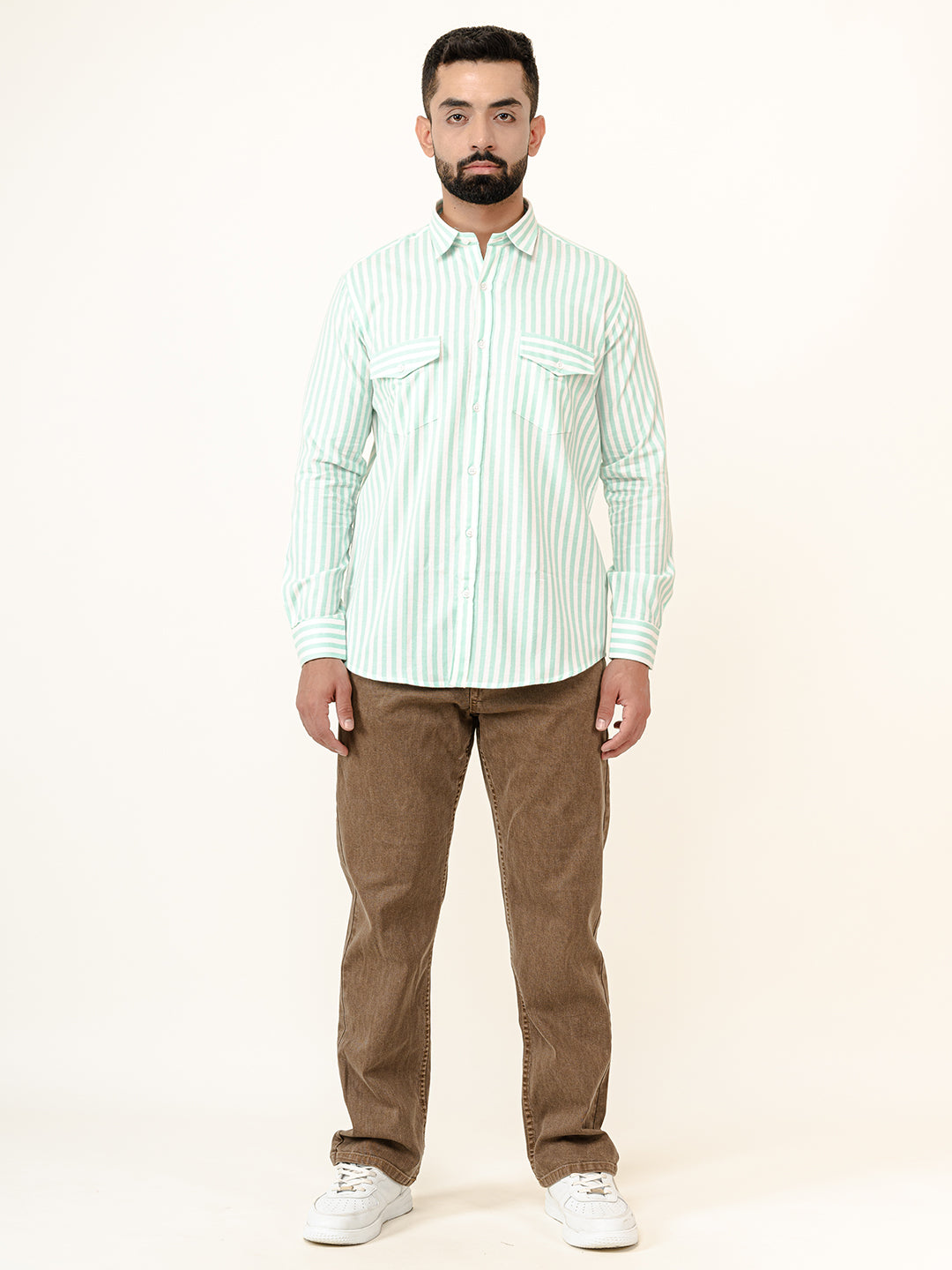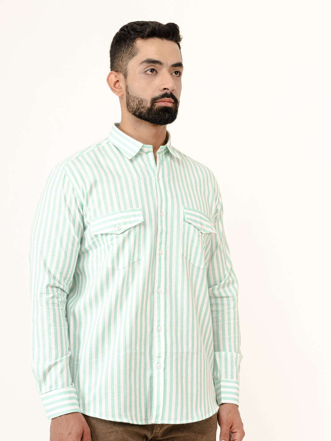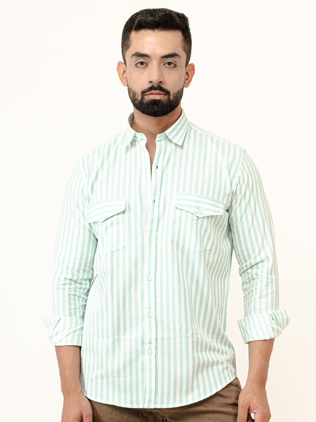About the product- The Mint Green Striped 2 Pockets Full Sleeves Combed Cotton Shirt can help you stand out of the crowd with its pretty unique colour and style statement along with keeping you comfortable.