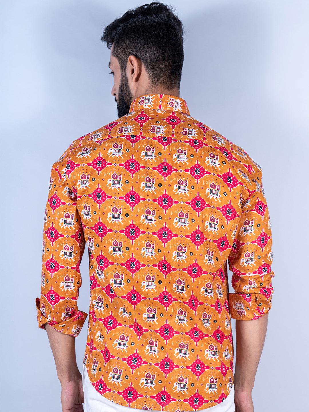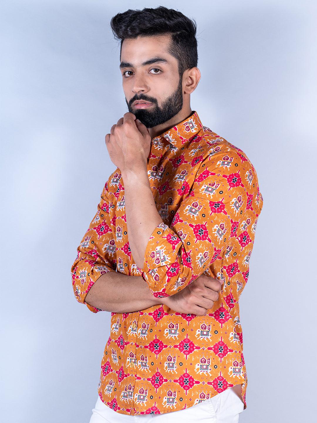 About the product: This mustard elephant ikat printed full sleeves cotton shirt is made to make you look smart. This comfortable shirt is a must inside your wardrobe.