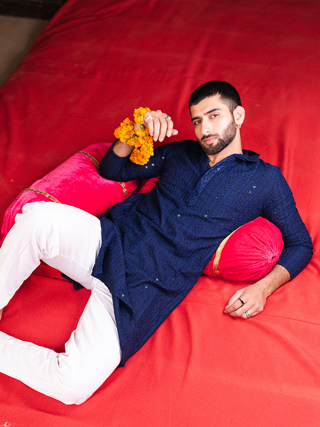 Style Note- The best pair for bright coloured kurtas like the Navy Blue Chikankari Emrboidered kurta is plain white pyjama!