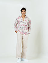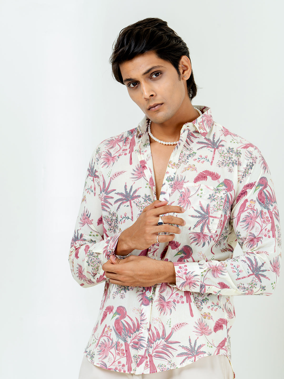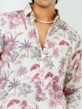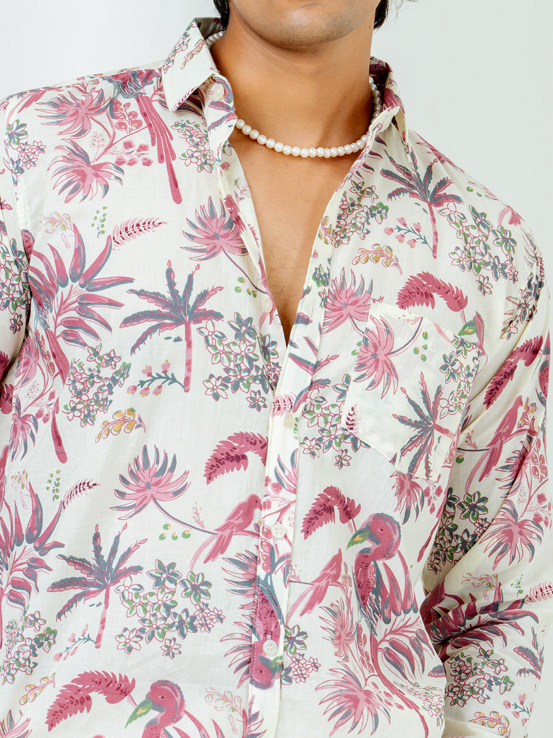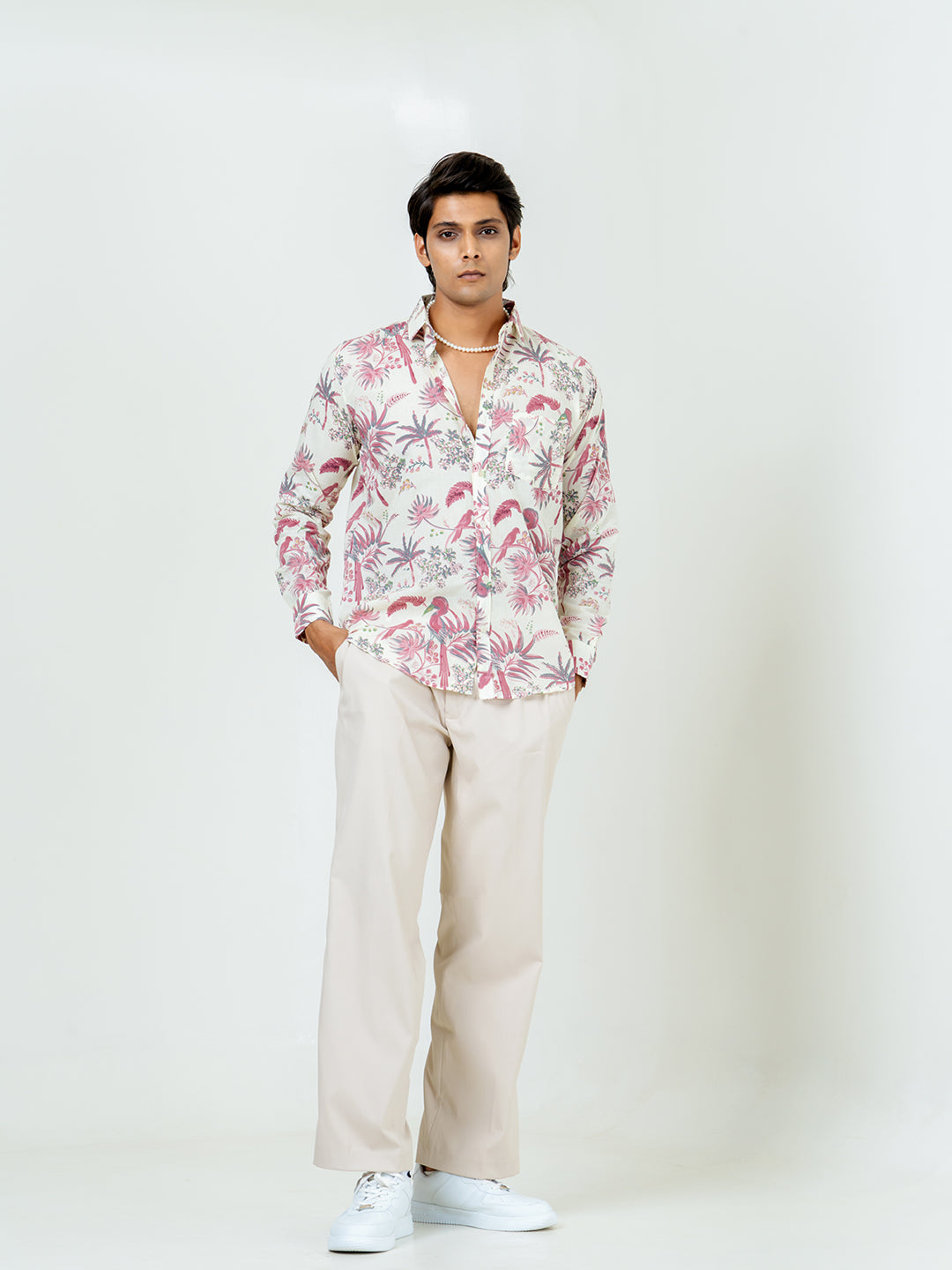 This off-white shirt features tree and leaf Sanganeri prints, perfect for those who appreciate traditional art. The cotton fabric is lightweight and breathable, offering comfort with style.