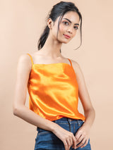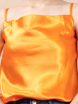 Introducing our Orange Cowl Neck Cami Top, crafted from a luxurious soft satin fabric. This sleeveless design offers a stylish and comfortable addition to your wardrobe. The vibrant orange color adds a pop of brightness to your look, making it a versatile piece for various occasions.