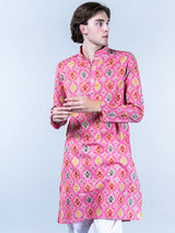 About the product- This Pink Block Printed Mens Cotton Kurta is lightweight and comfortable. This full-sleeve kurta is all set to take your style to the next level.