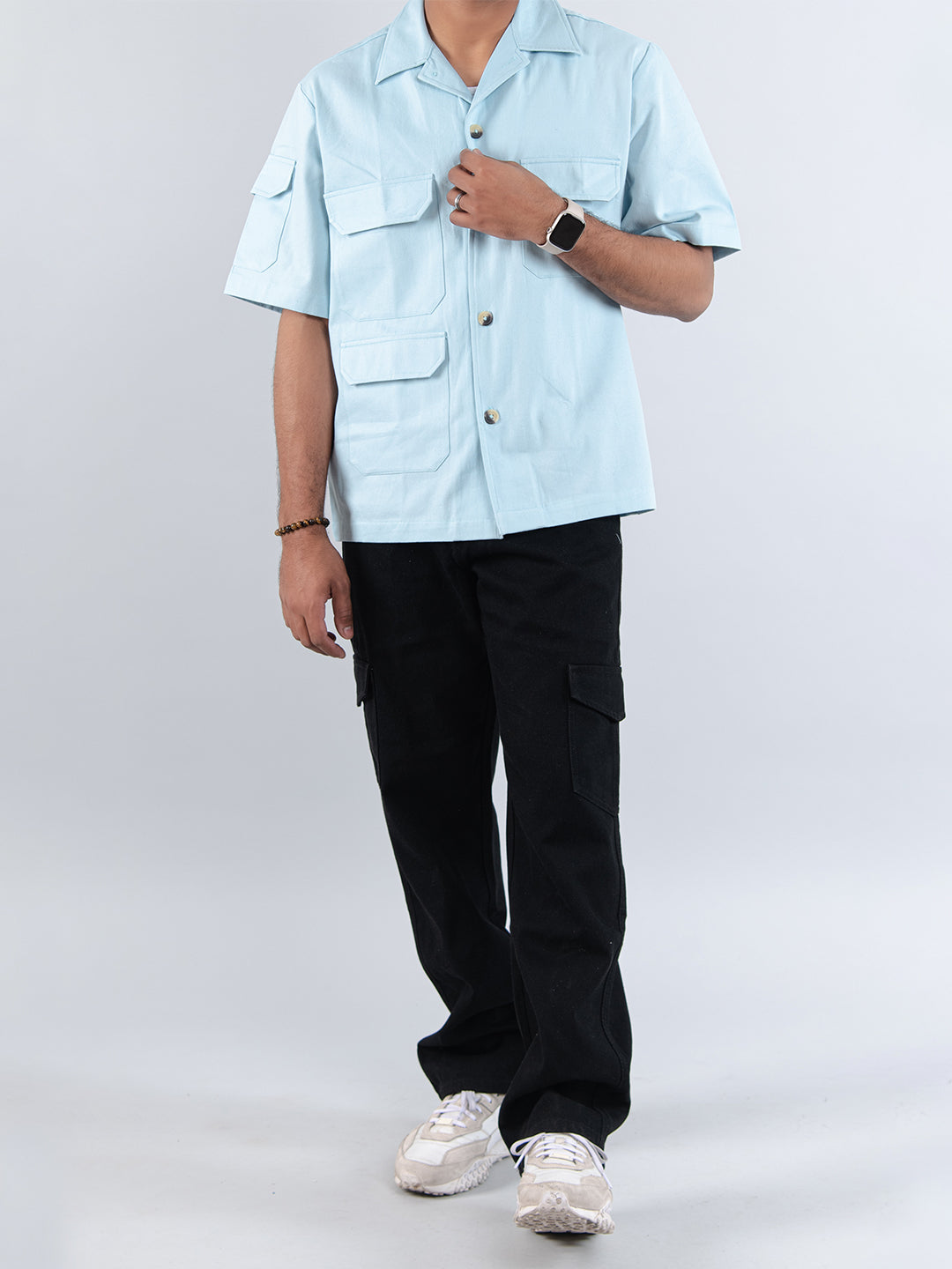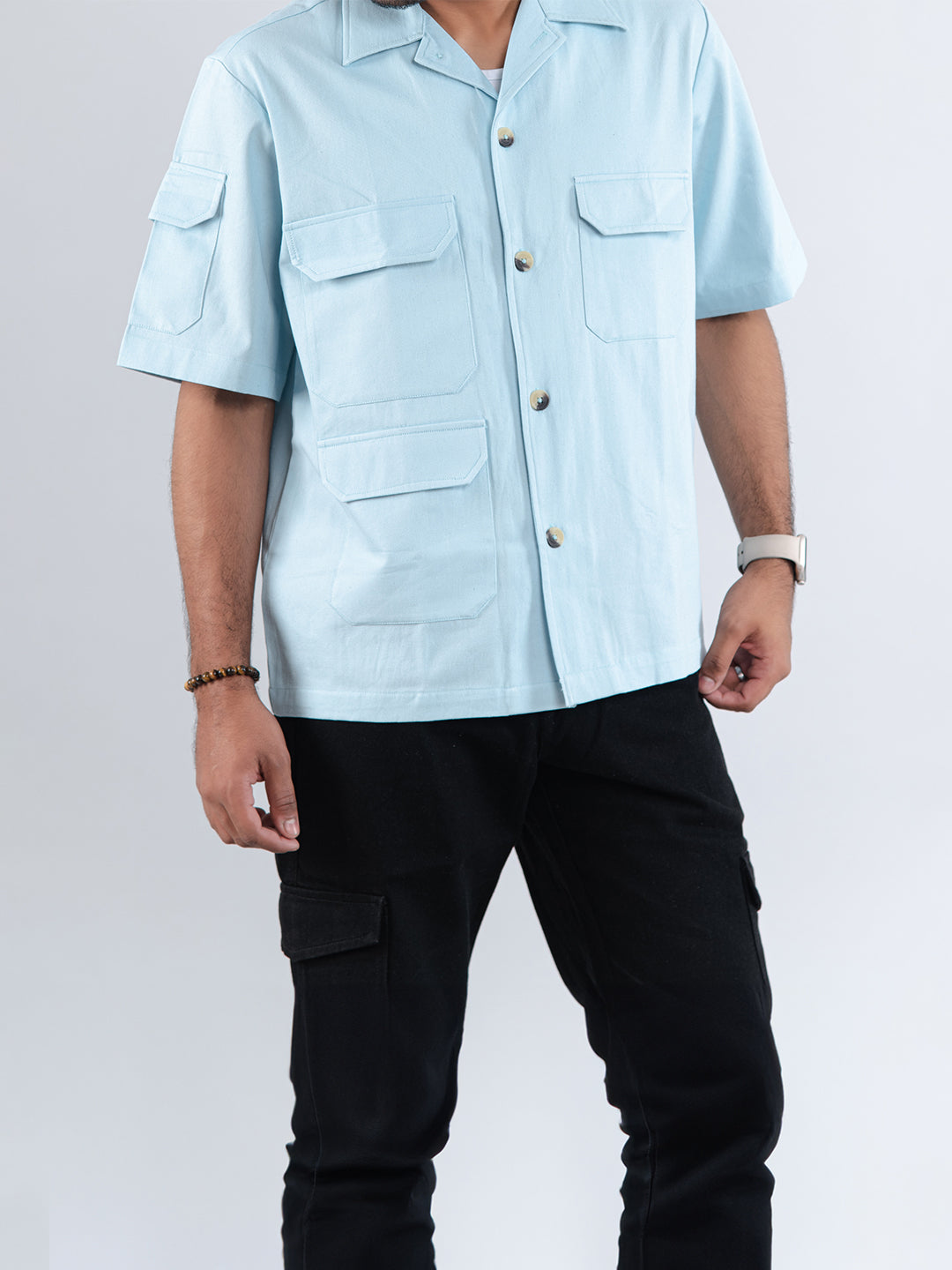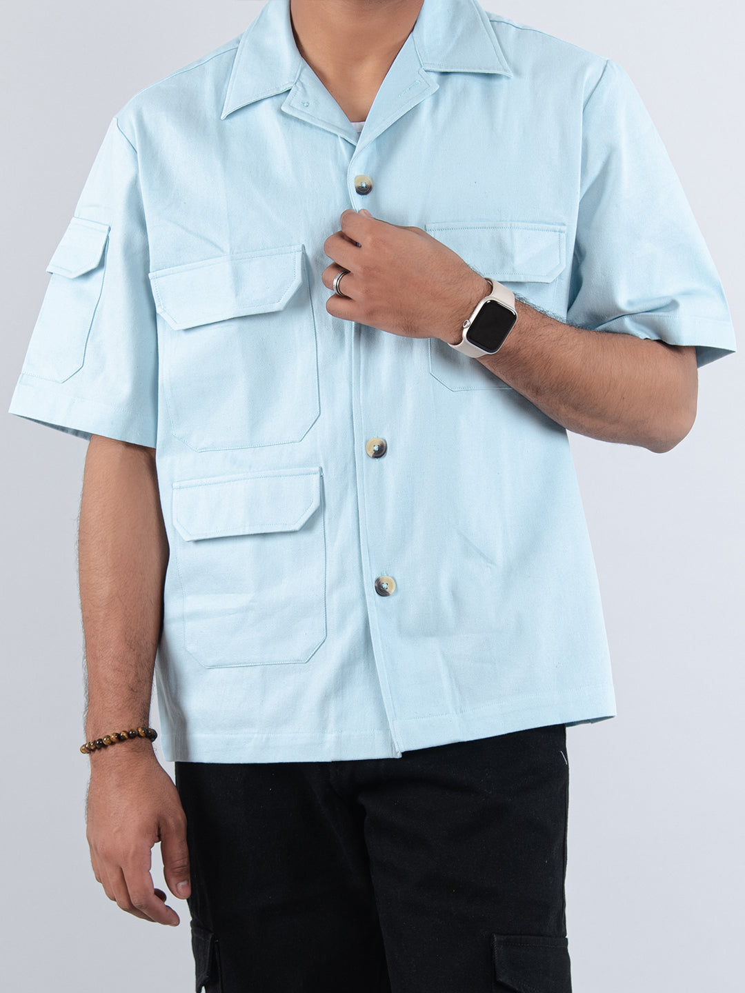 Powder Blue 4 Pockets Oversized Twill Cotton Half Sleeves Shirt