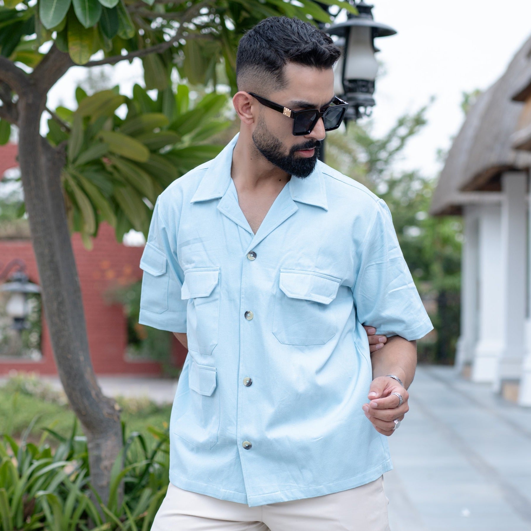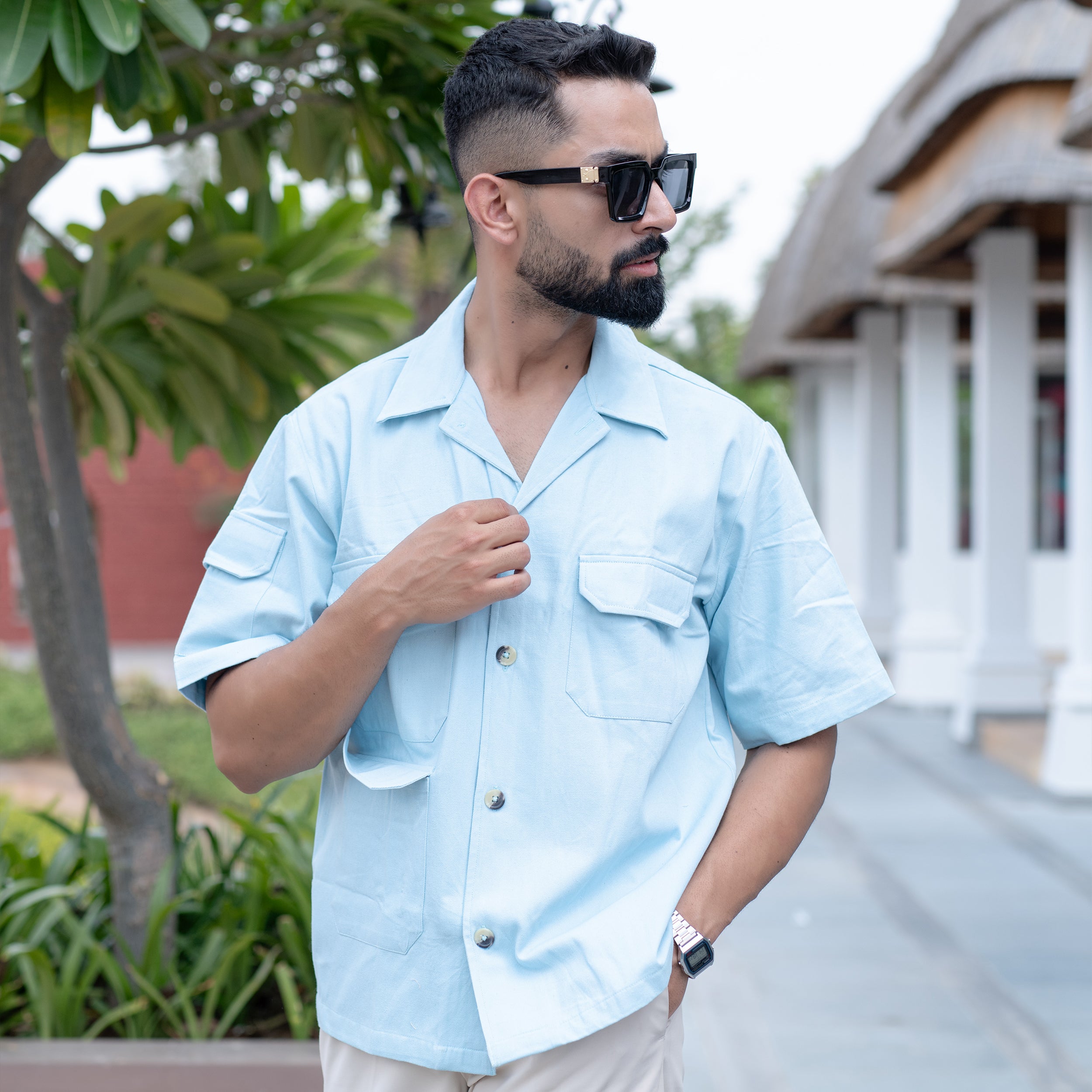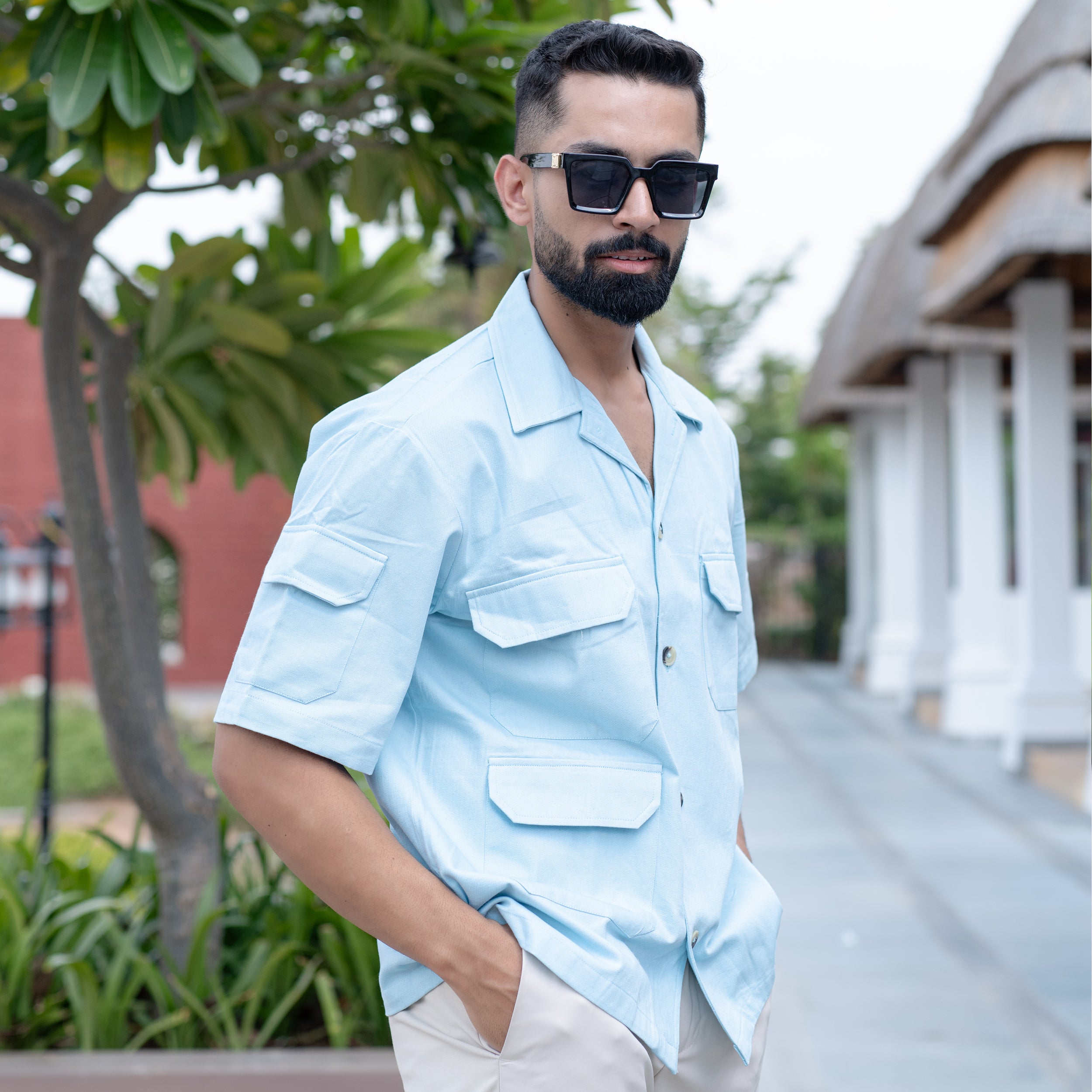 Powder Blue 4 Pockets Oversized Twill Cotton Half Sleeves Shirt
