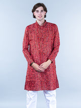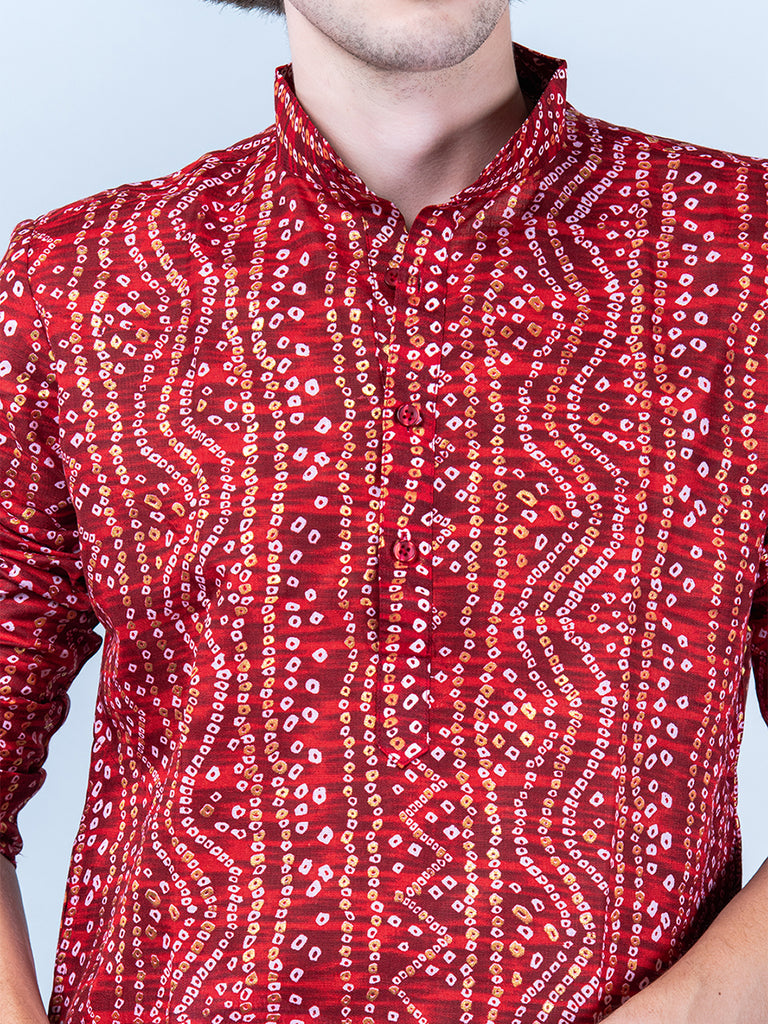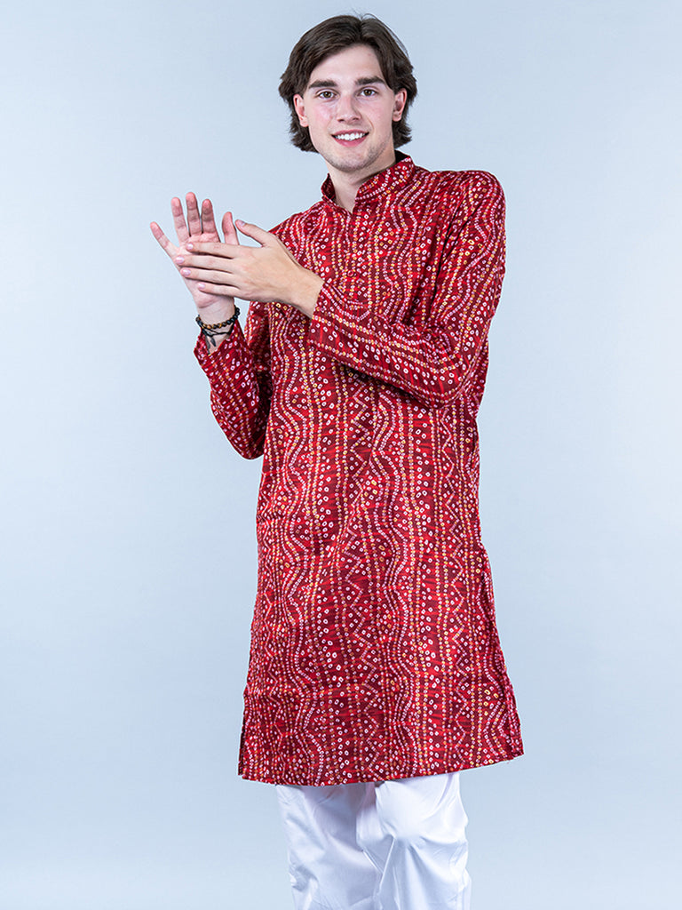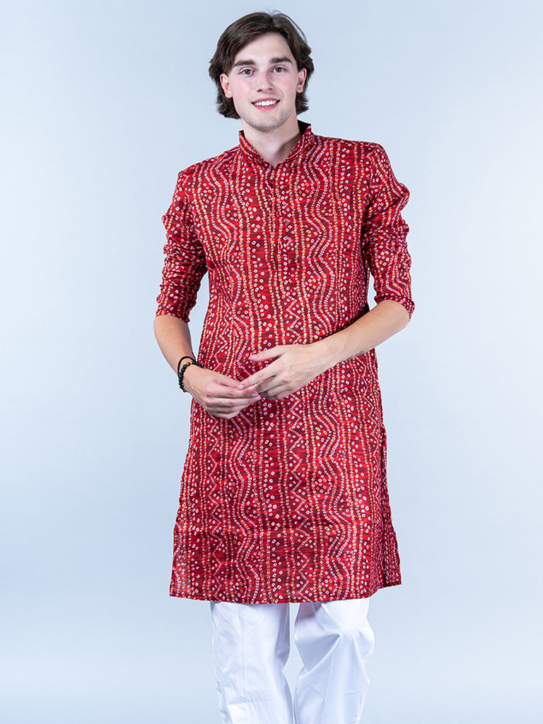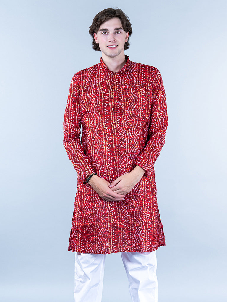 About the product- This Red Bandhani Printed Mens Cotton Kurta is lightweight and comfortable. This full-sleeve kurta is all set to take your style to the next level.