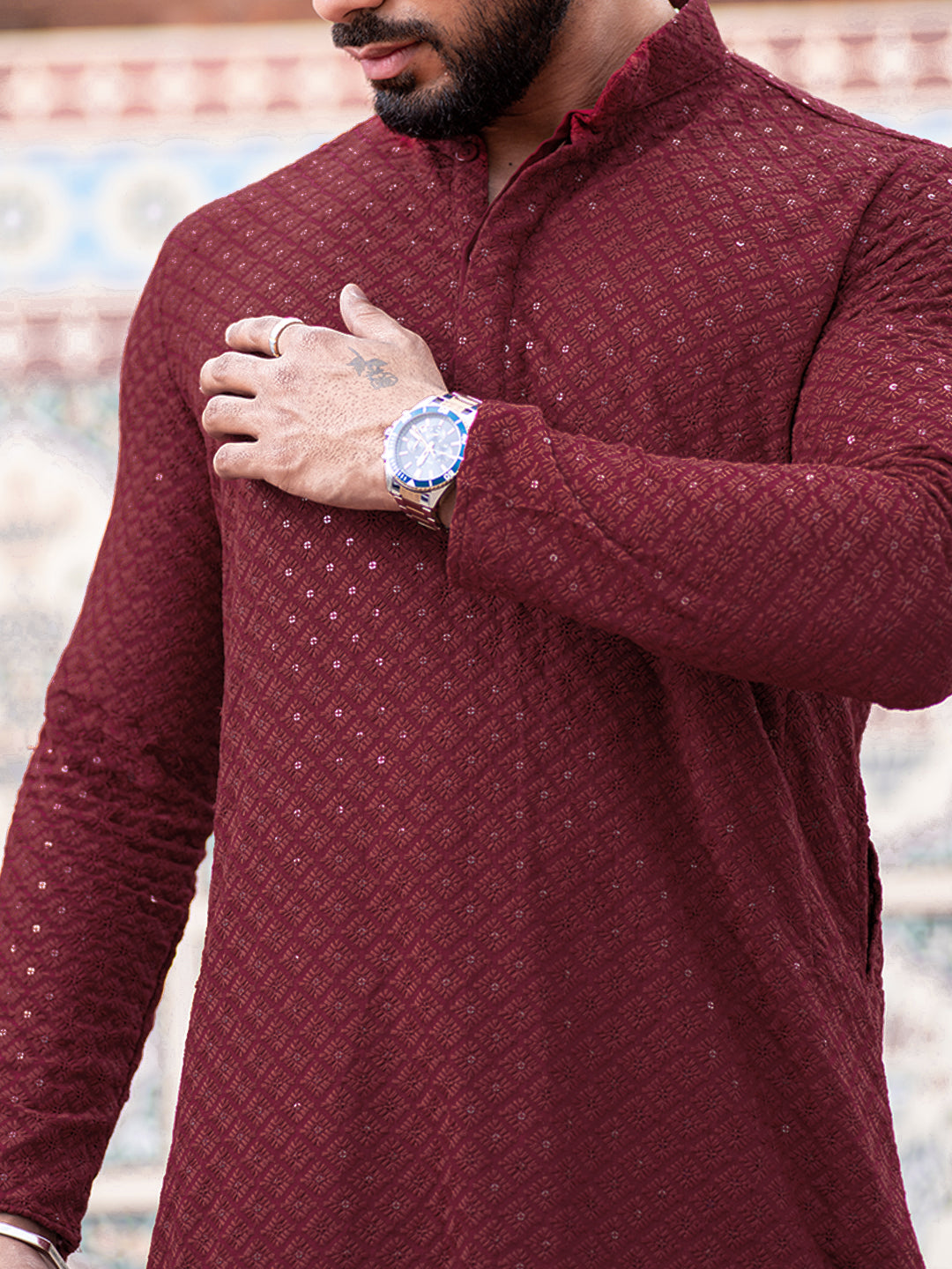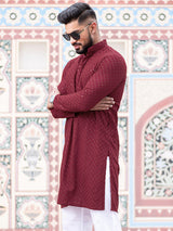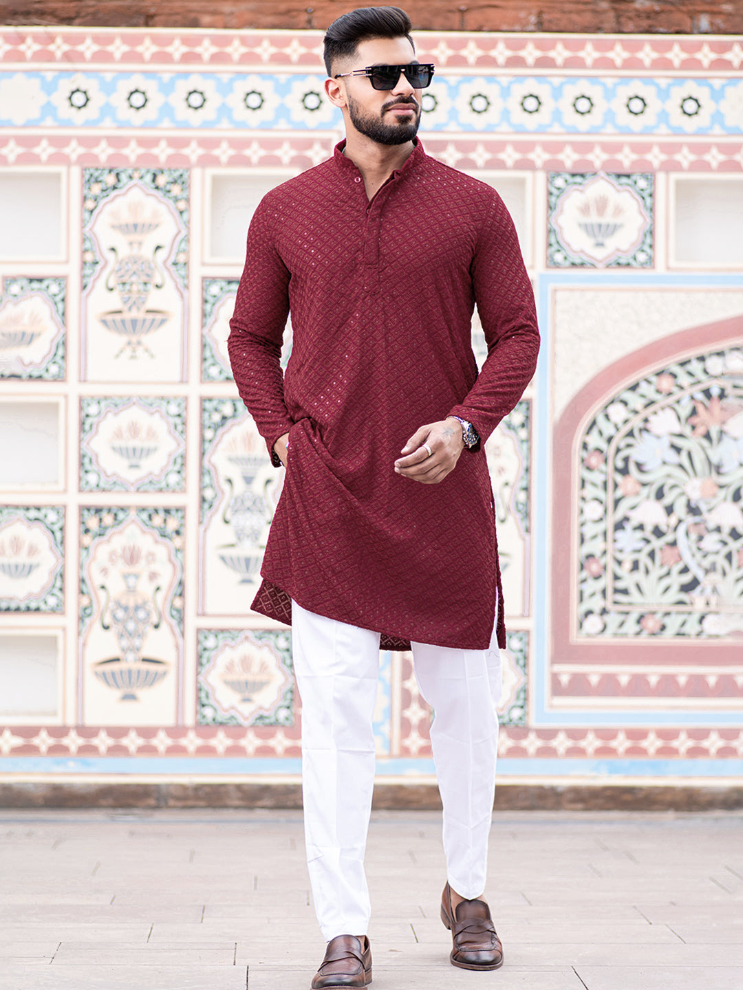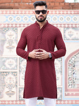 About the product- This Red Floral Embroidered Cotton Mens Kurta is lightweight and comfortable. This full sleeve kurta is all set to take your style to the next level.