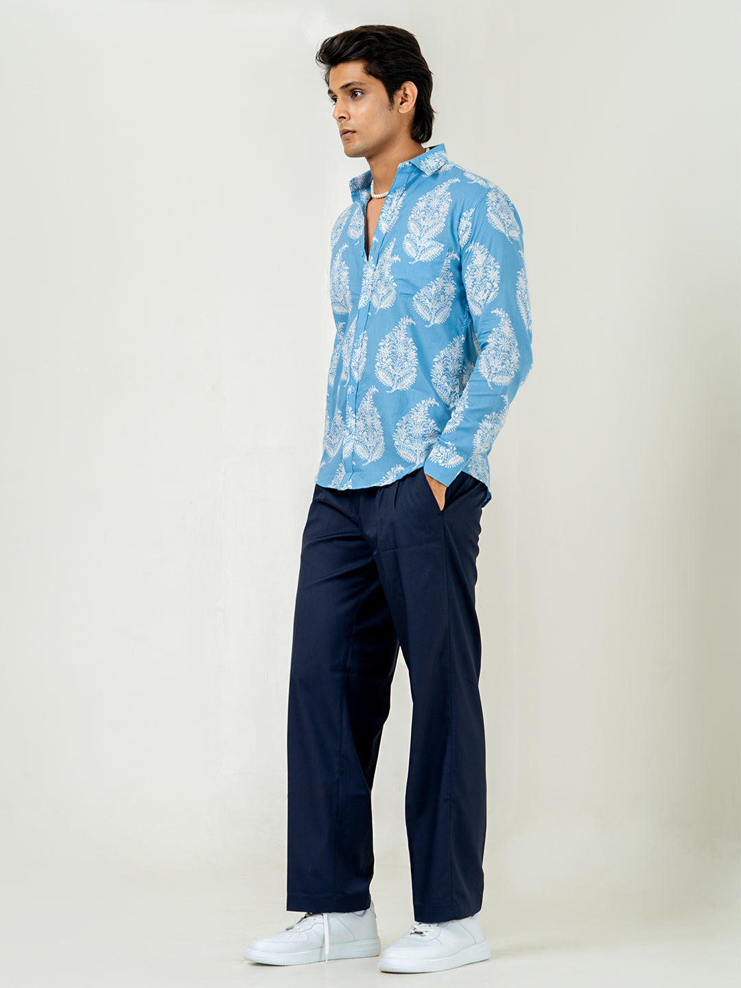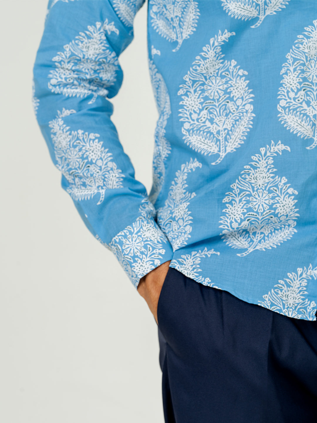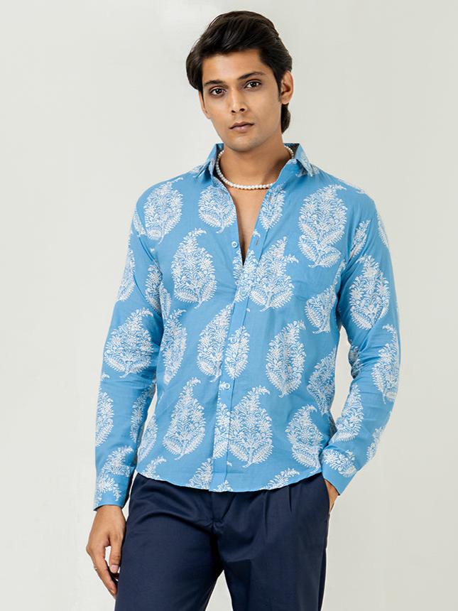 This sky blue shirt with floral Sanganeri prints brings a touch of traditional art with modern style. The cotton fabric ensures comfort, while the Sanganeri print adds a rich, cultural feel.