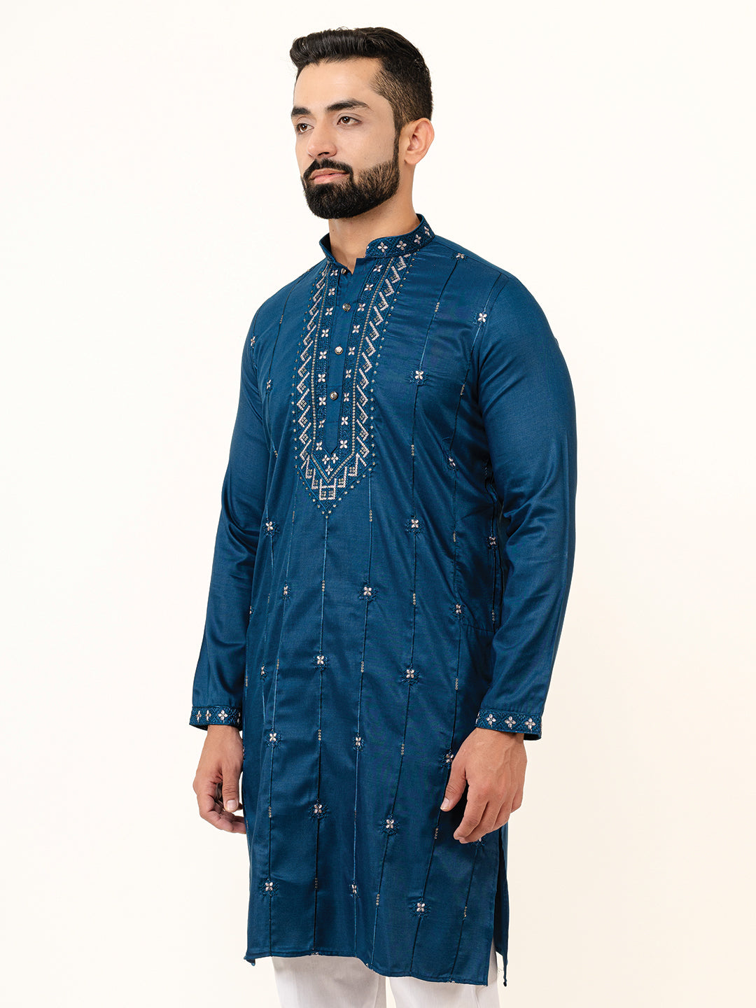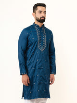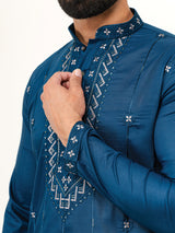 Add a touch of royalty to your wardrobe with this Teal Blue Ethnic Straight Kurta. Made from premium silk, it features intricate embroidery on the yoke and cuffs, elevating your traditional style. Perfect for festive gatherings and special occasions, it promises both comfort and elegance.