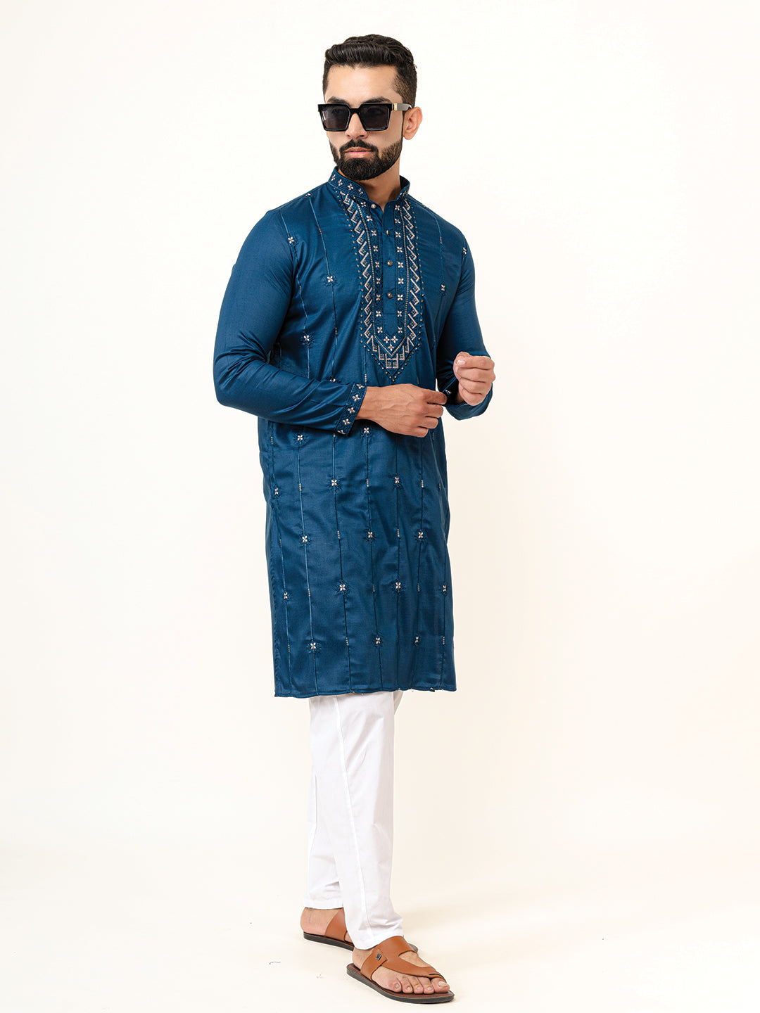 Pair this kurta with off-white or golden churidar for a complete ethnic look. Add mojris or traditional leather sandals, and accessorize with a sleek wristwatch or a brooch for added charm.