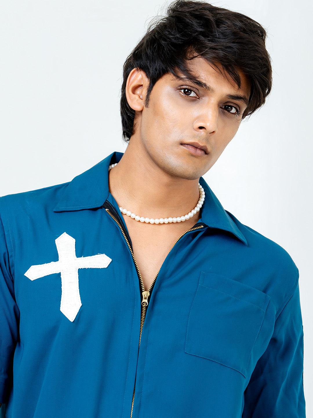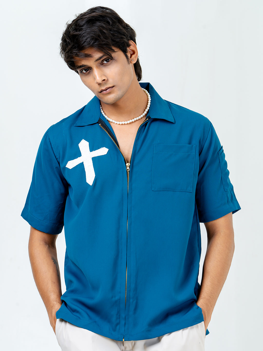 The Teal Blue Poly Crepe Zipper Oversized Shirt combines comfort and style effortlessly. Its oversized fit and functional zipper detail make it a versatile and chic wardrobe staple.