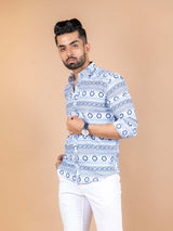 About Product- White and Blue graphic printed Cotton Shirt designed with a full pattern to give you a bright and quirky look.