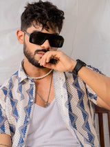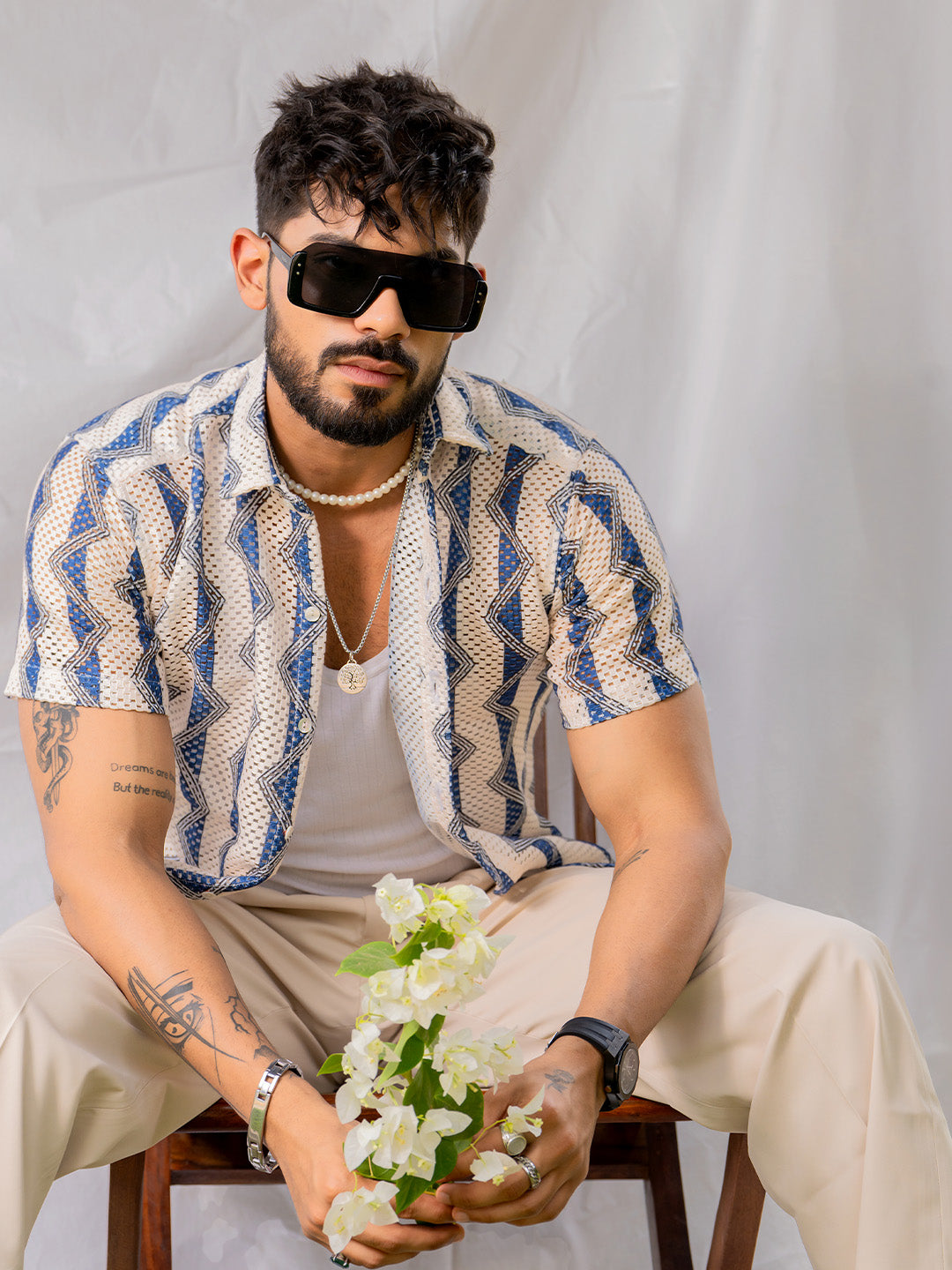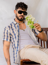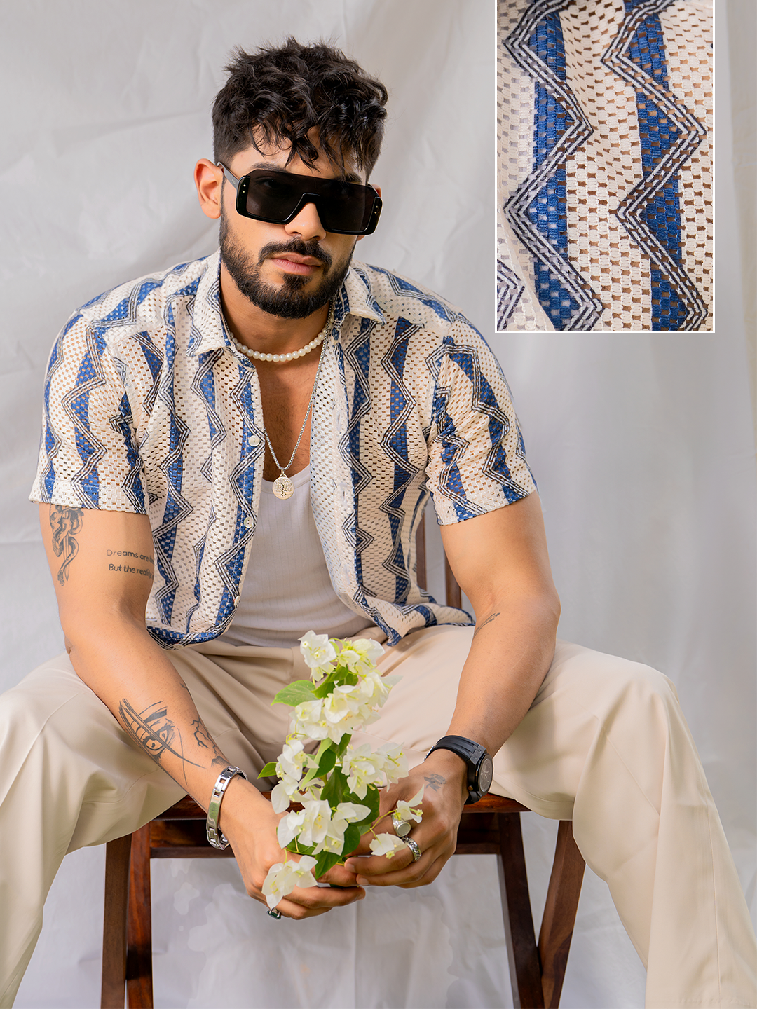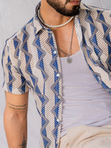 Discover elegance and comfort with White Blue Zig Zag Half Sleeve Crochet Shirt. This unique piece combines timeless crochet craftsmanship with a modern hue, perfect for any stylish wardrobe.