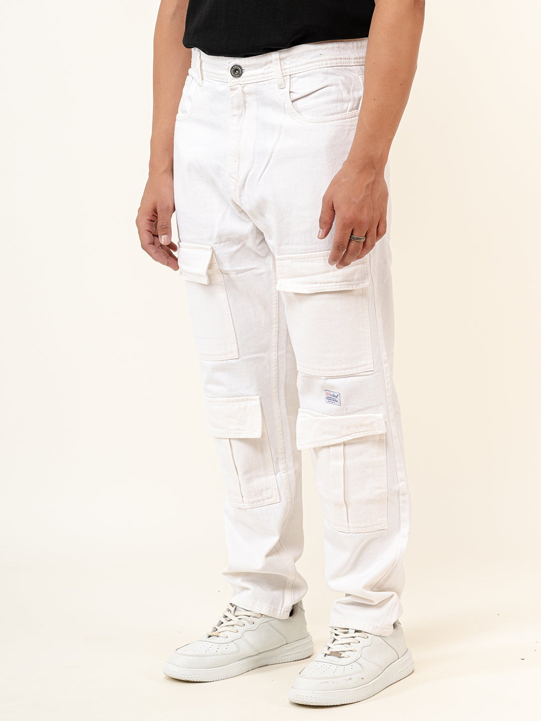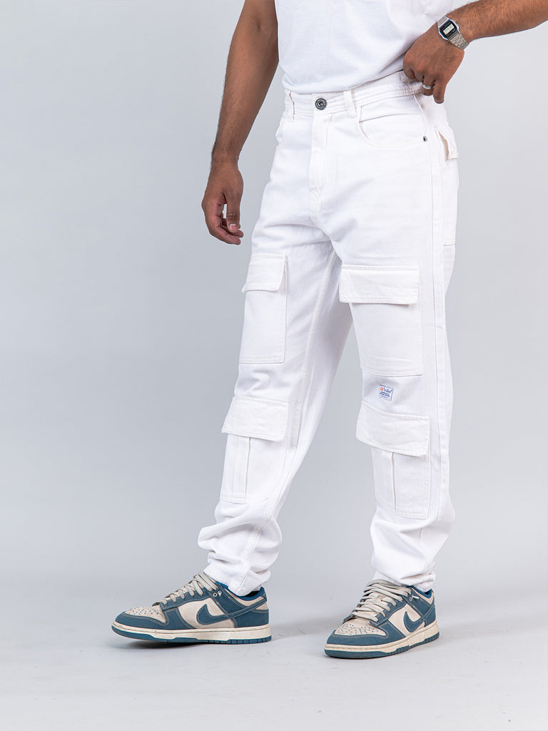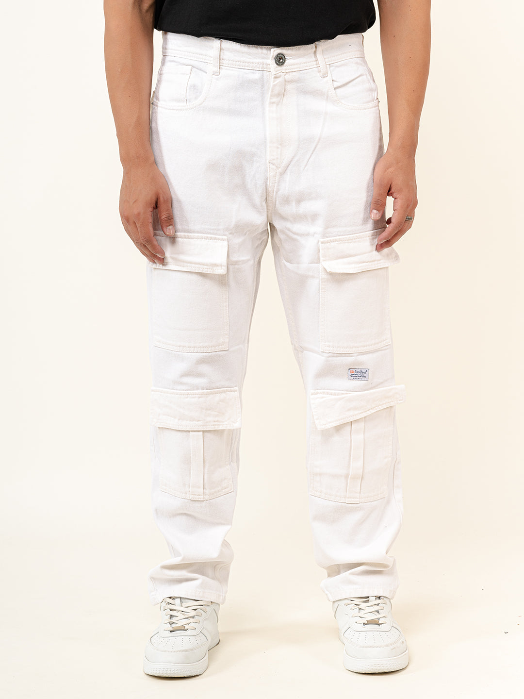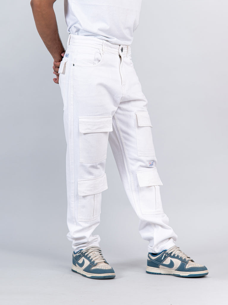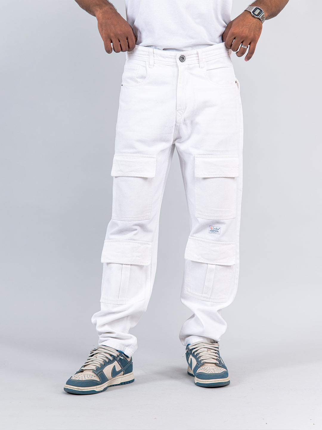 Our White Cargo Baggy Fit Denim Jeans will elevate your look. A stylish yet practical piece of modern essentials with cargo pockets for added comfort.