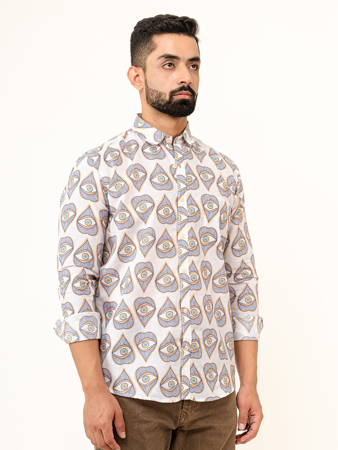 Style note - Lot of printed shirts' designs invented and this is one of them which has peculier effects because it is made for every one. Evil Eye White Printed Shirt is the new invention as per the demand that gives you a sobber look when you wear it with loose joggers. Don't forget to wear white sneakers
